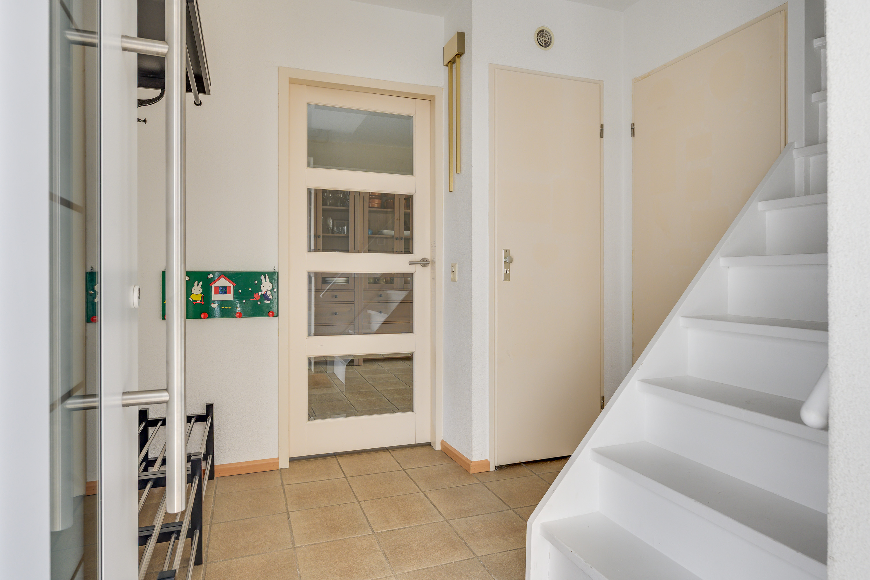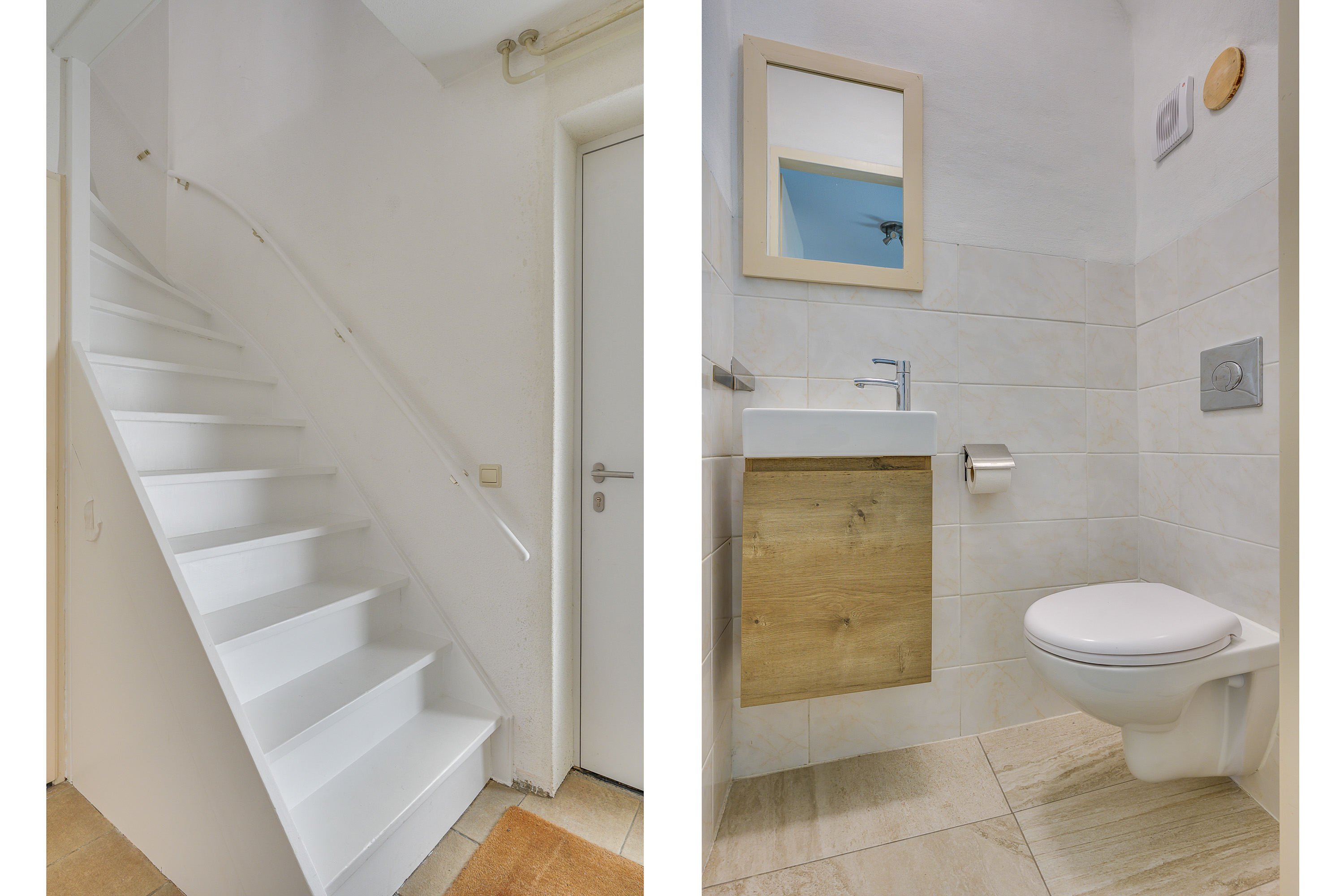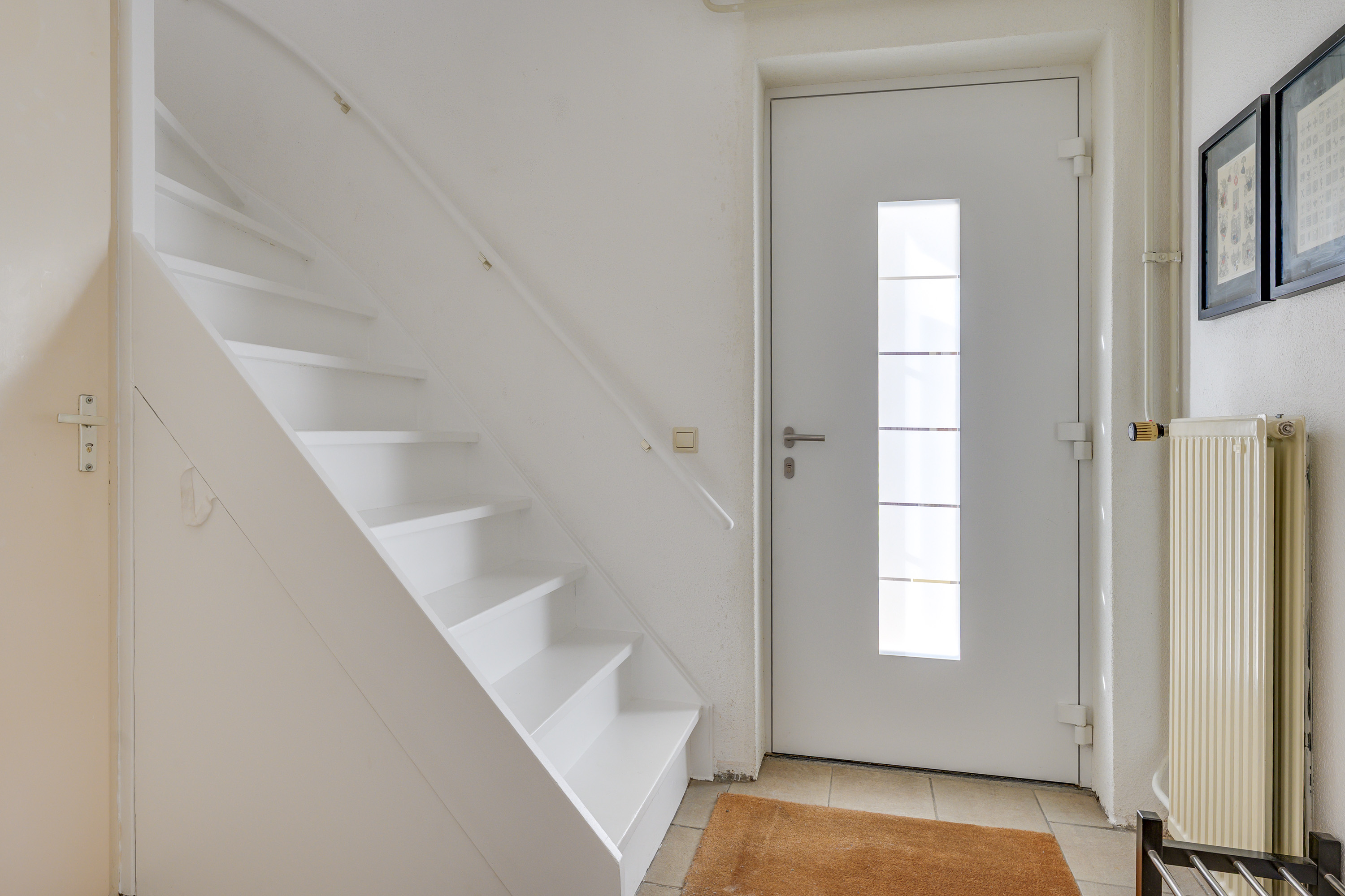 Via de entree betreedt u de brede hal, voorzien van een nette tegelvloer en vloerverwarming die is doorgelegd over het grootste deel van de begane grond (hal, living, open keuken). In de hal bevindt zich de meterkast (voorzien van slimme meters) en de trapopgang met bergingsruimte hieronder. De toiletruimte is in 2025 vernieuwd en uitgevoerd in een moderne stijl. Voorzien van een wandcloset, fontein en mechanische ventilatie.