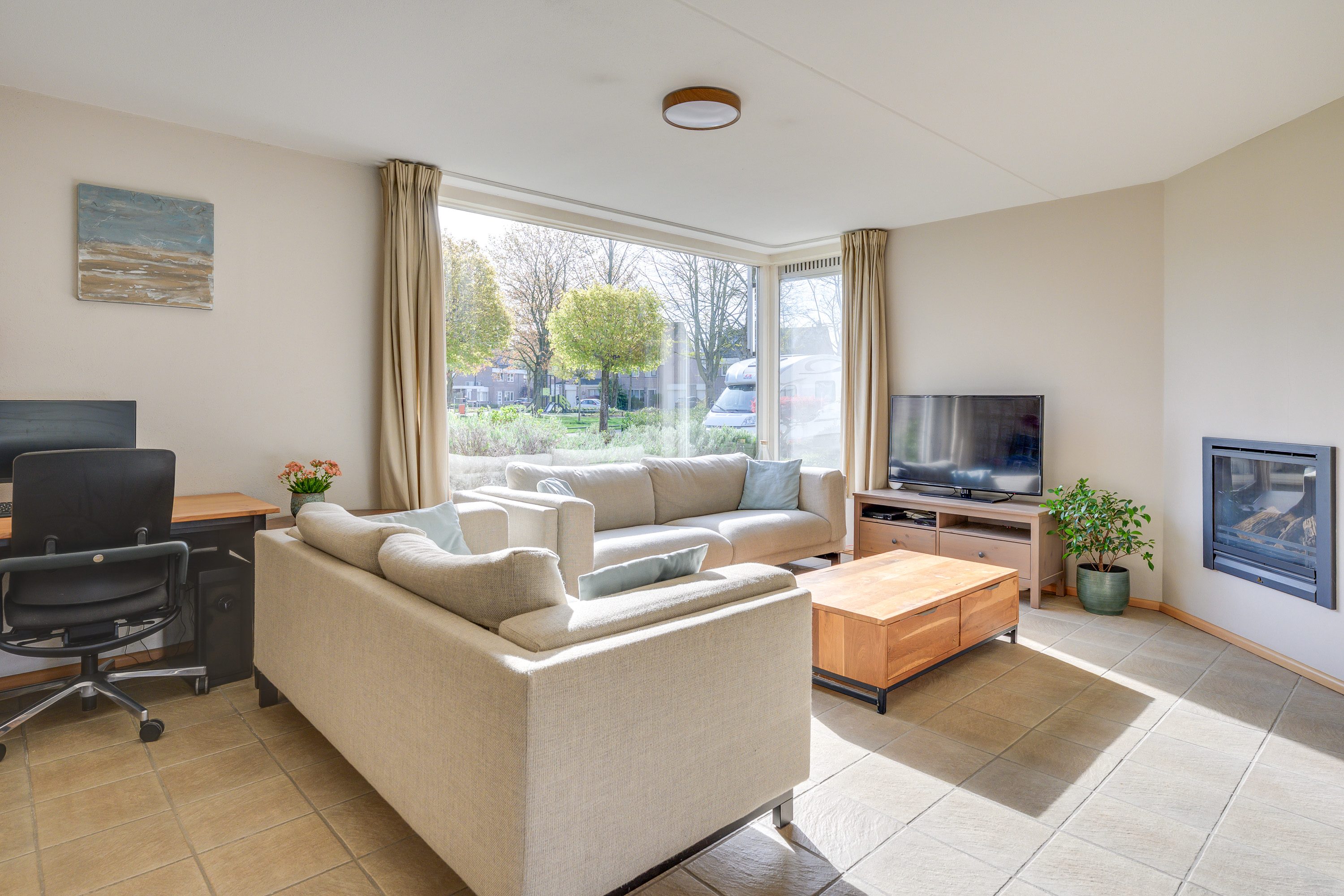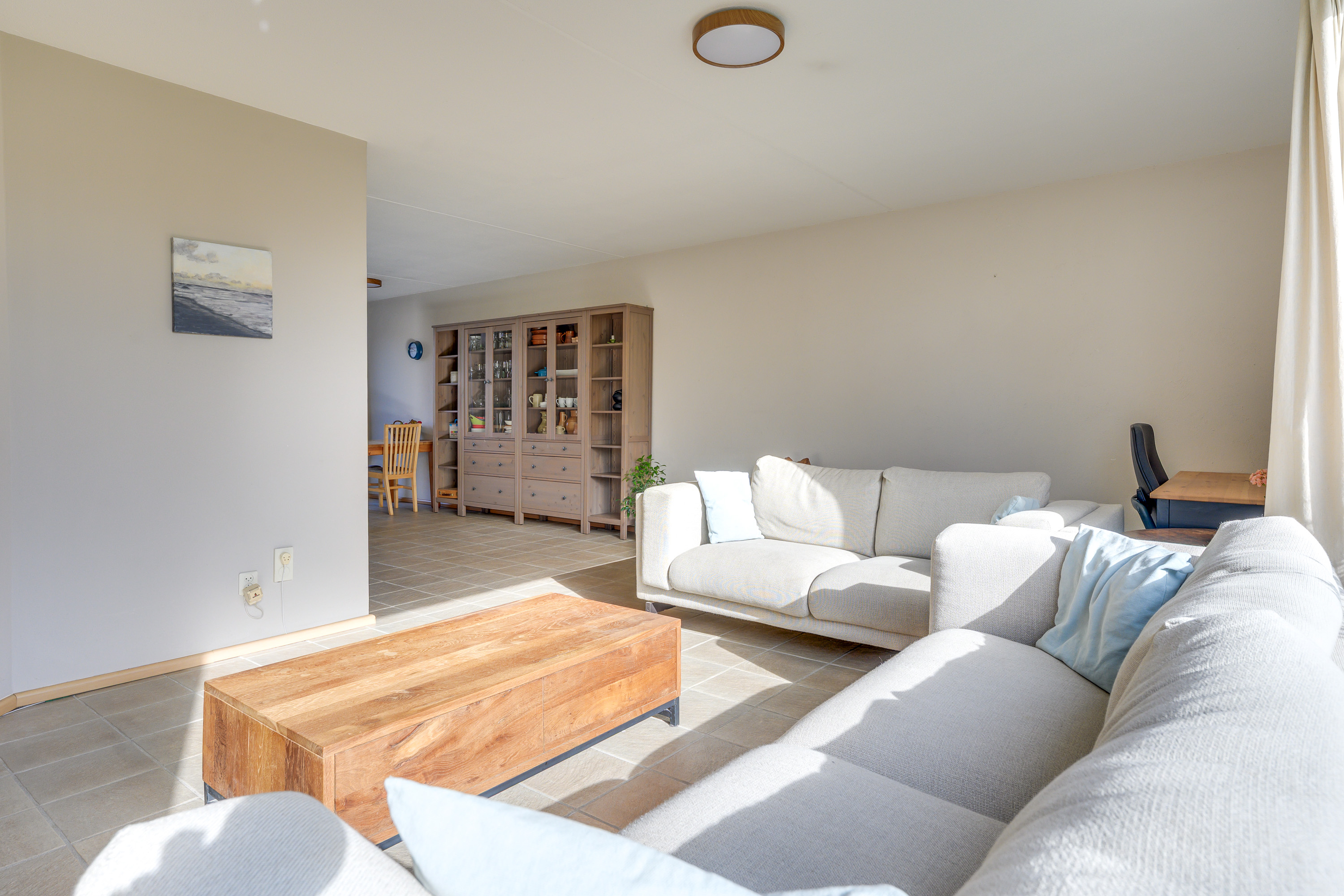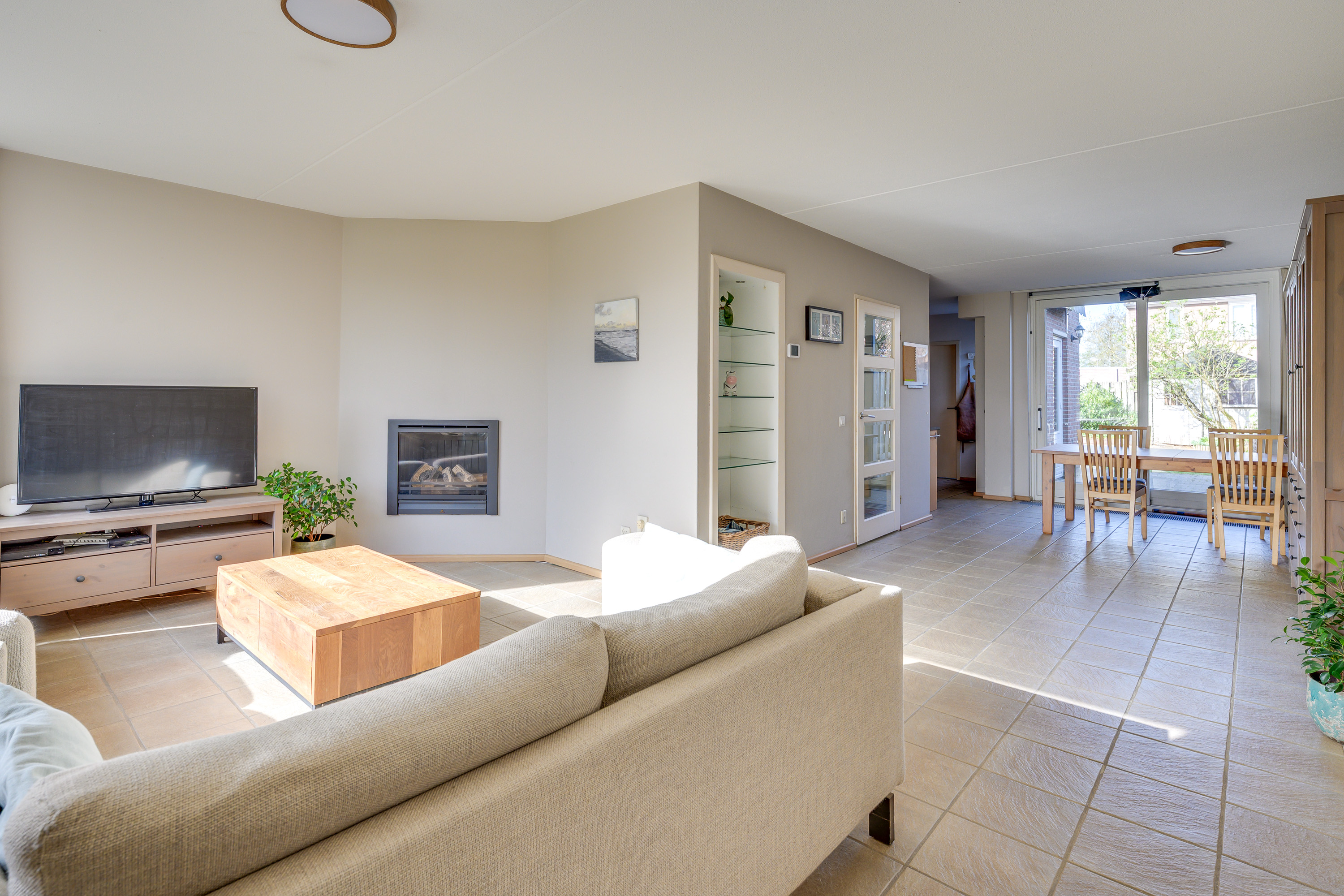 De ruime L-vormige living is opgedeeld in een sfeervol zit- en eetgedeelte. Aan de voorzijde bevindt zich het zitgedeelte met een groot raampartij wat zorgt voor een heerlijk, vrij uitzicht over het grote grasveld. De gashaard zorgt voor extra warmte en sfeer. Tevens is er een handmatig bedienbare zonluifel aanwezig.
