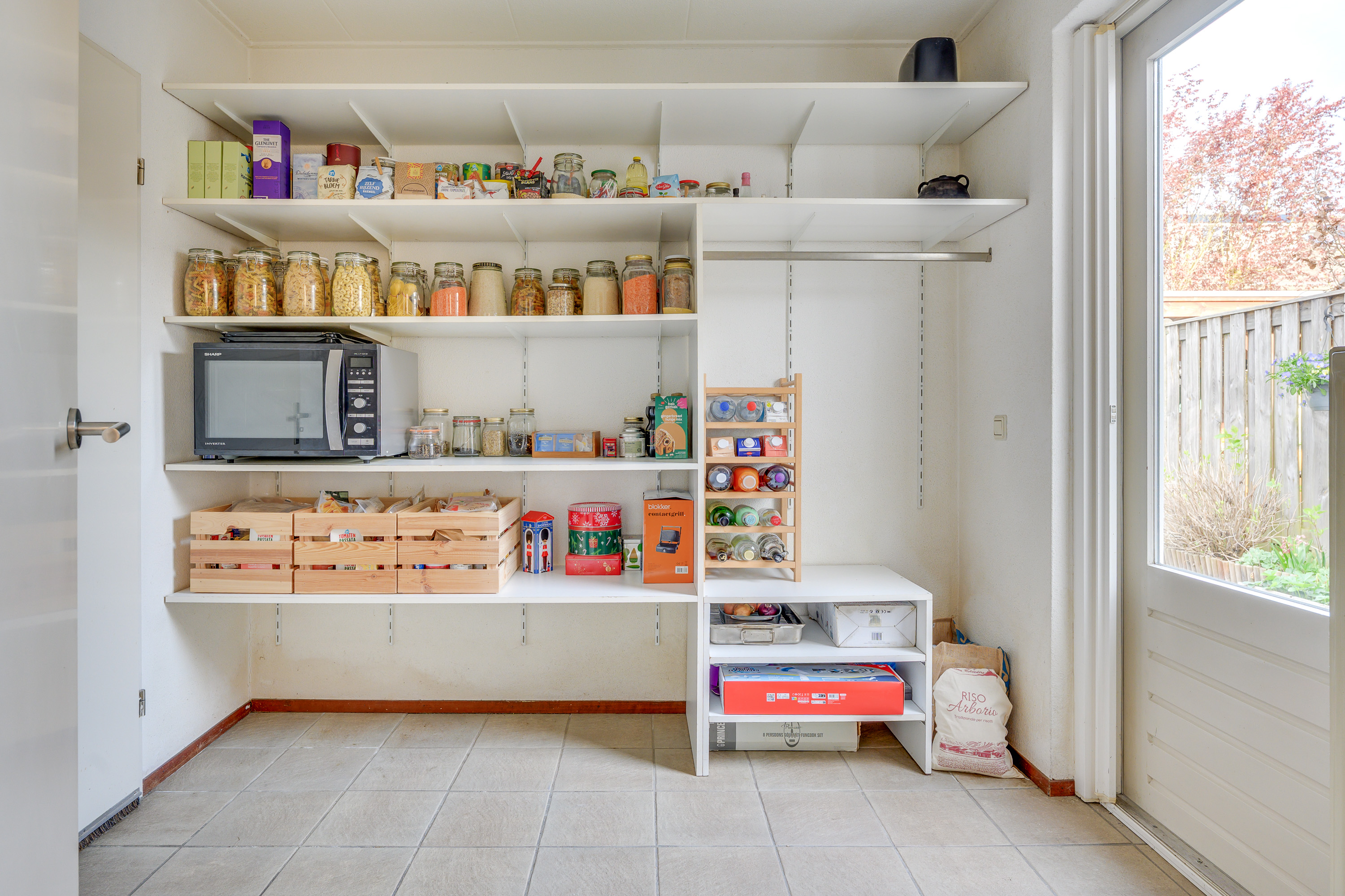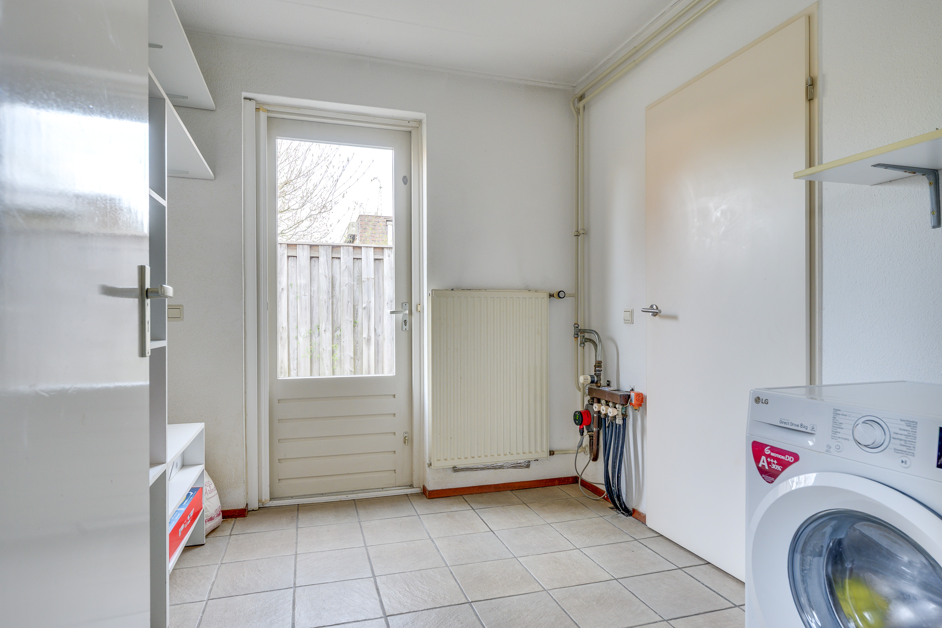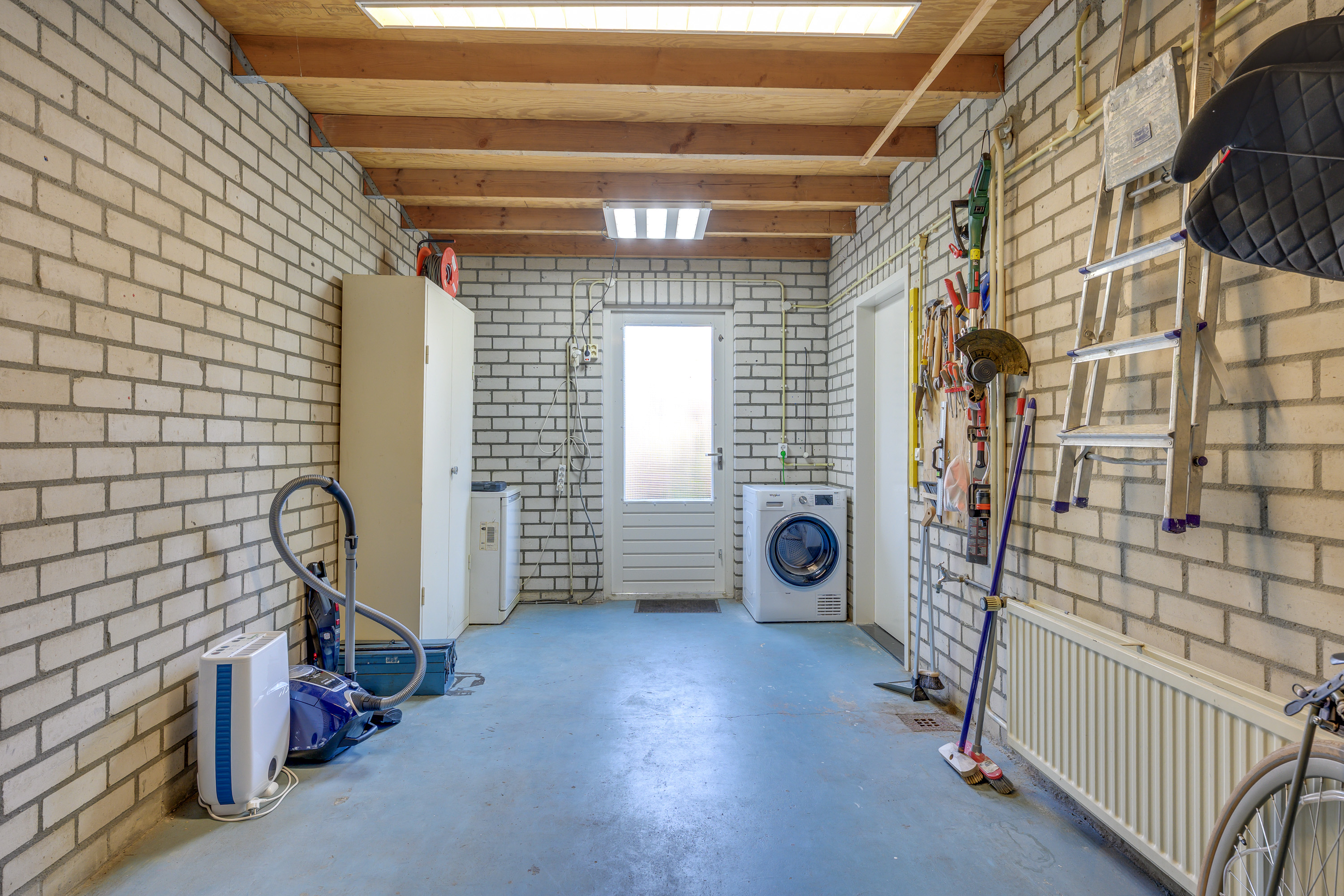 De bijkeuken is voorzien van een tegelvloer en biedt veel bergruimte. Hier bevinden zich tevens de aansluitingen voor wasmachine en droger en de verdeler van de vloerverwarming. Vanuit de bijkeuken is er toegang tot zowel de achtertuin als de garage.