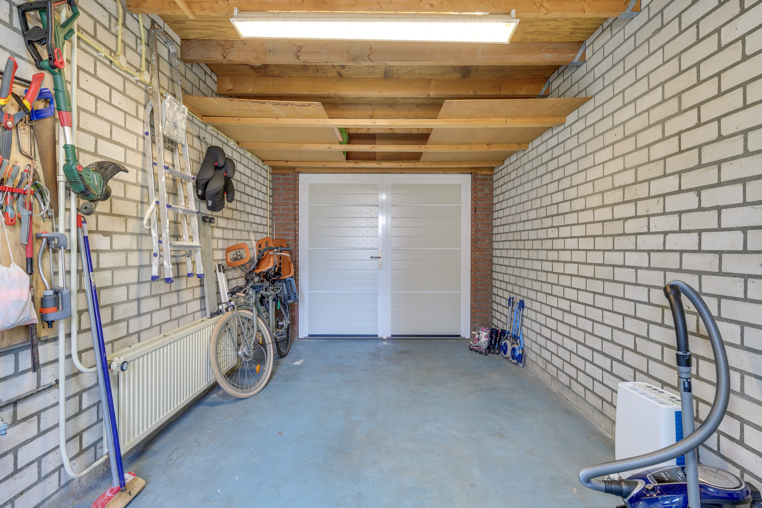 De garage met een dubbel openslaande deur, uitgevoerd met inbraakbeveiliging en isolatie, is bereikbaar via de oprit én via de bijkeuken. De ruimte is voorzien van elektra, verwarming en wateraansluiting, wat de garage multifunctioneel maakt. Daarnaast is de garage deels geïsoleerd. Vanuit de achterkant van de garage is er toegang tot een deur naar de tuin.