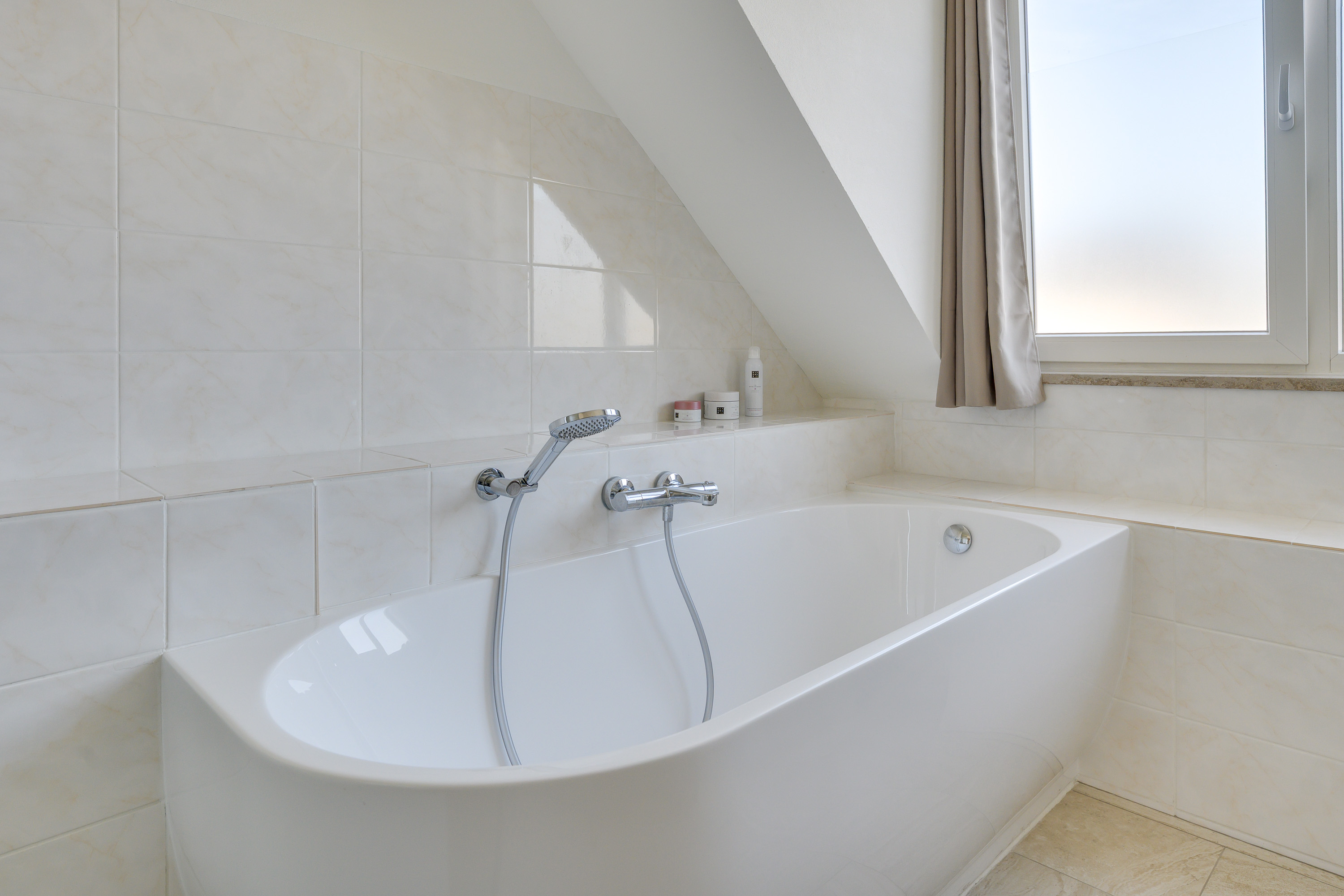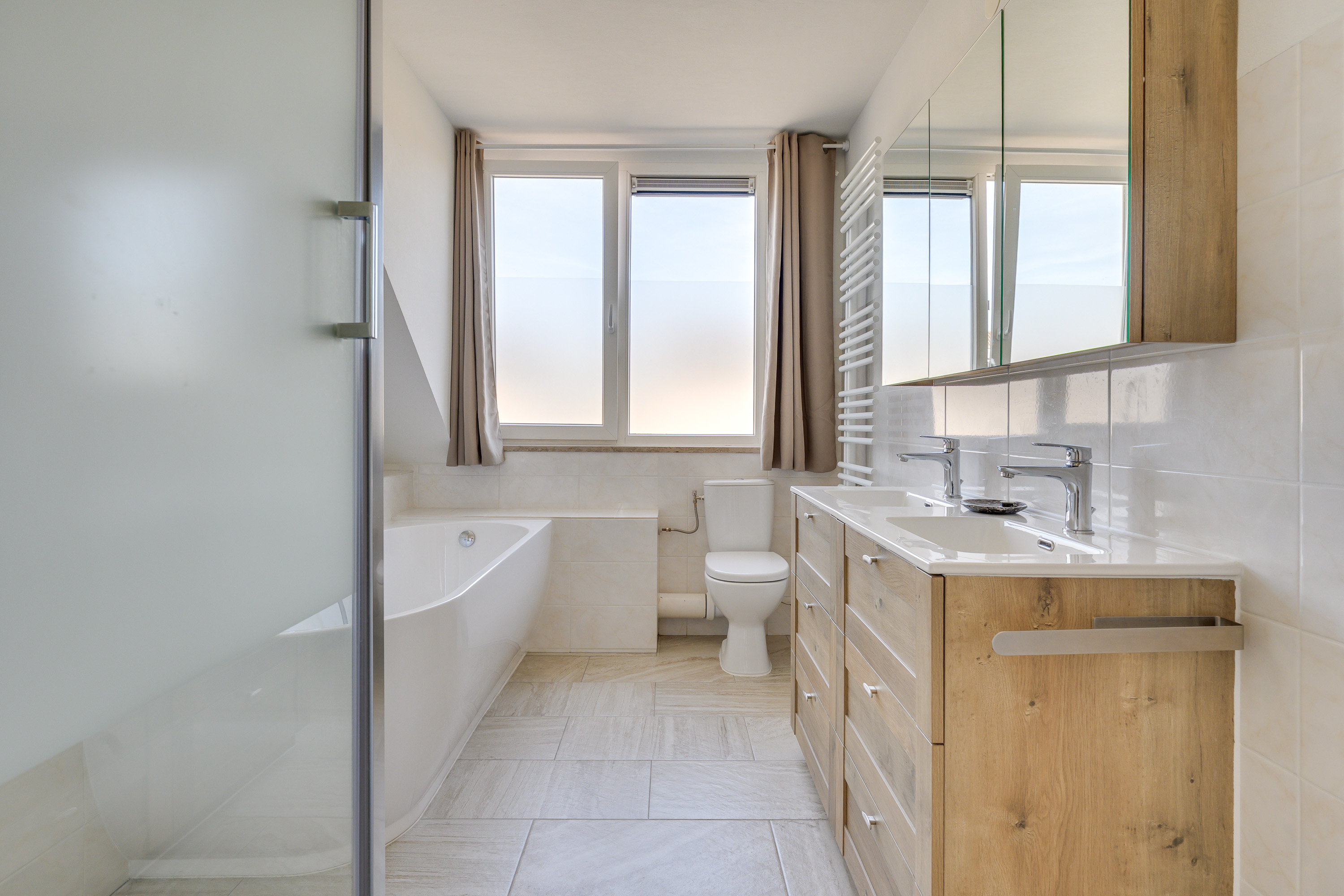 De badkamer is in 2025 vernieuwd en modern afgewerkt. De ruimte is voorzien van een tegelvloer en deels betegelde wanden. De indeling is compleet met een dubbele wastafel met meubel, een douchecabine en een ligbad. Daarnaast beschikt de badkamer over een toilet, een designradiator en mechanische ventilatie. Voor natuurlijke ventilatie en daglicht is er een draai-/kiepraam met kunststof kozijnen en dauerlüftung.