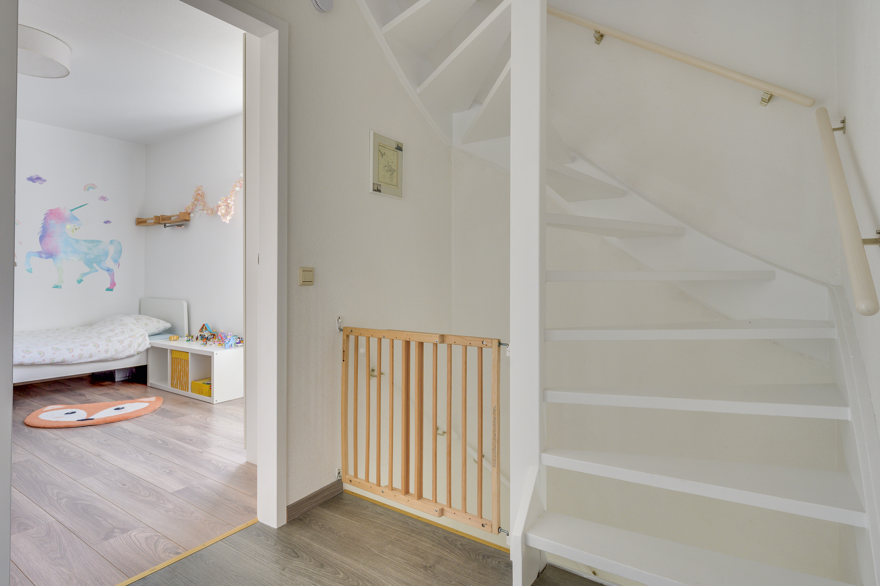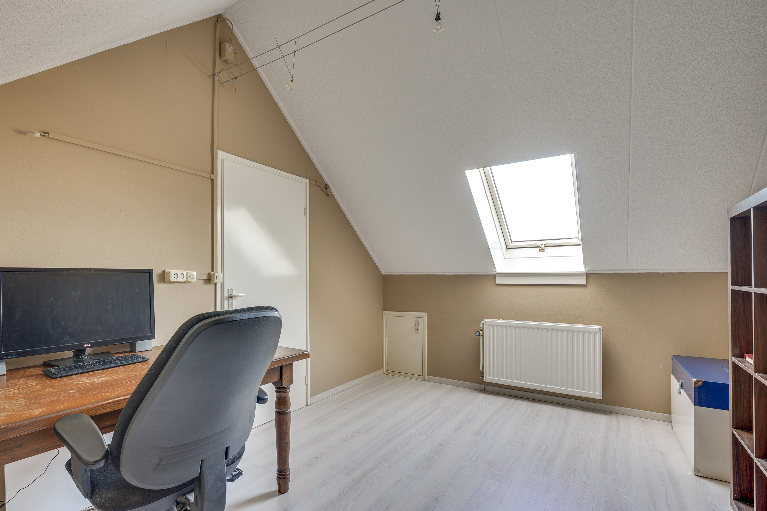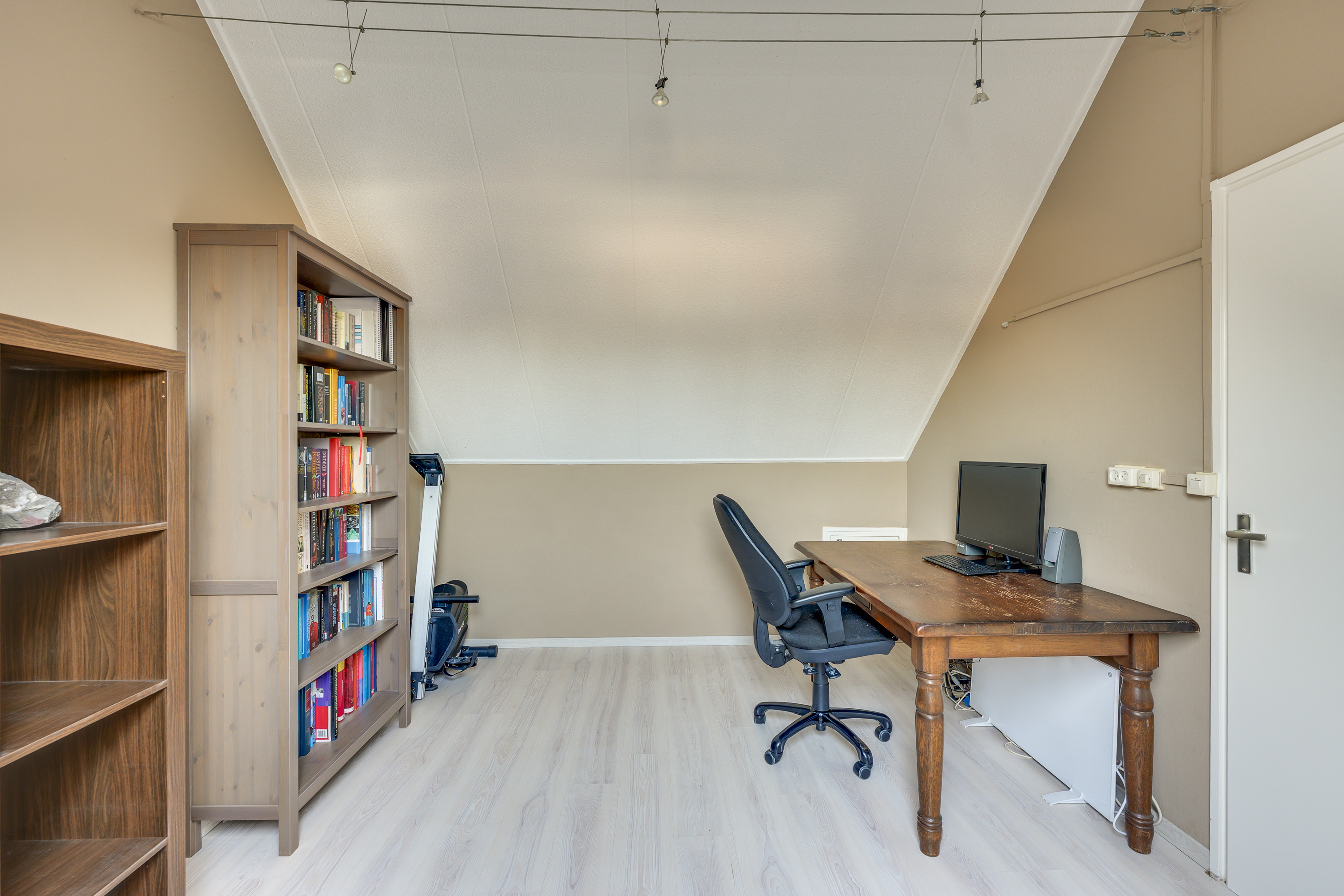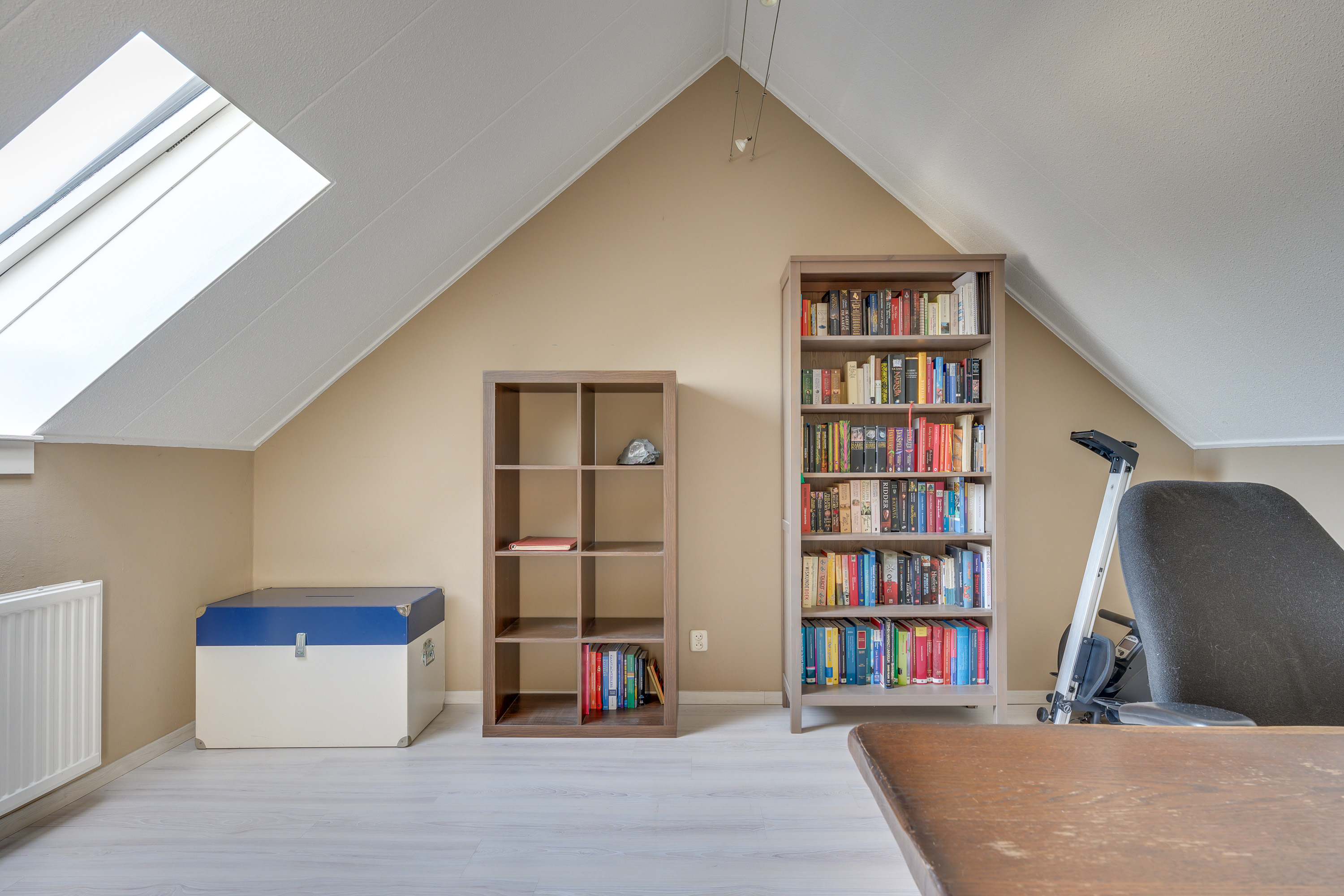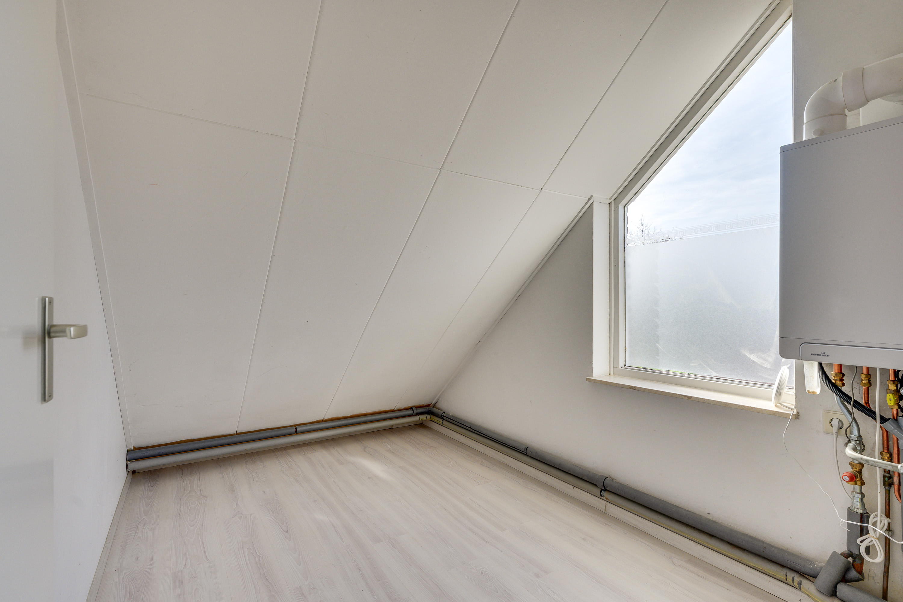 De tweede verdieping is voorzien van een laminaatvloer. De aparte wasruimte beschikt over een vast raam voor daglicht en ventilatie. Hier bevindt zich tevens de klasse 5 cv-installatie (2025), deze zorgt voor hoge prestaties en is geschikt voor een groter huishouden. De slaapkamer op deze verdieping is voorzien van een dakraam, wat zorgt voor een prettige lichtinval. Onder de schuine kap is veel bergruimte aanwezig.