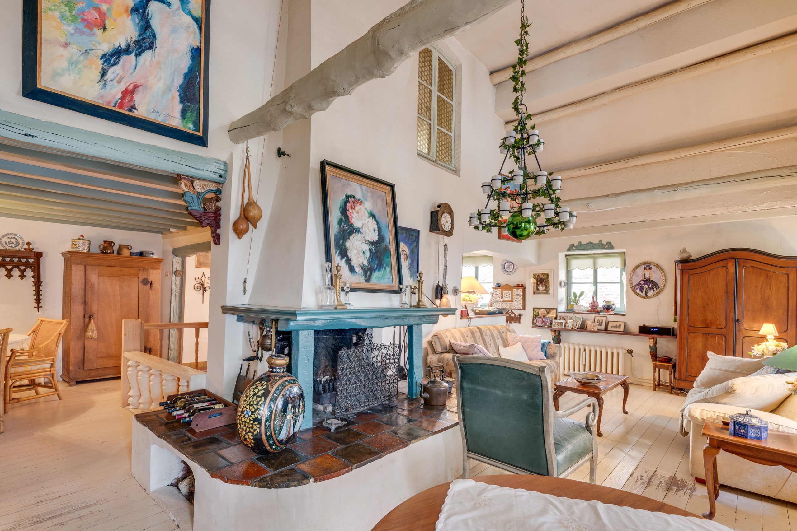 Terug naar de hal. Wanneer u na binnenkomst vanuit de hal naar rechts gaat, komt u wederom in een ruimte terecht met een bijzonder verleden. Waar eens vee stond, heerst nu een serene rust. De voormalige stal is getransformeerd tot een sfeervol woongedeelte met een vide en houten balkenplafond en waar een imposant raam het buitenleven naar binnen trekt. In het midden trekt de tweede grote open haard de aandacht. Achterin vangt het oog een glimp op van de tuin, terwijl twee dubbele openslaande deuren, voorzien van dubbel glas en horren, een zachte overgang vormen tussen binnen en buiten.