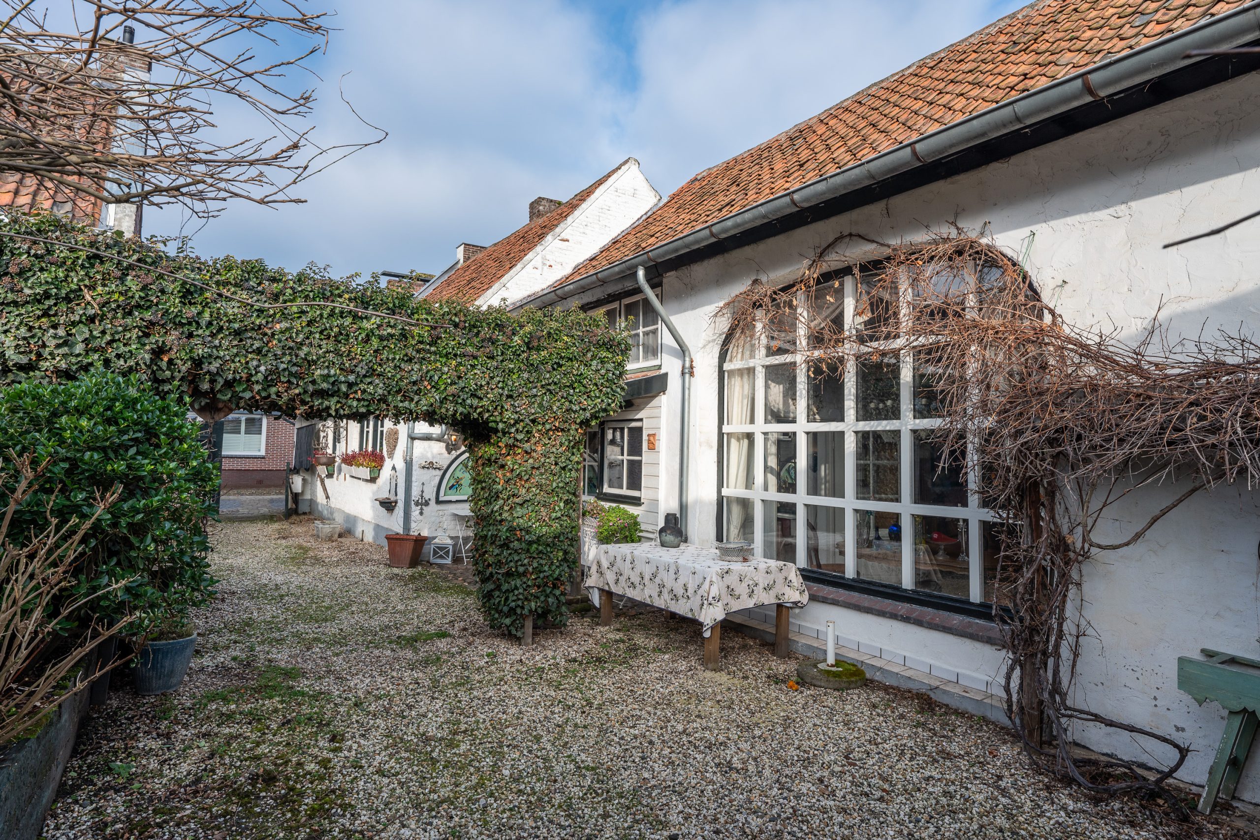 Aan de zijkant van de woning komt u door de poort het terrein op, waar een pad van wit grind u verder leidt.