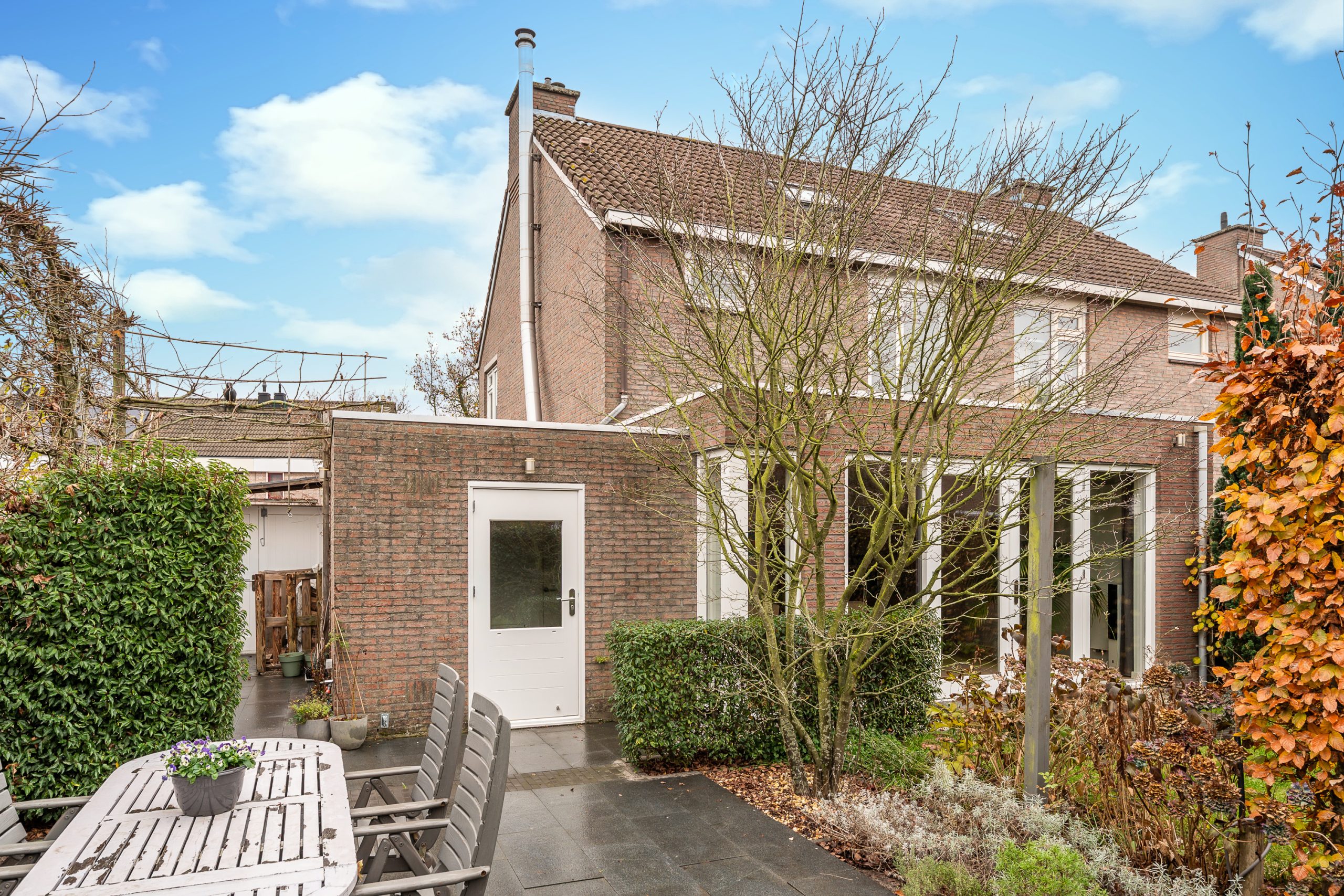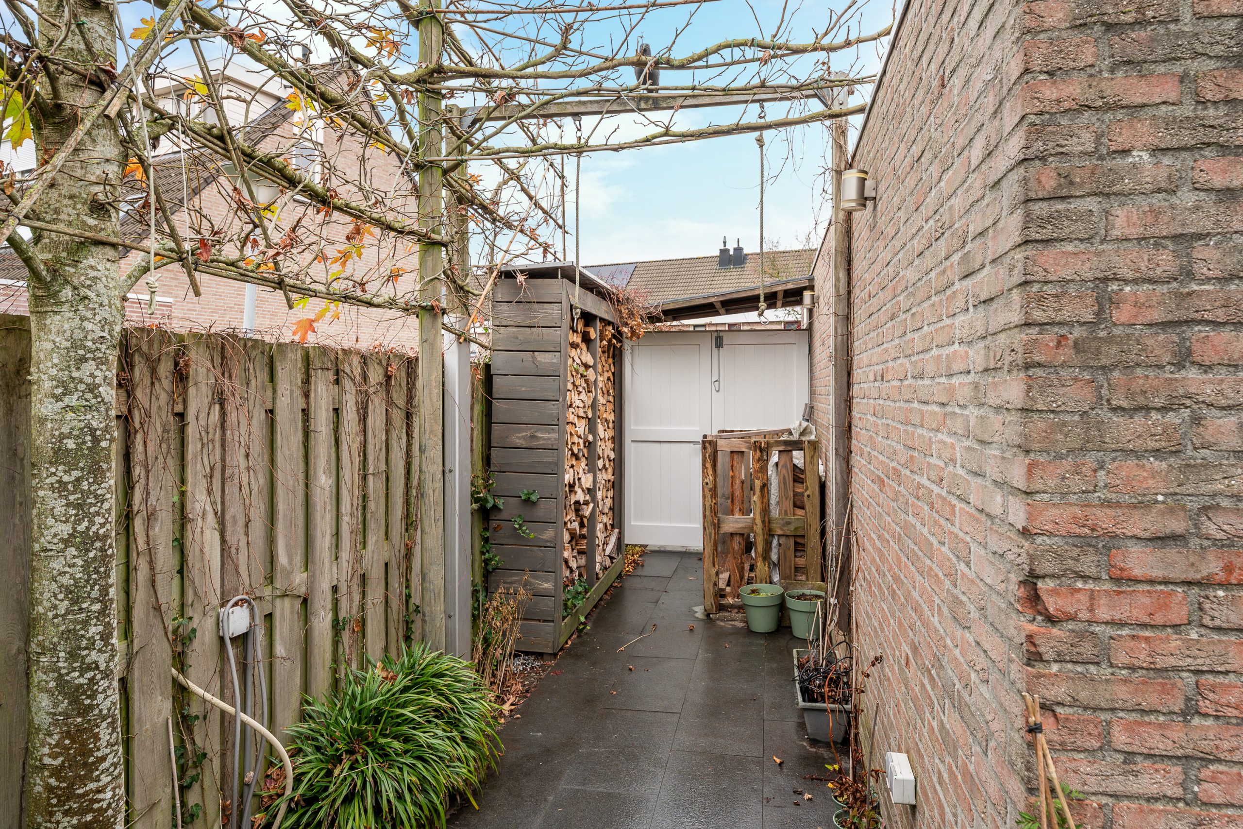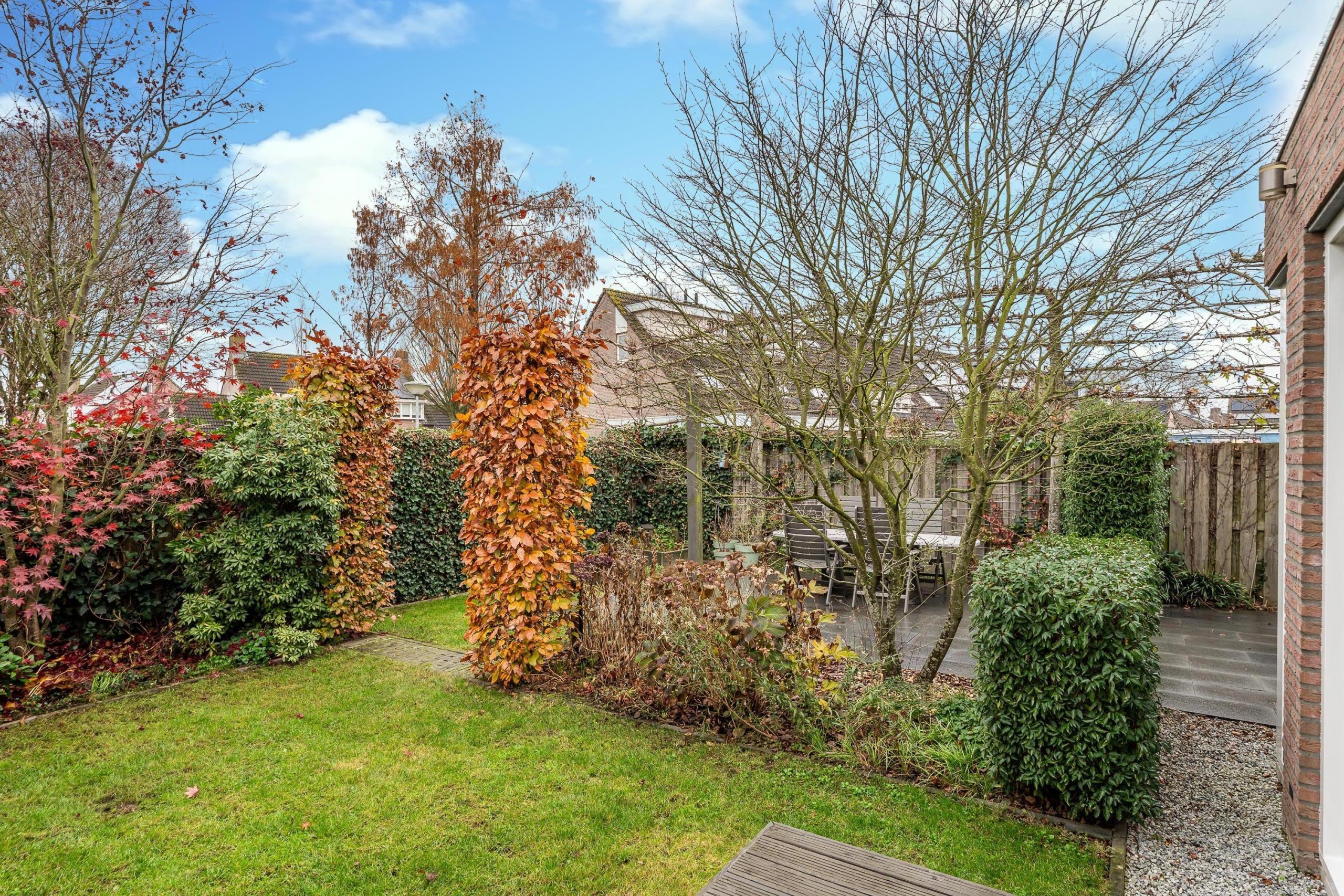 Via de achterom is de tuin ook goed bereikbaar. Aan de achterzijde en zijkant is er bovendien vrij uitzicht dankzij de gemeentelijke groenstrook, wat het gevoel van ruimte en rust extra versterkt.