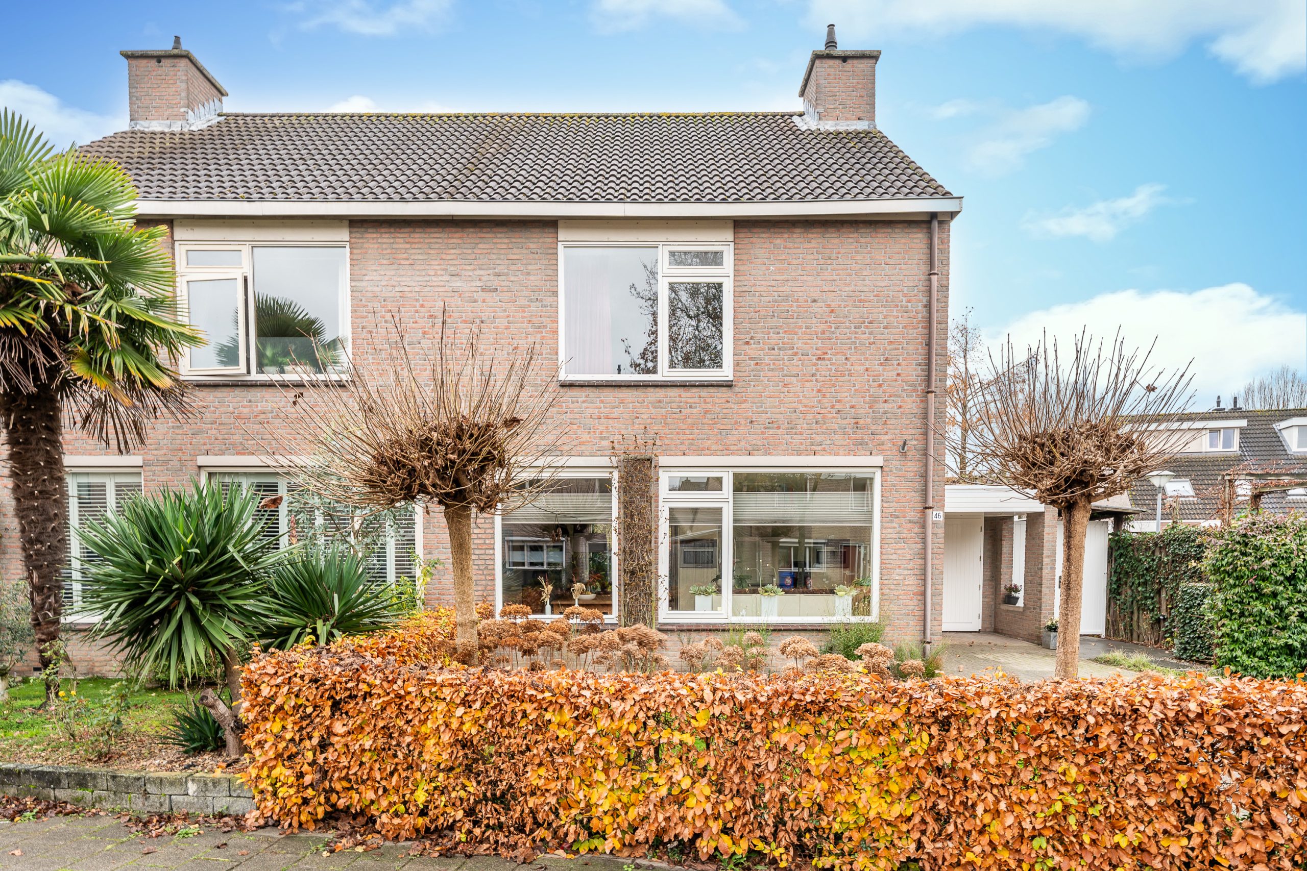 De voortuin is verzorgd en groen aangelegd met een mooie beukenhaag als erfafscheiding. Tussen het groen staan bolcatalpa’s en hortensia’s, met een gazon dat het geheel een frisse, open uitstraling geeft.