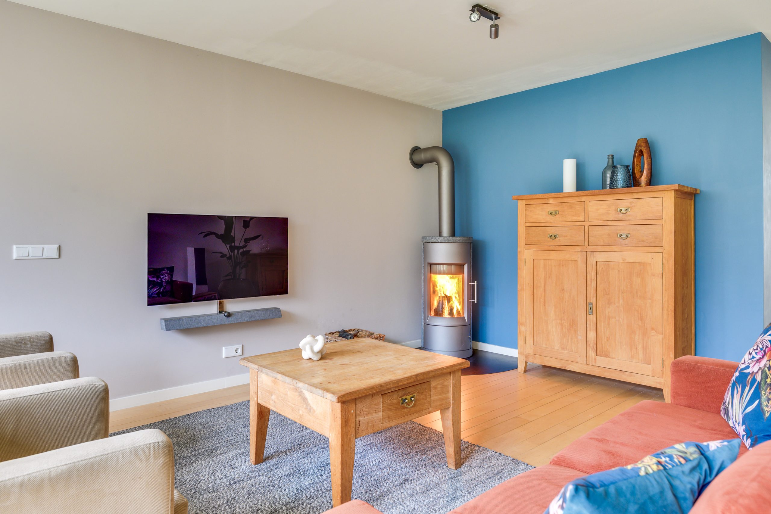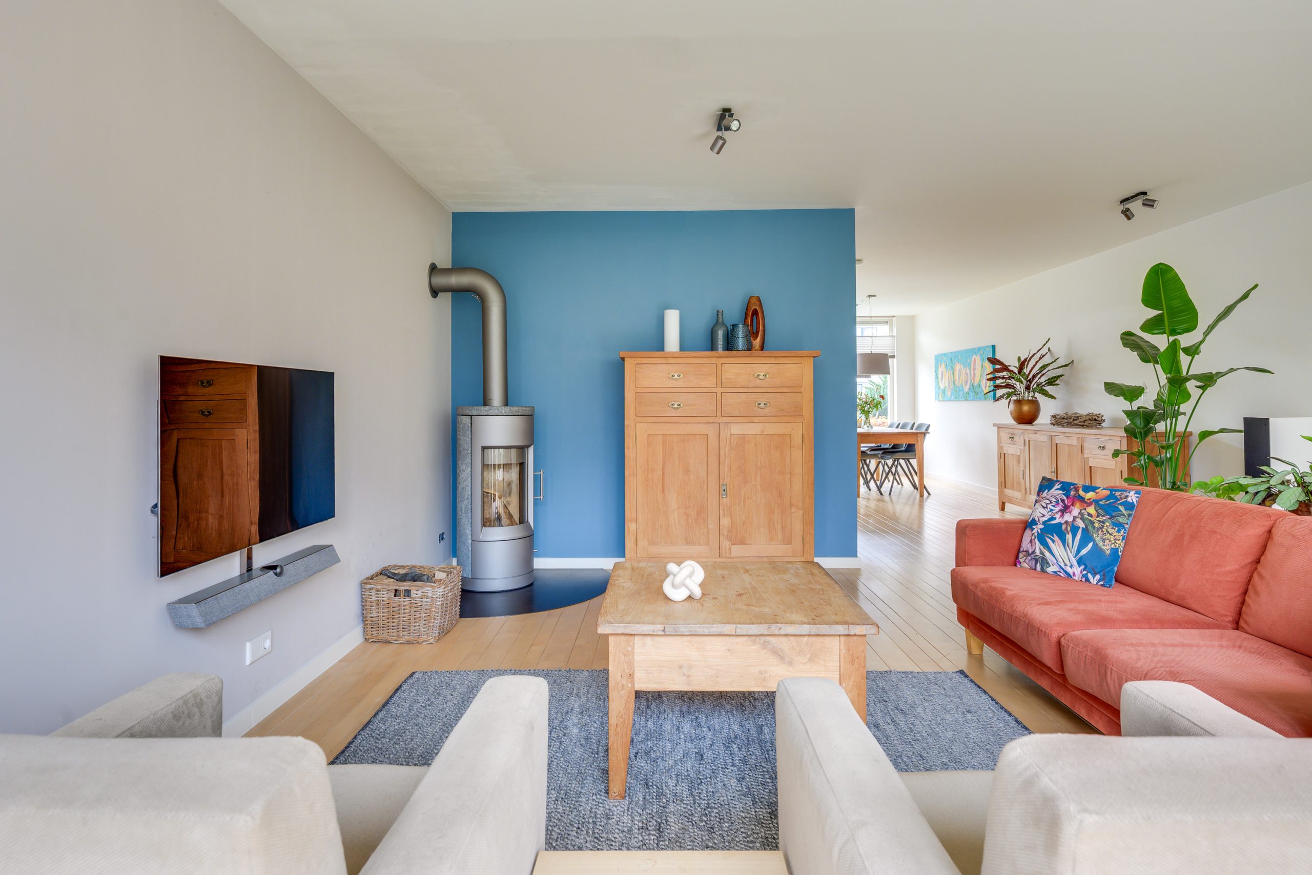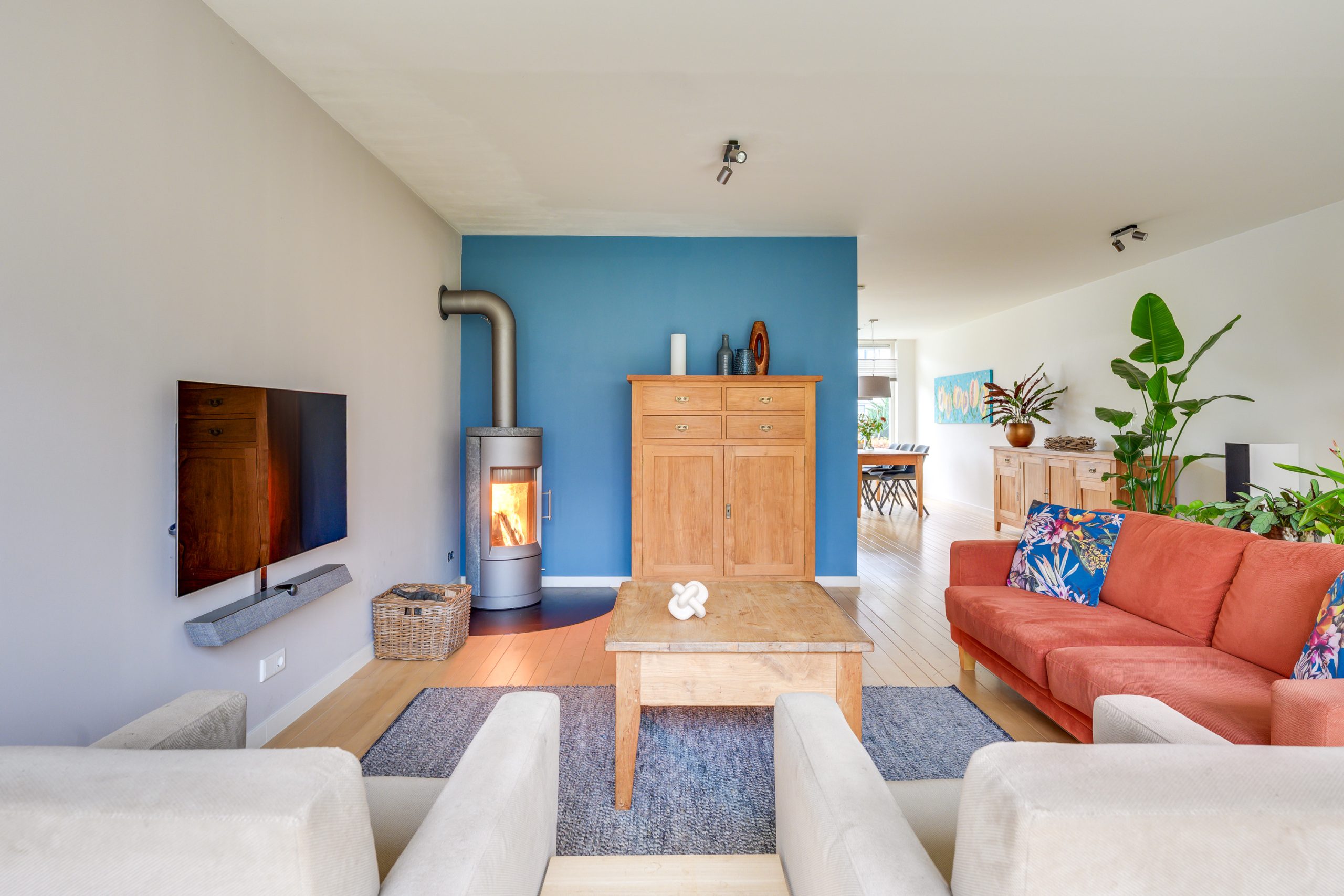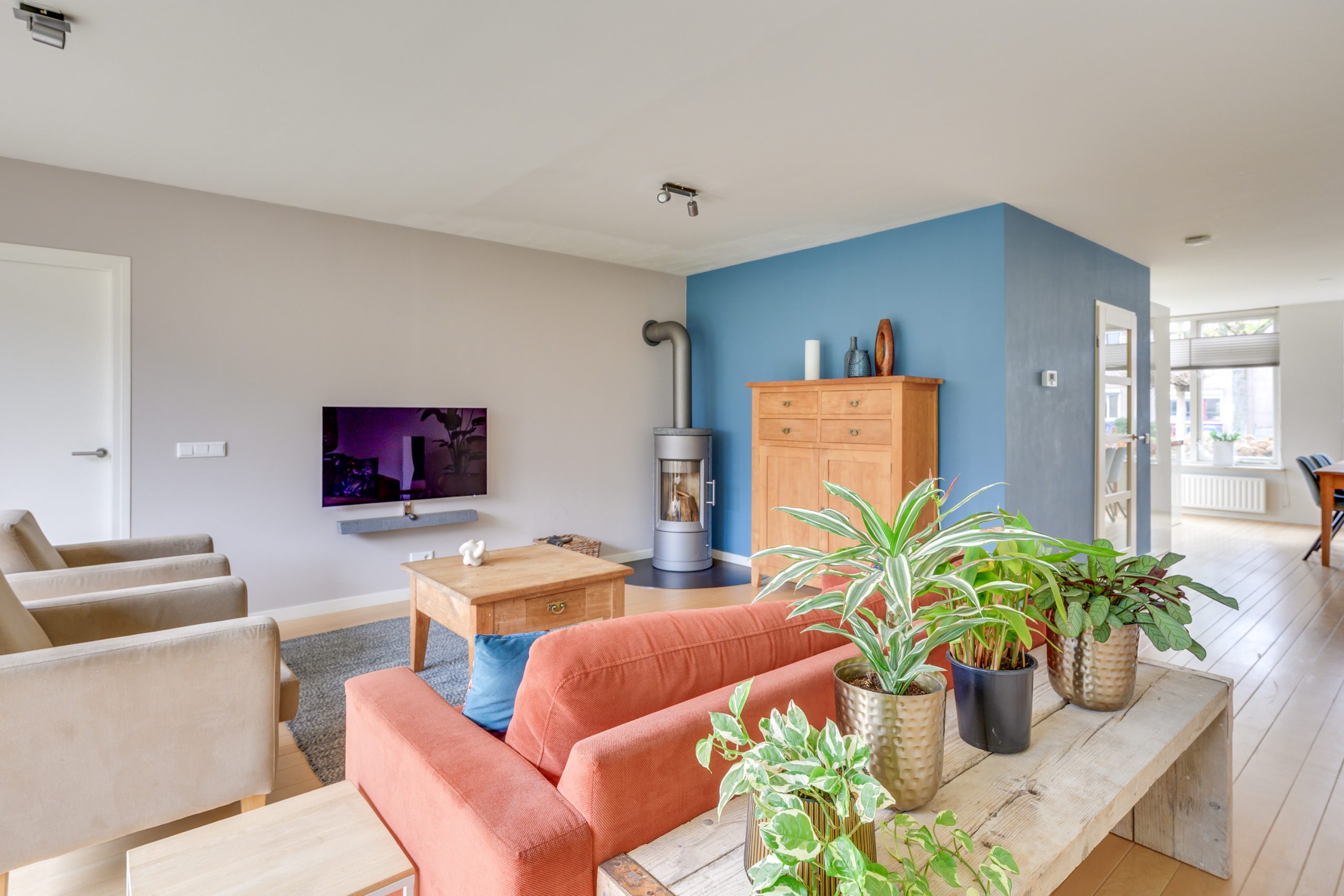 De royale L-vormige living is een heerlijke leefruimte met een warme, natuurlijke uitstraling dankzij de houten vloer van Canadees hard maple. Vanuit de zithoek zorgt de hoogrendement houtkachel (rendement 80%+) voor extra comfort en sfeer. Het achterste deel van de woonkamer is in 2011 uitgebouwd, waardoor er een mooie extra ruimte is ontstaan met veel lichtinval. De wanden en plafond zijn strak gestuct en voorzien van inbouwspots, wat samen met de moderne afwerking een rustige basis geeft. Via de openslaande deuren loopt u zo de tuin in. Daarnaast is er aan de rechterzijde een deur naar de bijkeuken en de garage.