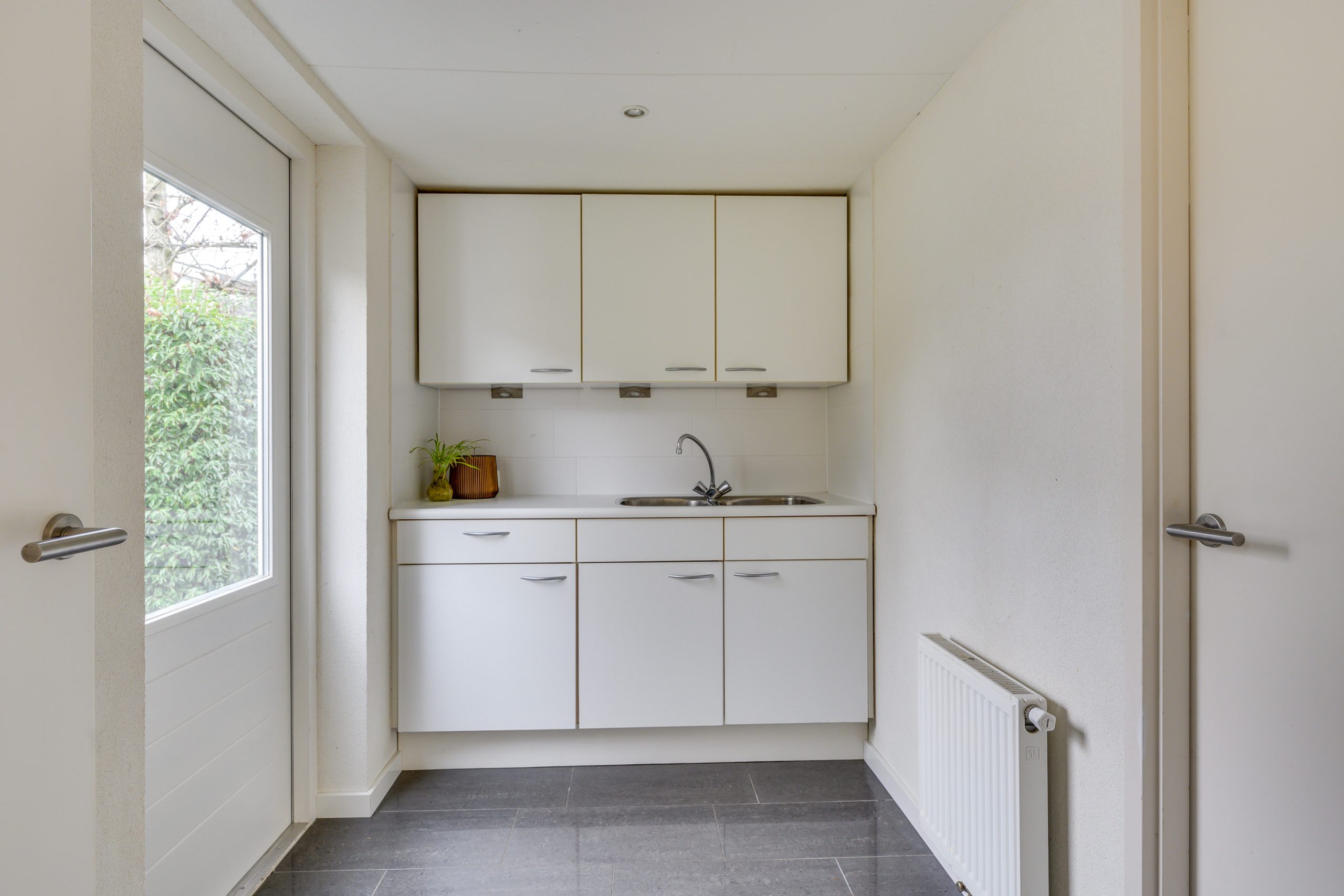 Fijne, praktische bijkeuken met een tegelvloer en gestucte wanden. Er is een keukenblok met koudwaterkraan aanwezig, ideaal voor het huishouden of als extra werkruimte. De inbouwspots geven prettig licht. Vanuit hier loopt u links zo de tuin in en is er rechts een directe doorgang naar de garage.