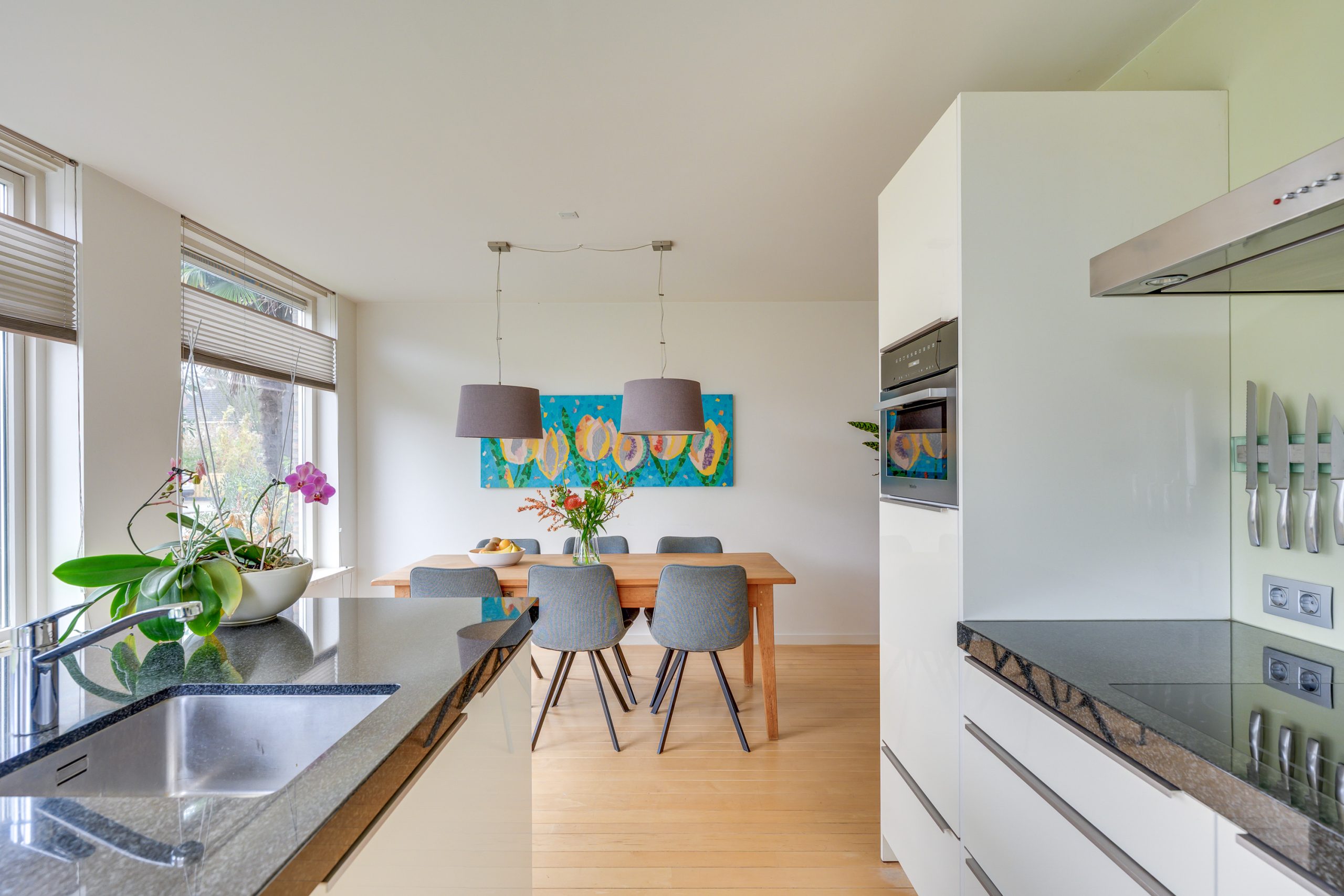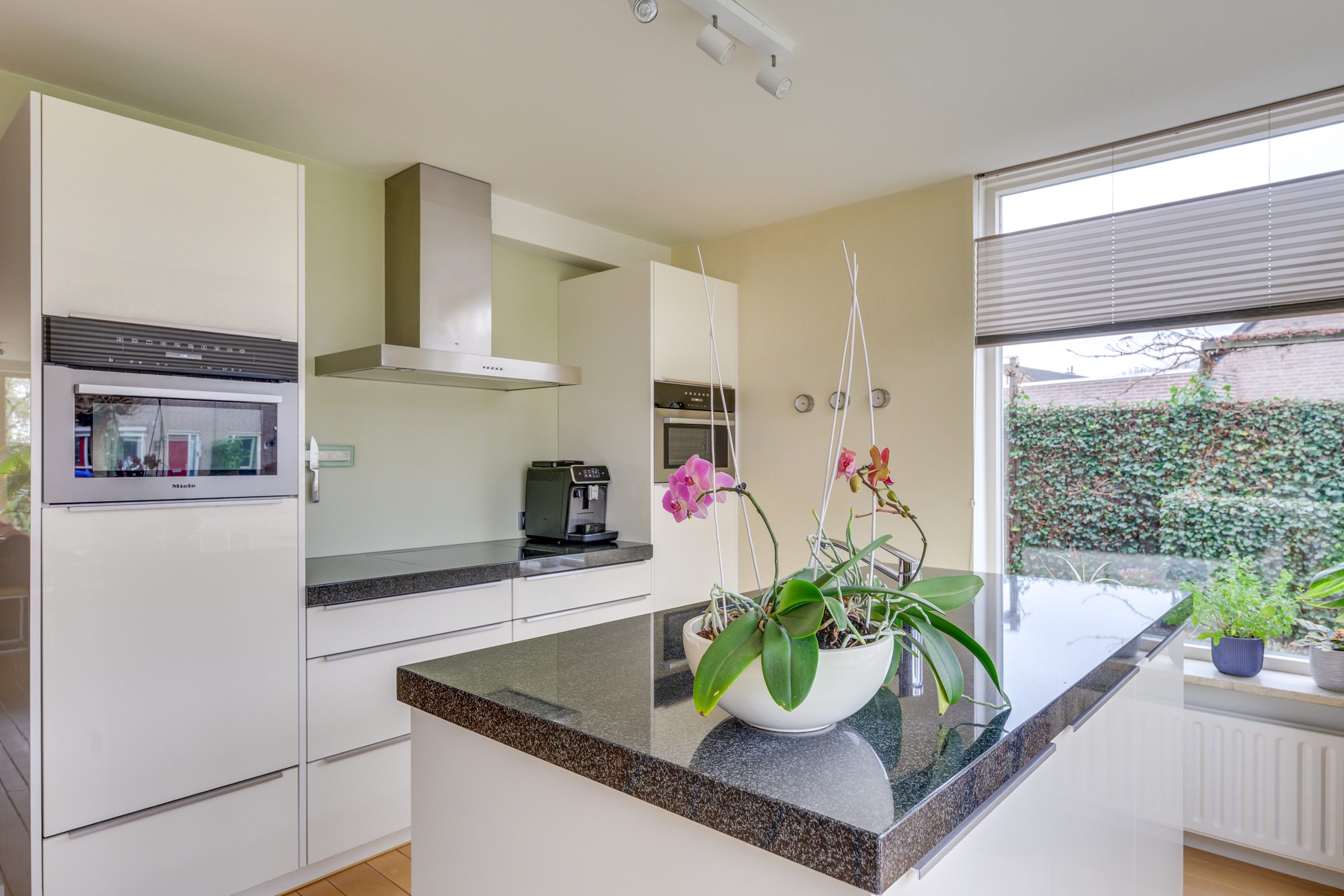 Aan de voorzijde bevindt zich het eetgedeelte met aansluitend de open keuken, met Van Diessen keukeninrichting. Deze keuken is compleet uitgerust en voorzien van een stijlvol granieten werkblad. Een spoeleiland met veel werkruimte staat centraal in de keuken en bevat tevens een vriezer. Het kookgedeelte bevindt zich in het rechte keukenblok en is voorzien van een 4-pits inductiekookplaat. Verder beschikt de keuken over een vaatwasser op hoogte en twee Miele-ovens: links een combi-oven (2024) en rechts een stoomoven (2024). De koelkast is vernieuwd in 2023. Het extra raam in de voorgevel (geplaatst in 2011) zorgt voor nog meer daglicht en versterkt het open, luchtige karakter van deze fijne woonkeuken.