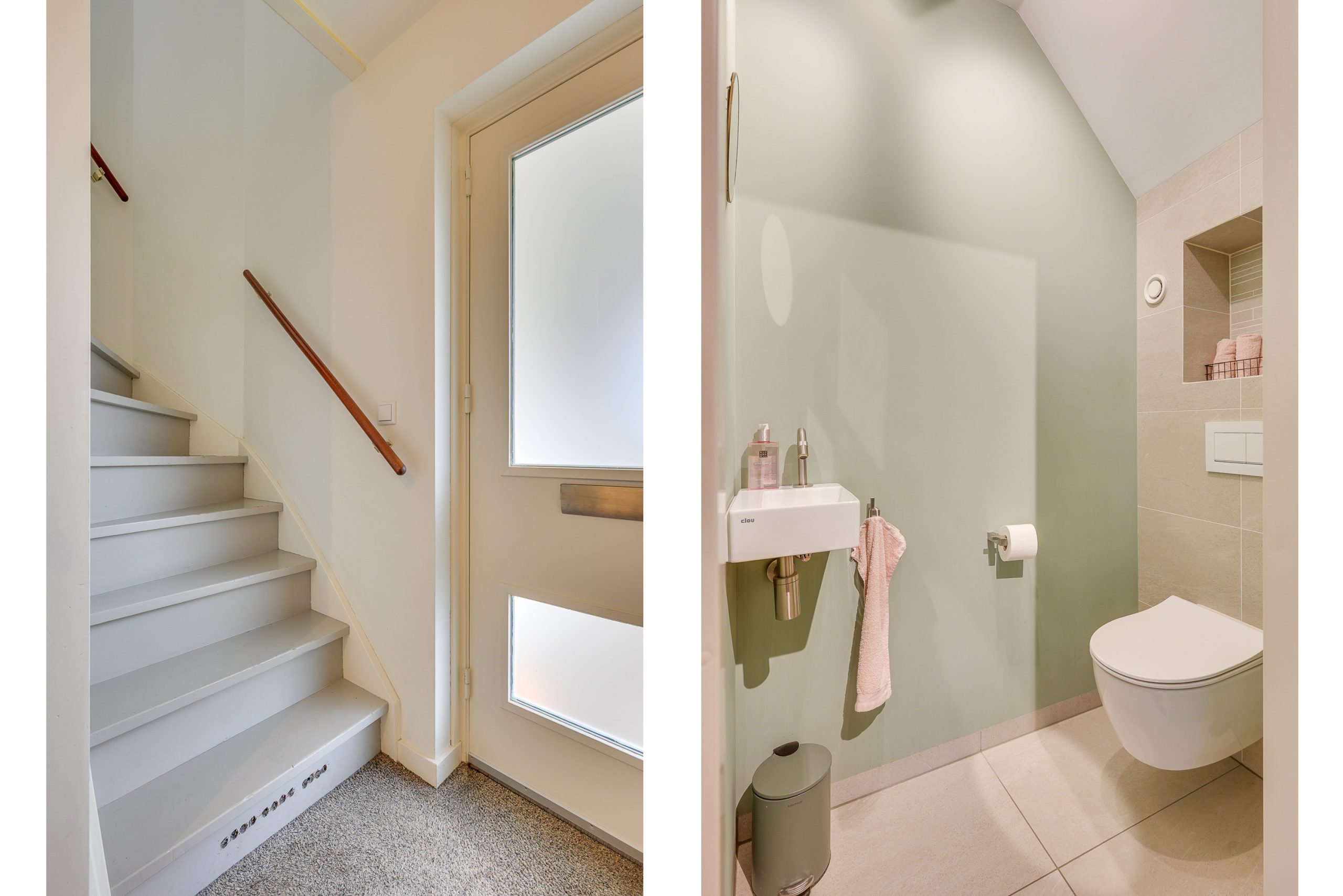 Aan de rechterzijde ligt het gastentoilet. Deze toiletruimte is modern uitgevoerd met een wandcloset, een tegelvloer, strak gestucte wanden, fontein en mechanische ventilatie.