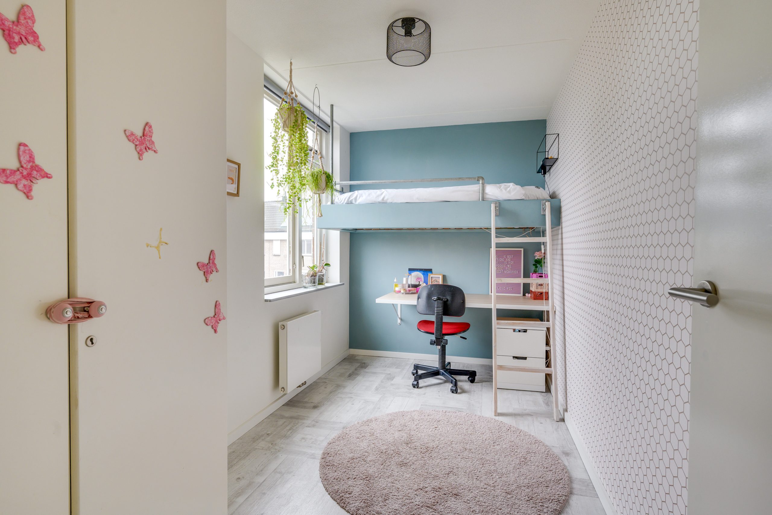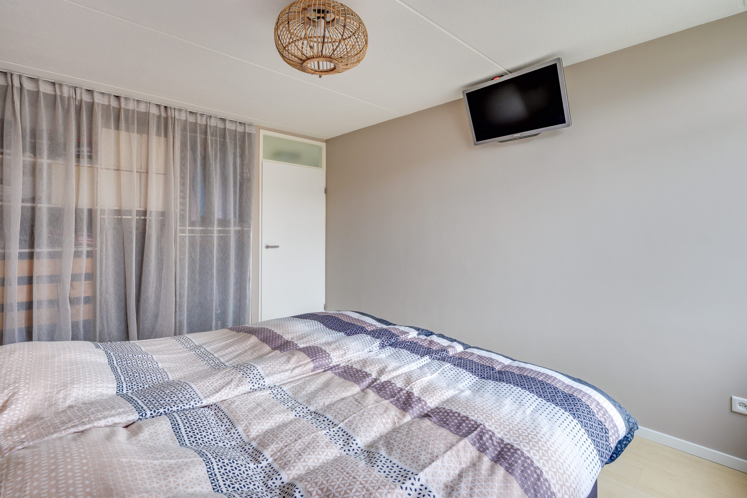 Aan de achterzijde ligt een rustige slaapkamer met grote ramen en een mooi groen uitzicht. De vloer is gestoffeerd en de kamer is afgewerkt met behang en stucwerk, wat zorgt voor een prettige, warme uitstraling .De grootste slaapkamer bevindt zich aan de voorzijde van de woning. Een royale kamer met grote raampartijen, laminaatvloer en strak gestucte wanden. De inbouwkasten bieden volop ruimte. Ook de derde slaapkamer ligt aan de voorzijde en is voorzien van een laminaatvloer, stuc- en behangafwerking en grote ramen die zorgen voor een lichte, aangename ruimte.