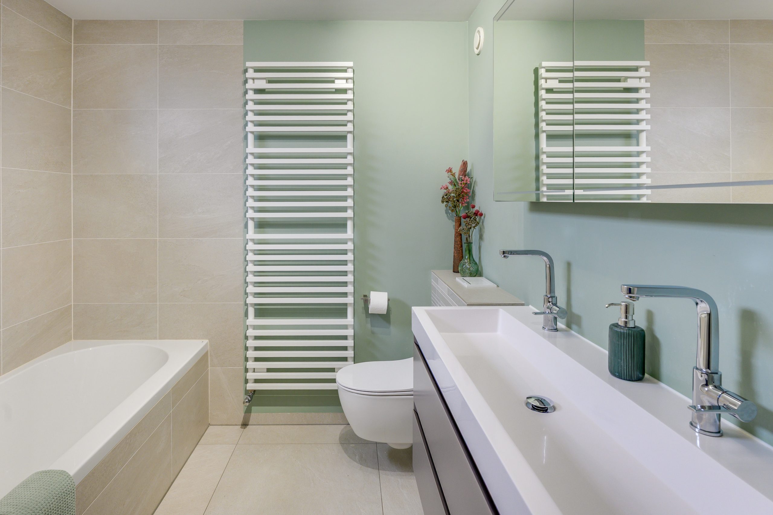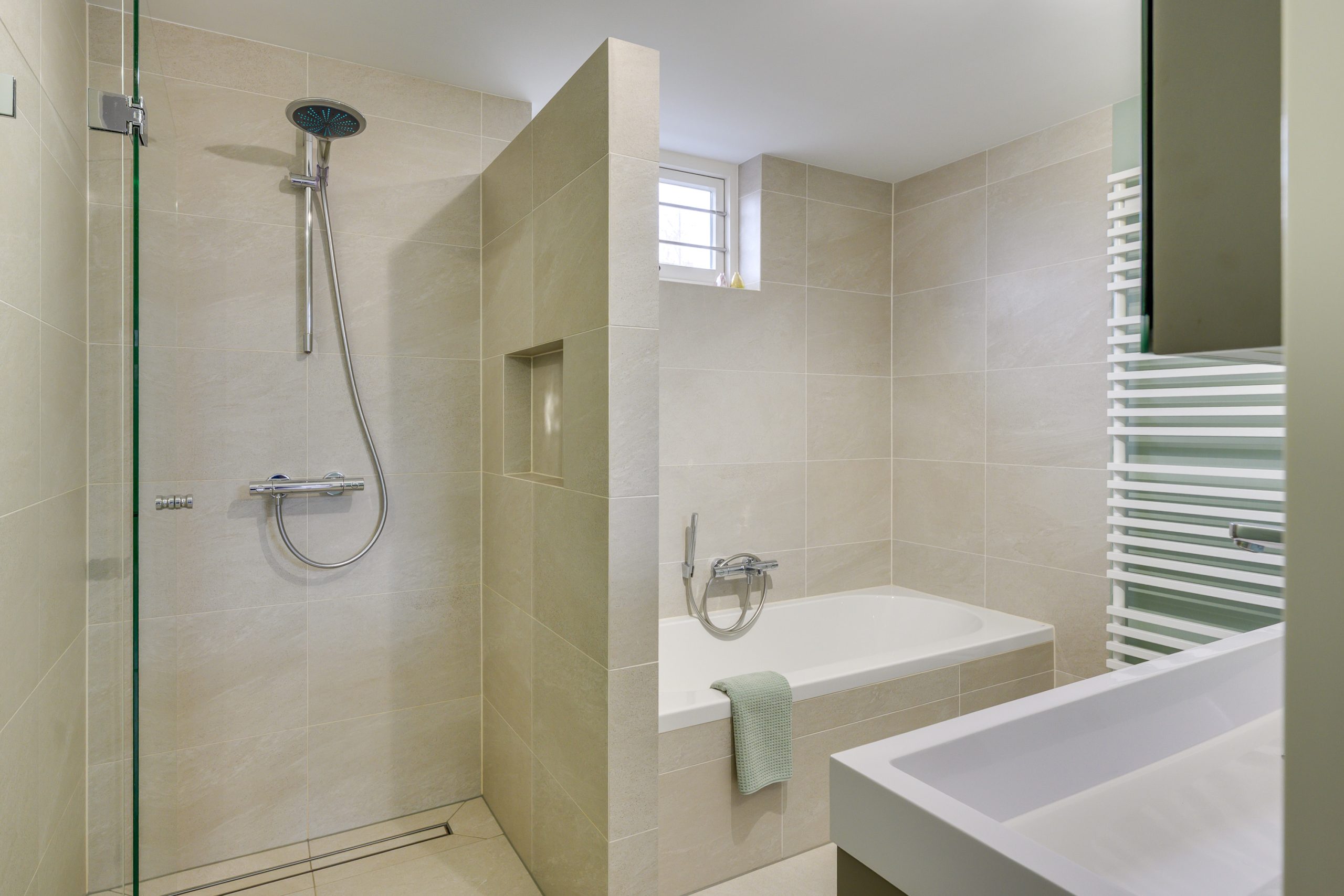 Wat een fijne, royale badkamer! Deze ruimte is groot opgezet en voelt licht en comfortabel aan. De badkamer is grotendeels betegeld en netjes afgewerkt, met een rustige, tijdloze uitstraling. U vindt hier een wandcloset, een dubbele wastafel met een fraai meubel, spiegelkast en een stijlvolle designradiator. Daarnaast zijn er een ruime inloopdouche en een ligbad aanwezig. Het raam zorgt voor daglicht en natuurlijke ventilatie, aangevuld met mechanische ventilatie.