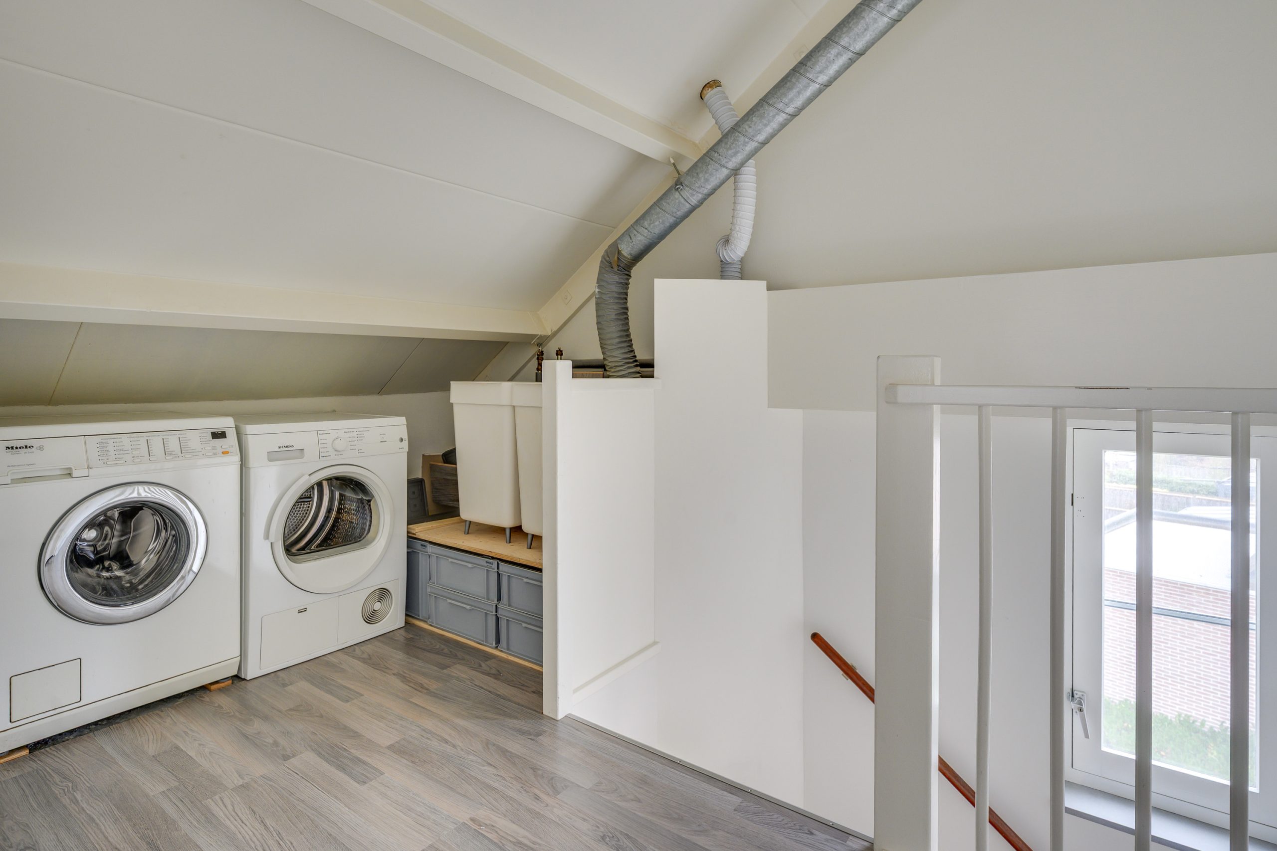 De tweede verdieping is via een vaste trap bereikbaar. Op de overloop bevinden zich de aansluitingen voor wasmachine en droger. Aan de andere zijde is een berging met de cv-ketel en toegang tot de vliering, ideaal voor extra opslag.