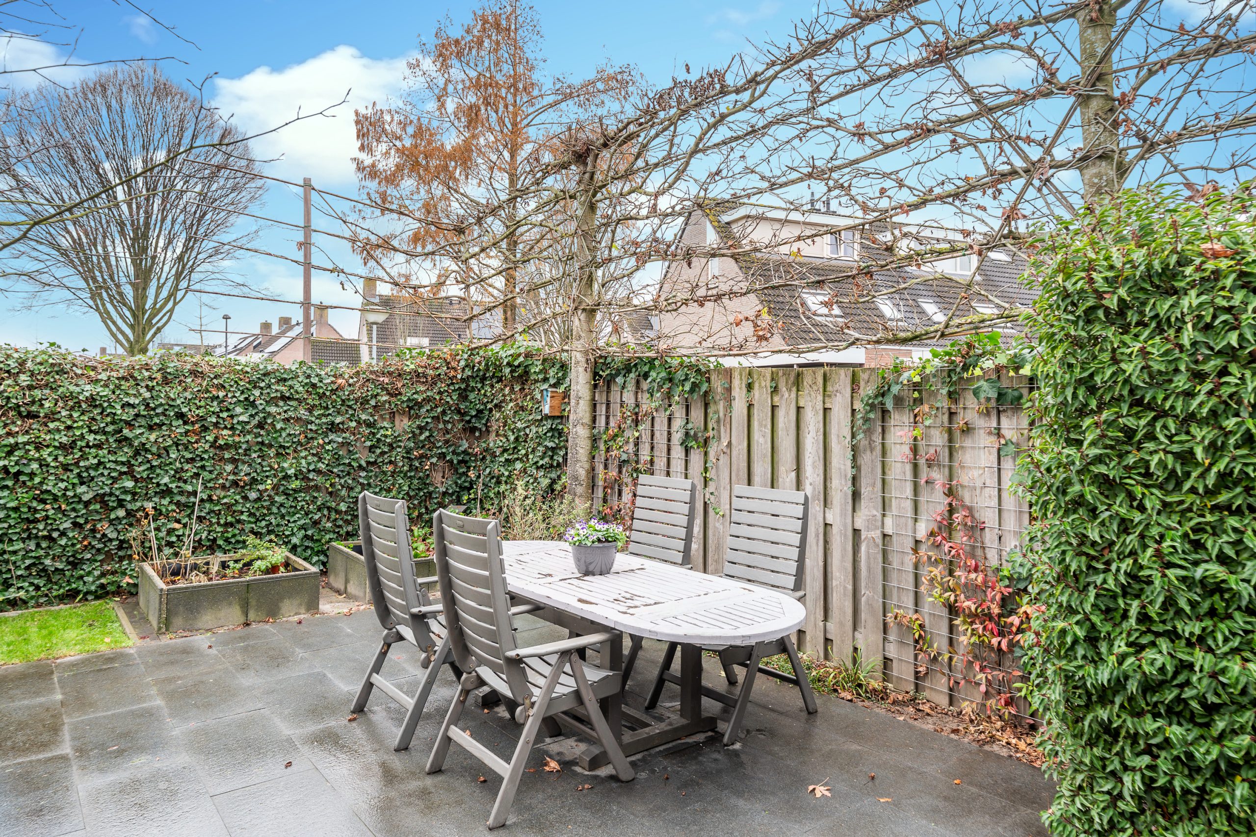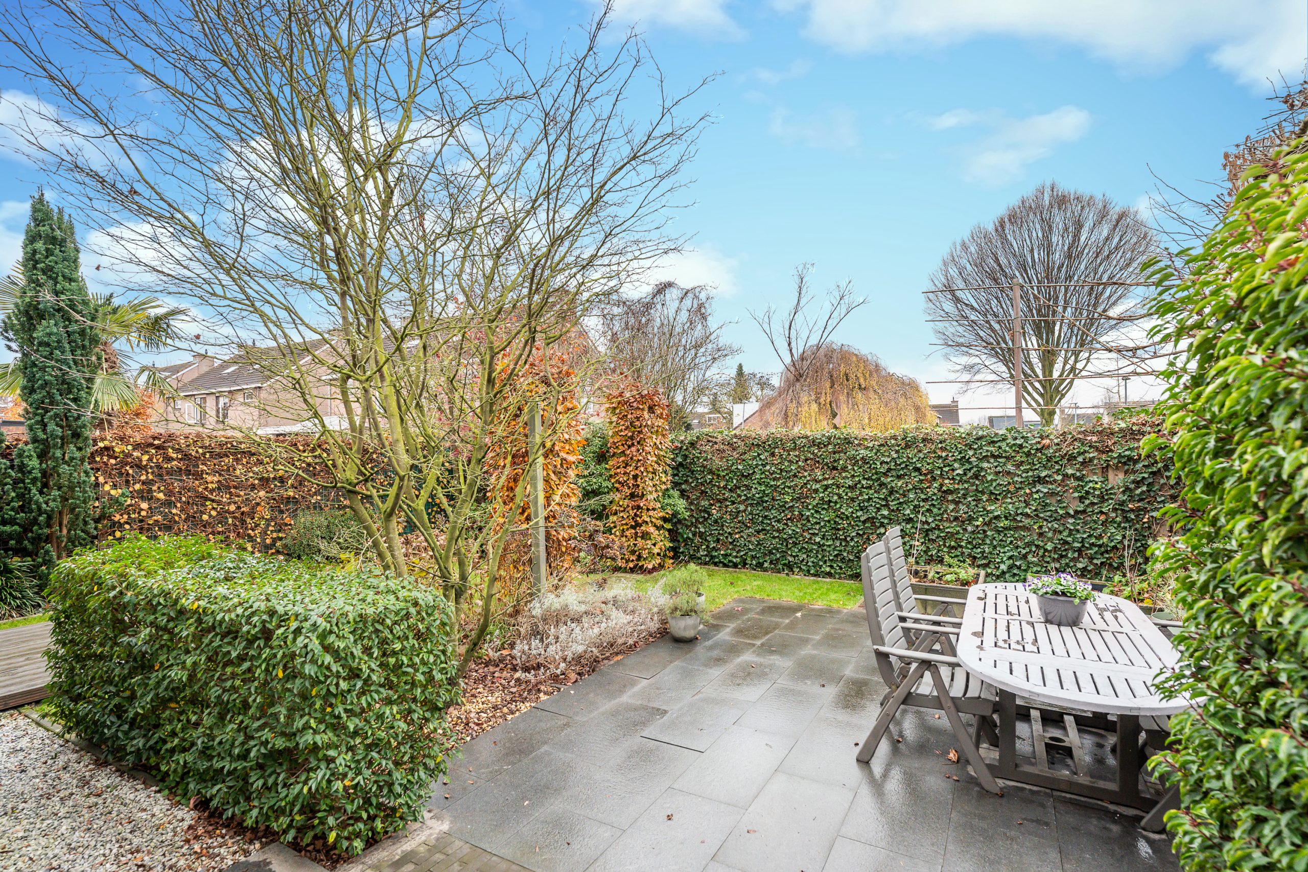 De fraai aangelegde achtertuin op het zuid-westen is een groene oase met veel privacy en een heerlijke sfeer. Direct achter de woning ligt een ruim terras met een granieten tegelvloer: een fijne plek om buiten te genieten van de tuin. De tuin is rijk en gevarieerd beplant met o.a. jasmijn, (klim)hortensia’s, Japanse esdoorn, leibomen (esdoorn), krentenboom, aangevuld met geurige lavendel. Hierdoor bloeit de tuin gedurende de seizoenen prachtig en hangt er een aangename, natuurlijke geur.
