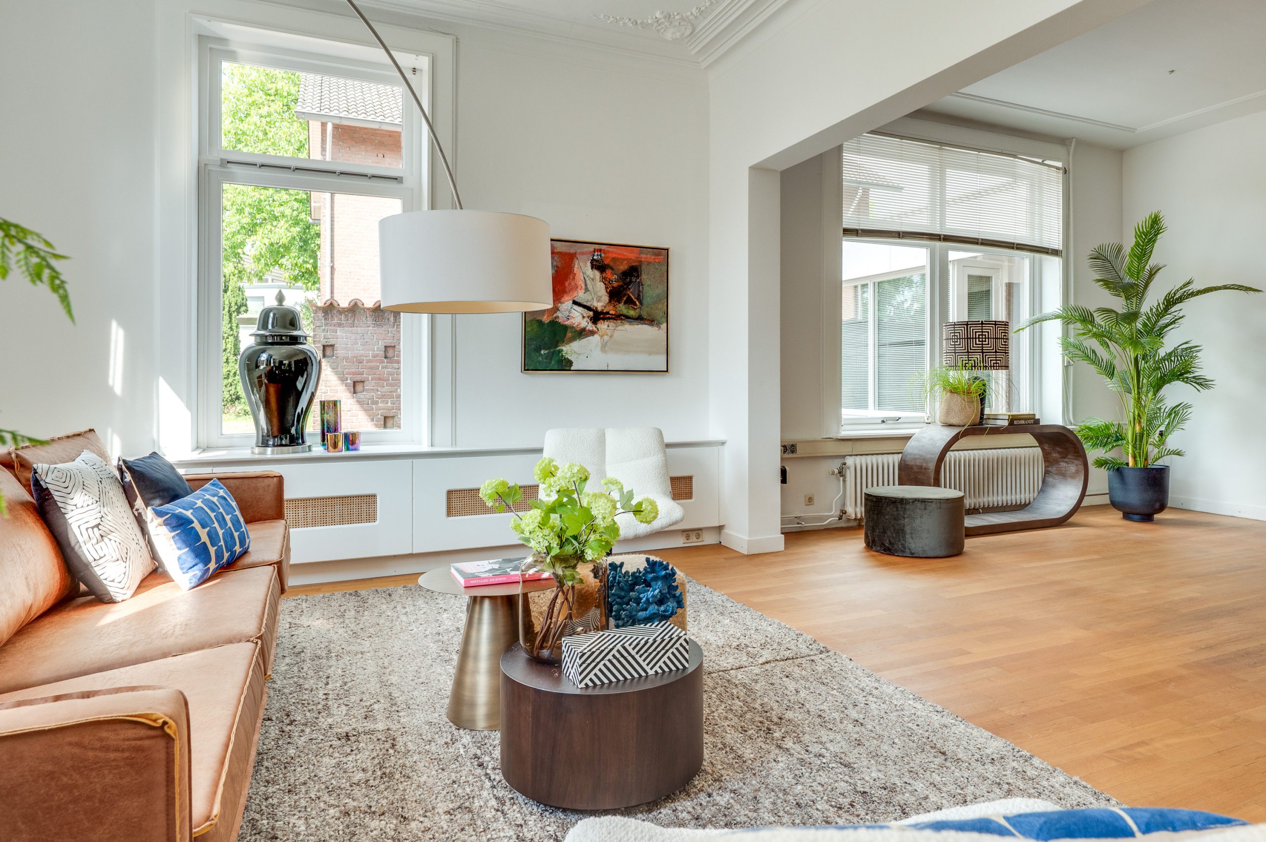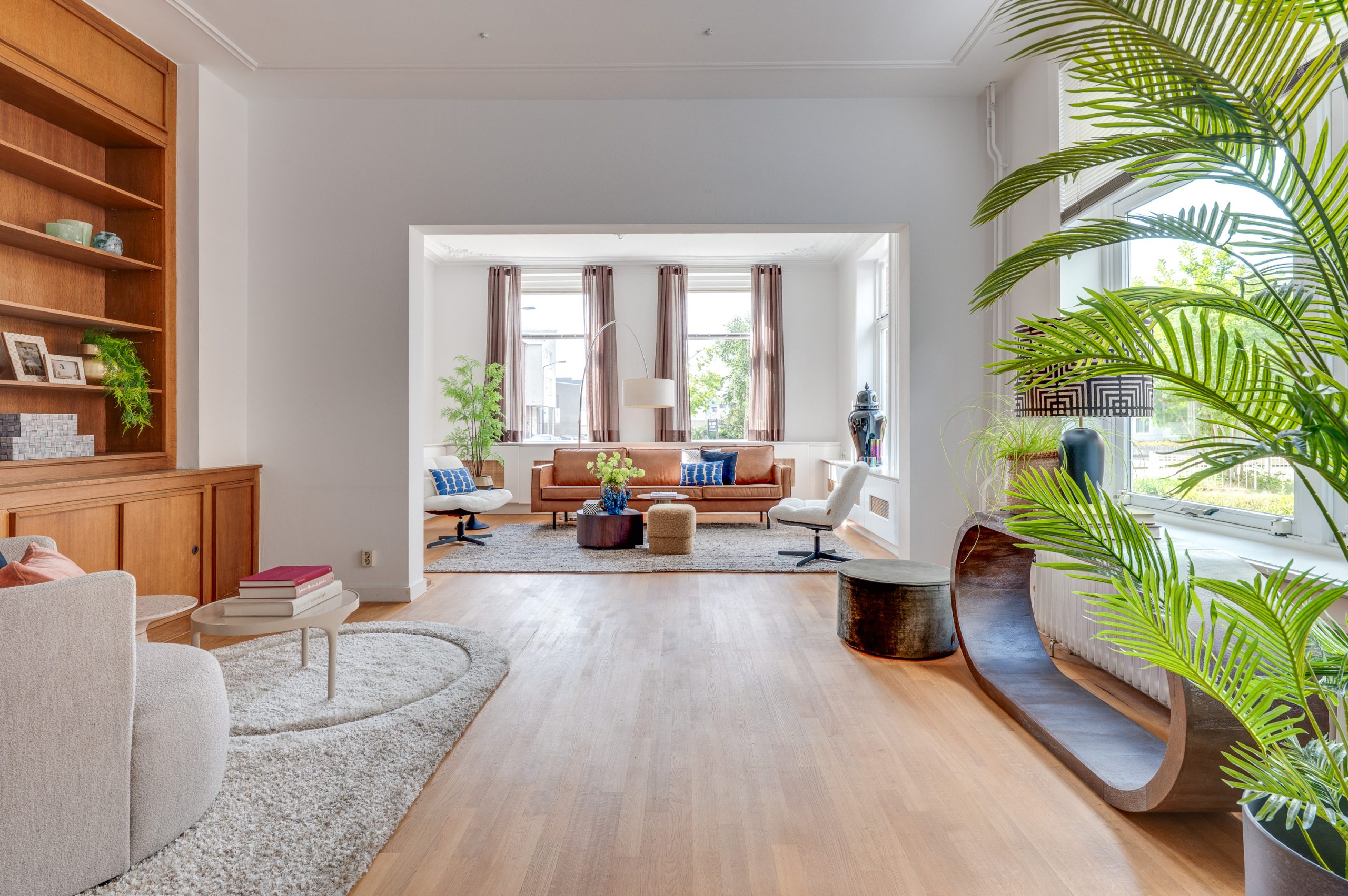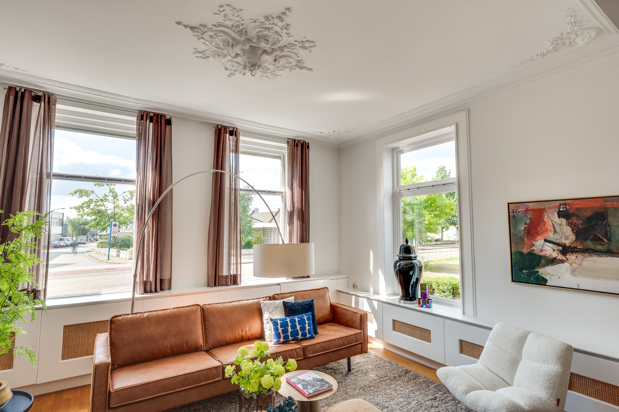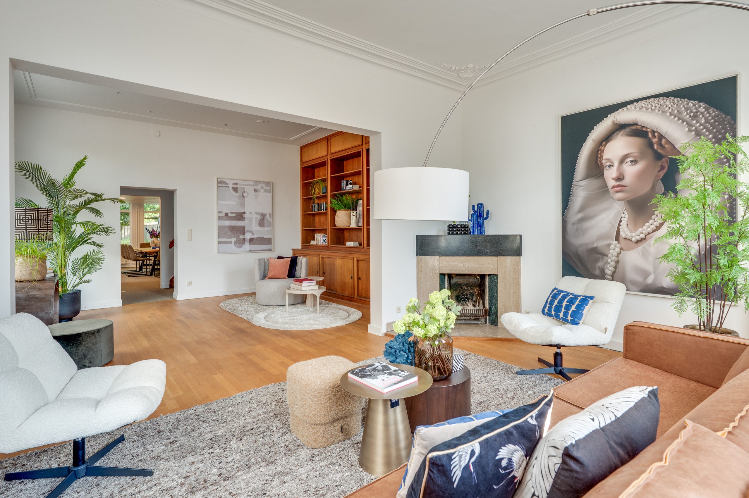 De prachtige en royale living aan de voorzijde van het pand is met recht een eyecatcher; een warme eiken parketvloer, hoge plafonds voorzien van originele ornamenten en een op maat gemaakte eiken wand- en boekenkast die reikt tot aan het hoge plafond, met praktische kastruimte aan de onderzijde. De karakteristieke hoek open haard, uitgevoerd in een combinatie van hardsteen en marmer, vormt een stijlvol middelpunt. Grote hoge raampartijen aan voor- en zijkant zorgen voor een overvloed aan natuurlijk licht en een aangenaam ruimtelijk gevoel.