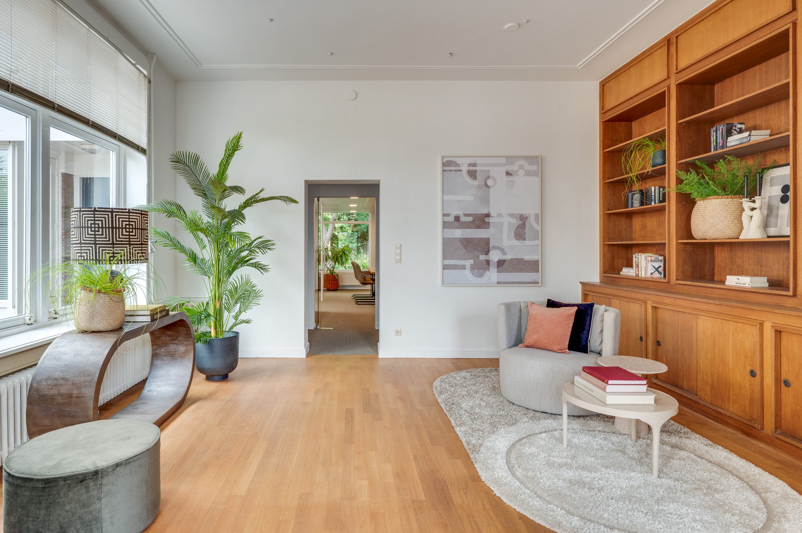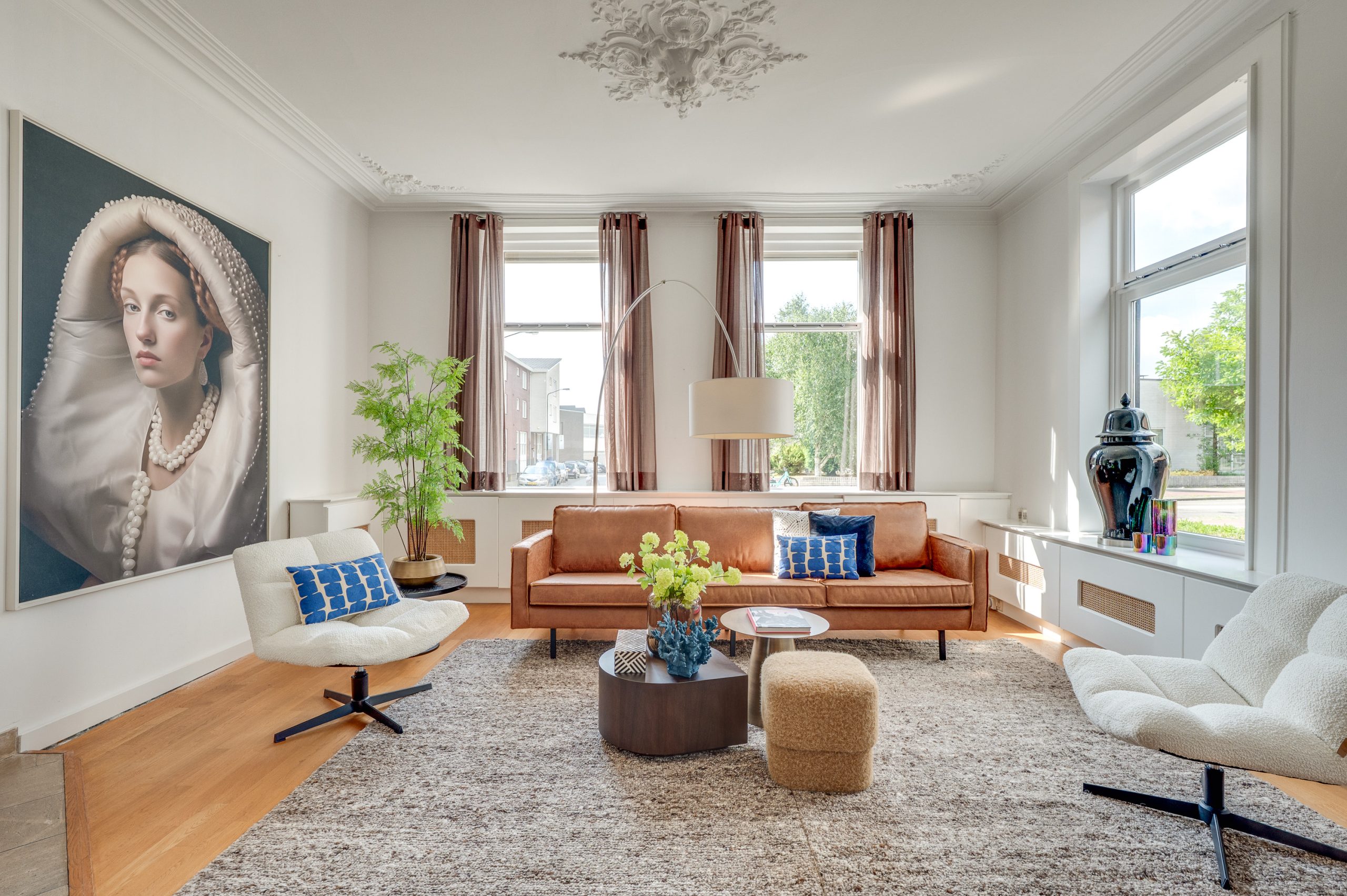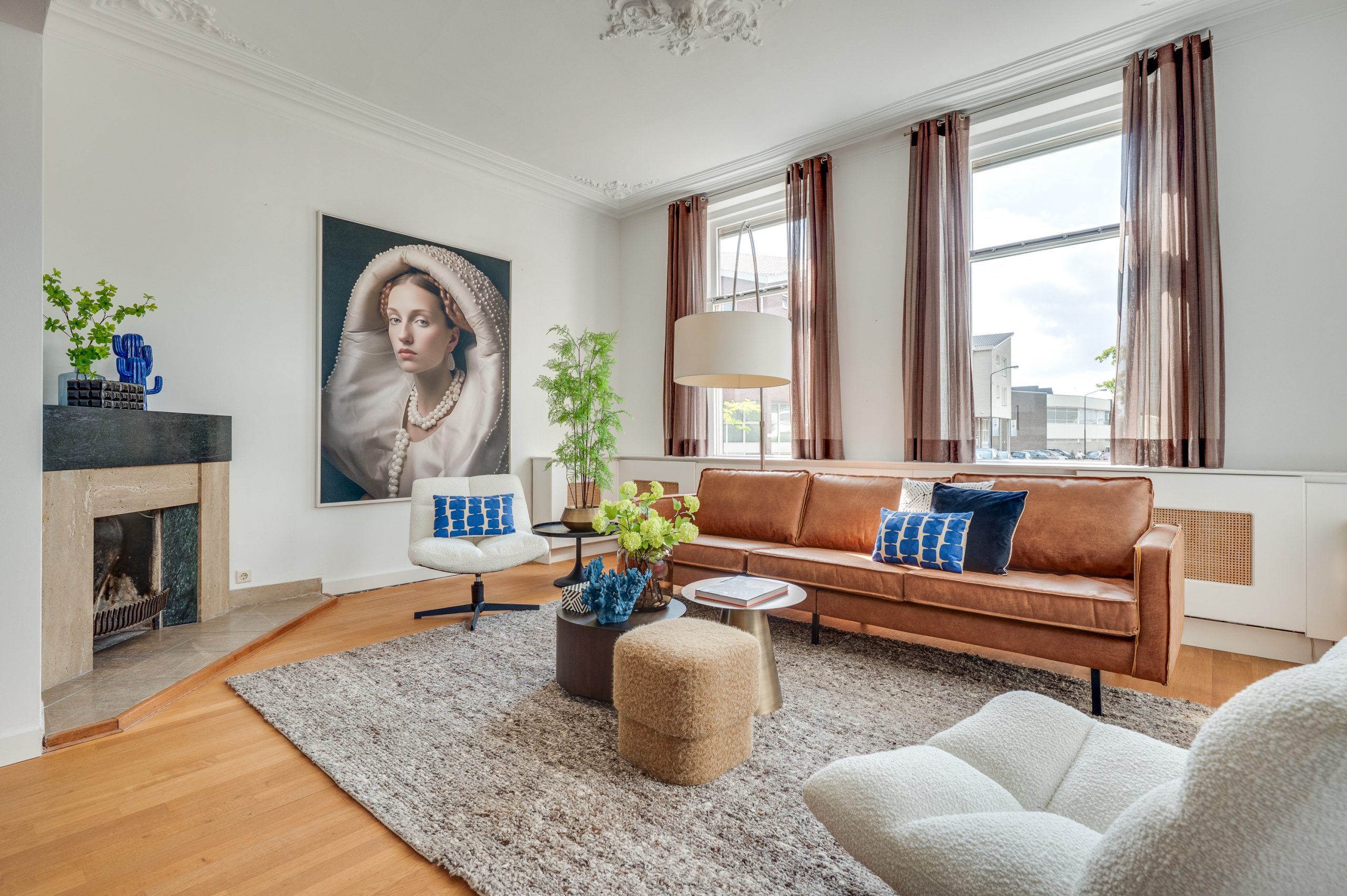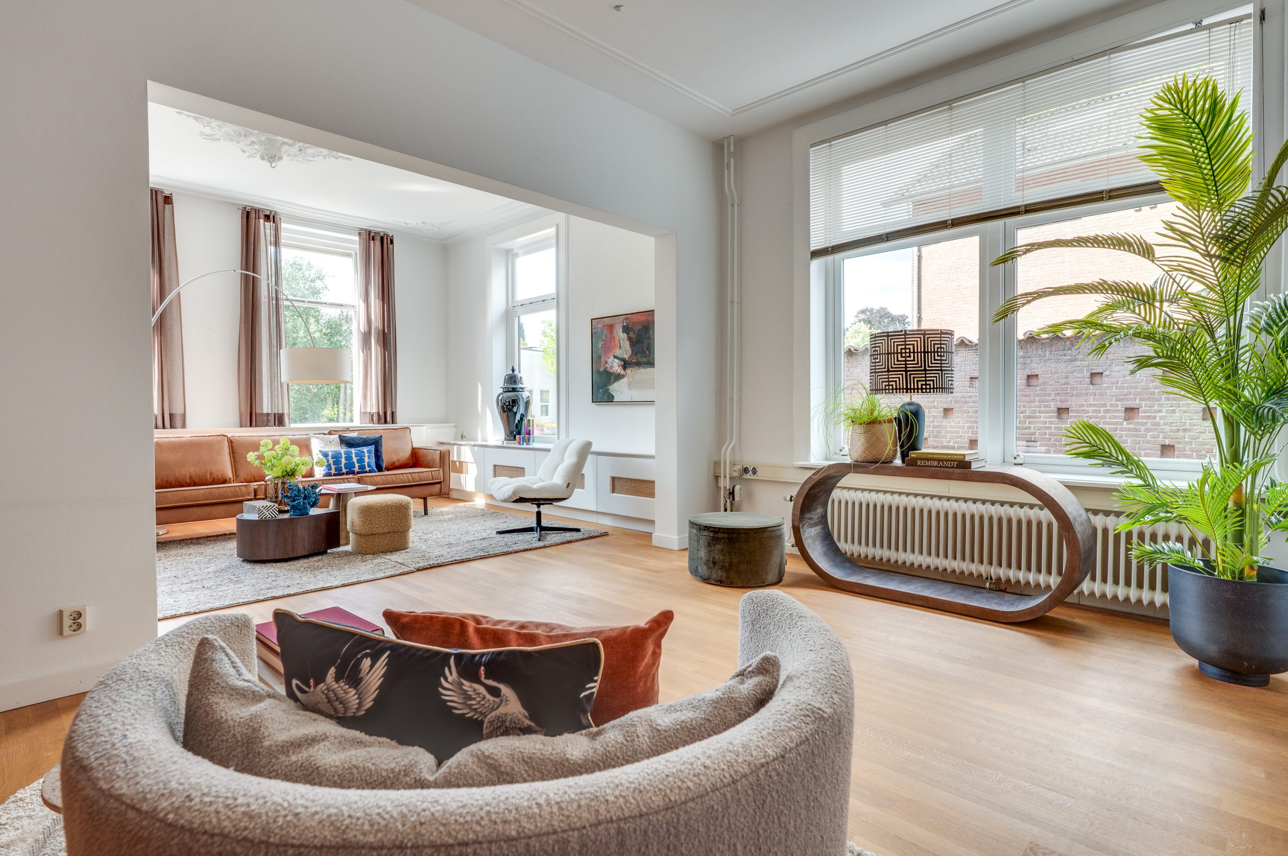 De prachtige en royale living aan de voorzijde van het pand is met recht een eyecatcher; een warme eiken parketvloer, hoge plafonds voorzien van originele ornamenten en een op maat gemaakte eiken wand- en boekenkast die reikt tot aan het hoge plafond, met praktische kastruimte aan de onderzijde. De karakteristieke hoek open haard, uitgevoerd in een combinatie van hardsteen en marmer, vormt een stijlvol middelpunt. Grote hoge raampartijen aan voor- en zijkant zorgen voor een overvloed aan natuurlijk licht en een aangenaam ruimtelijk gevoel.