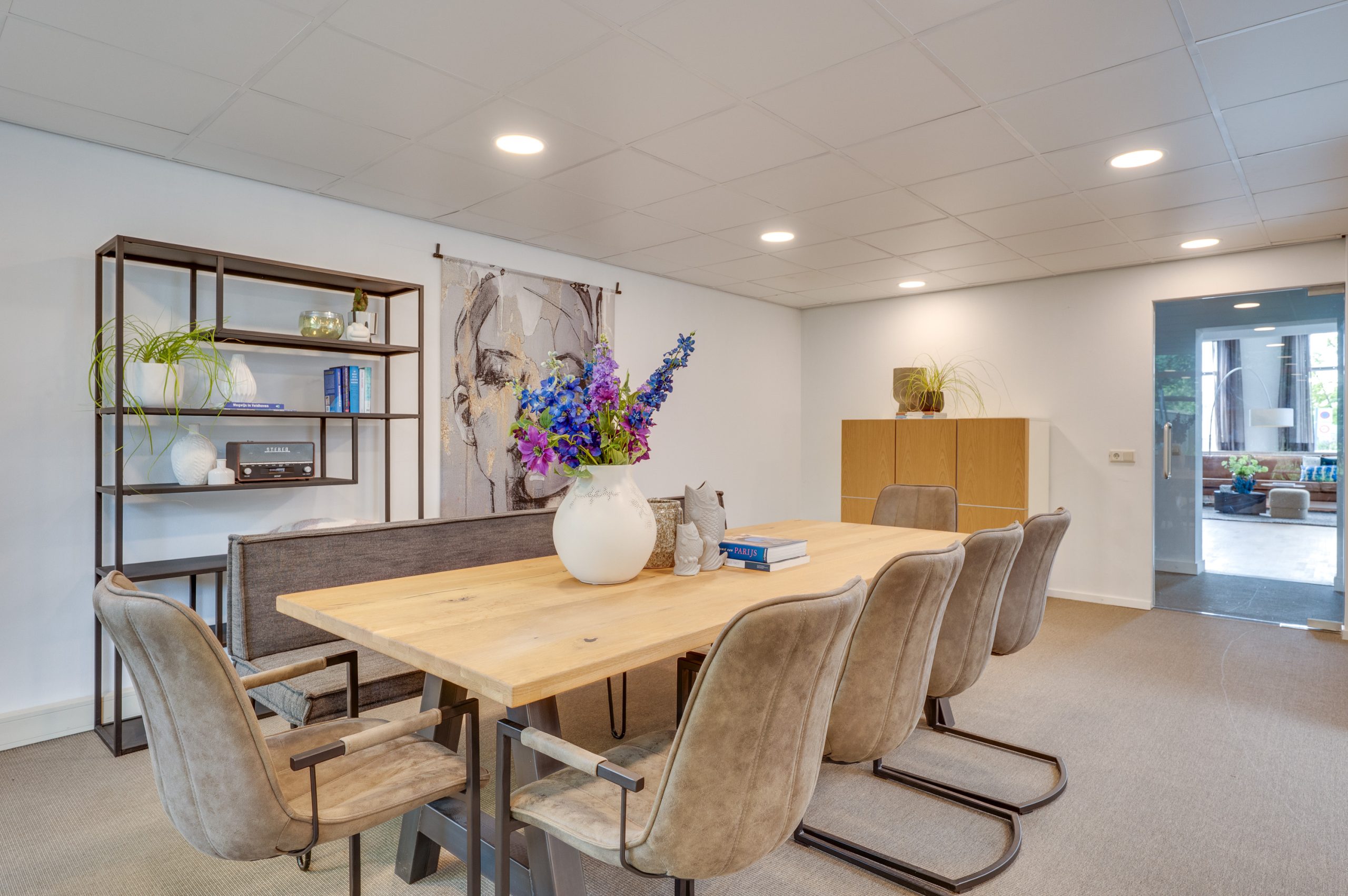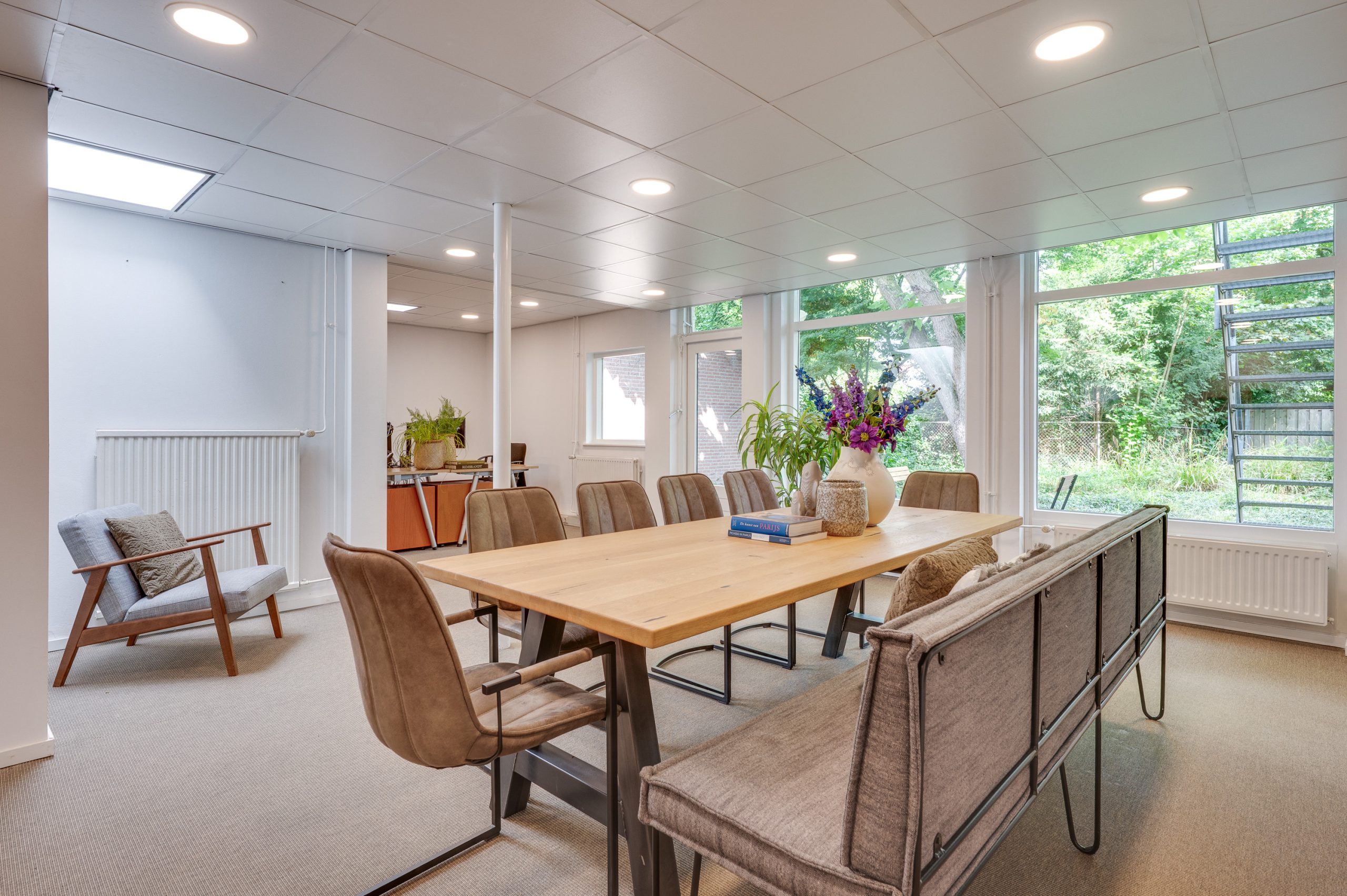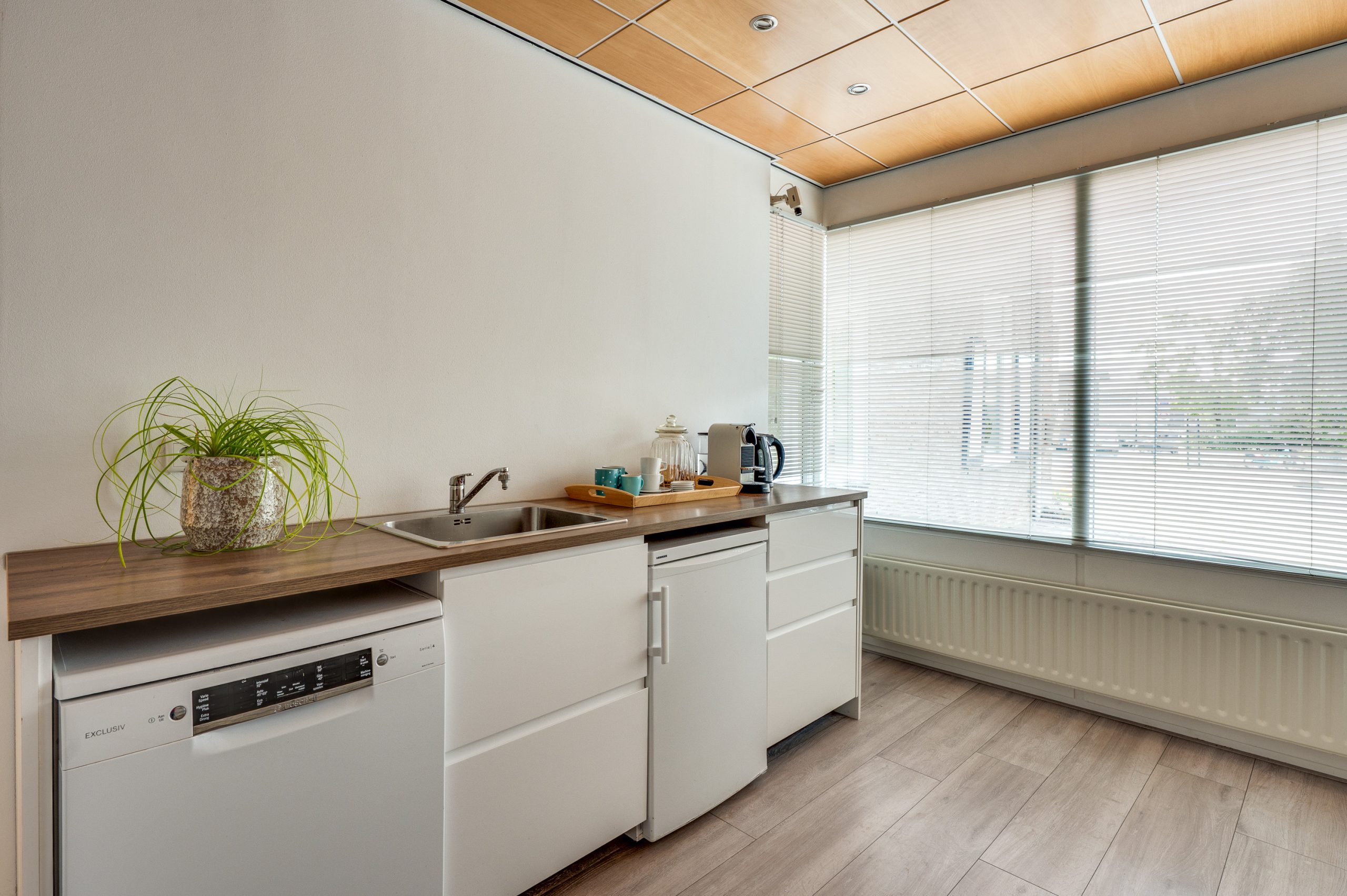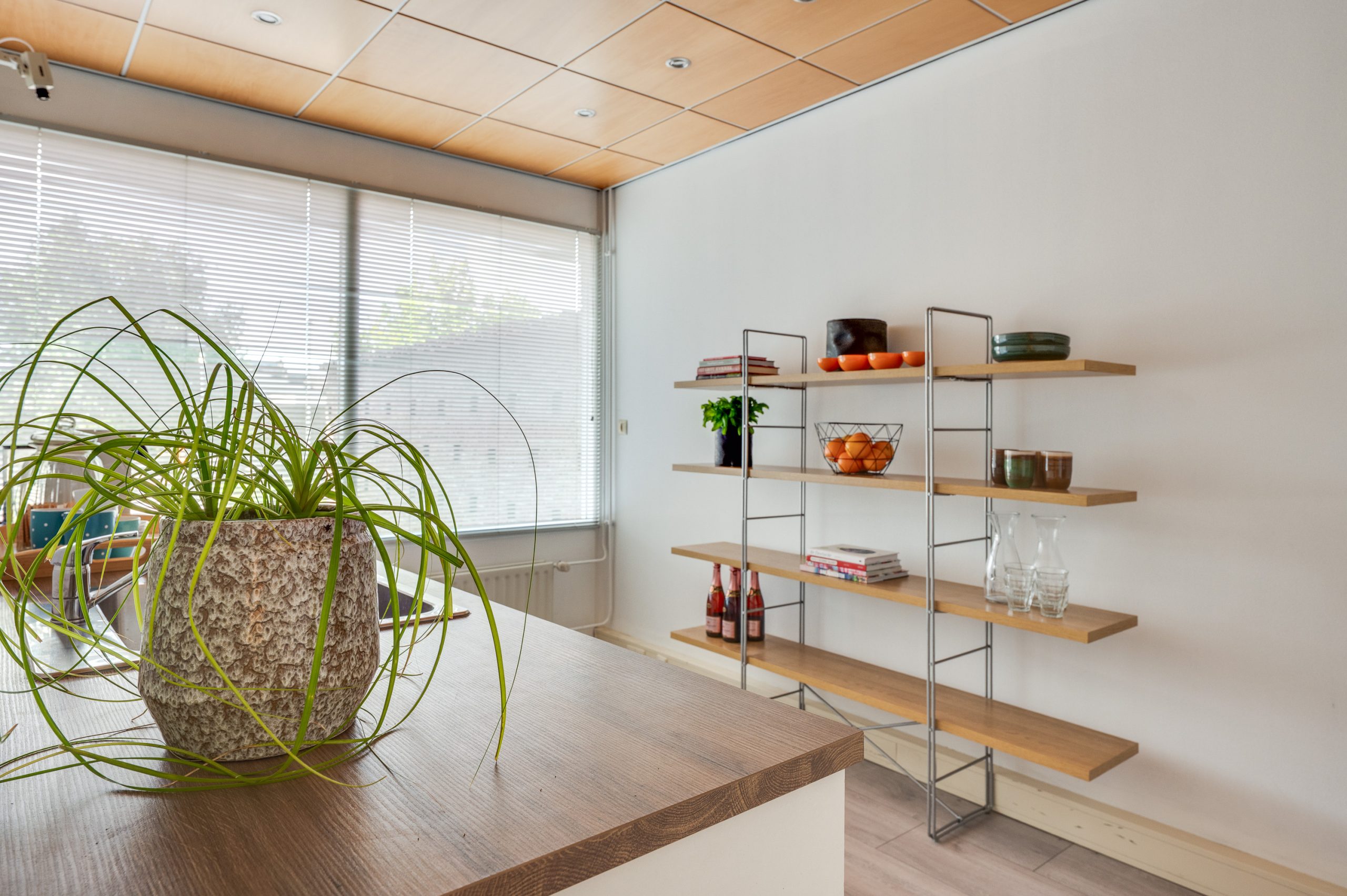 Aangrenzend aan de eetkamer bevindt zich de ruime bijkeuken, momenteel in gebruik als pantry van de voormalige kantoorruimte. Door de raampartij aan de voorzijde ook ideaal te gebruiken als kantoorruimte/speelkamer/thuiswerkplek.