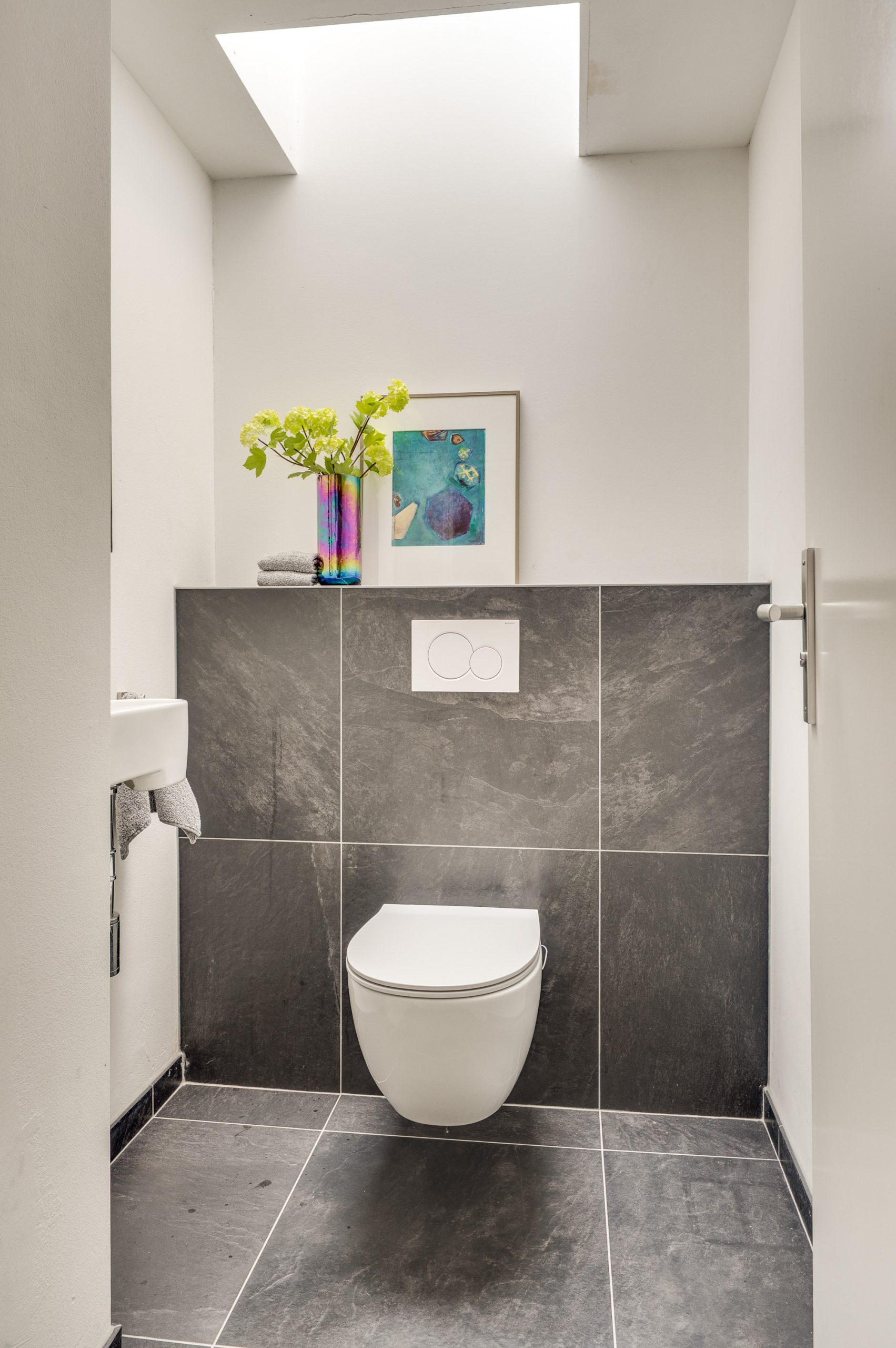 De toiletruimte is deels betegeld en heeft een fontein, wandcloset, mechanische afzuiging en daglichttoetreding aan bovenzijde middels een lichtkoepel.