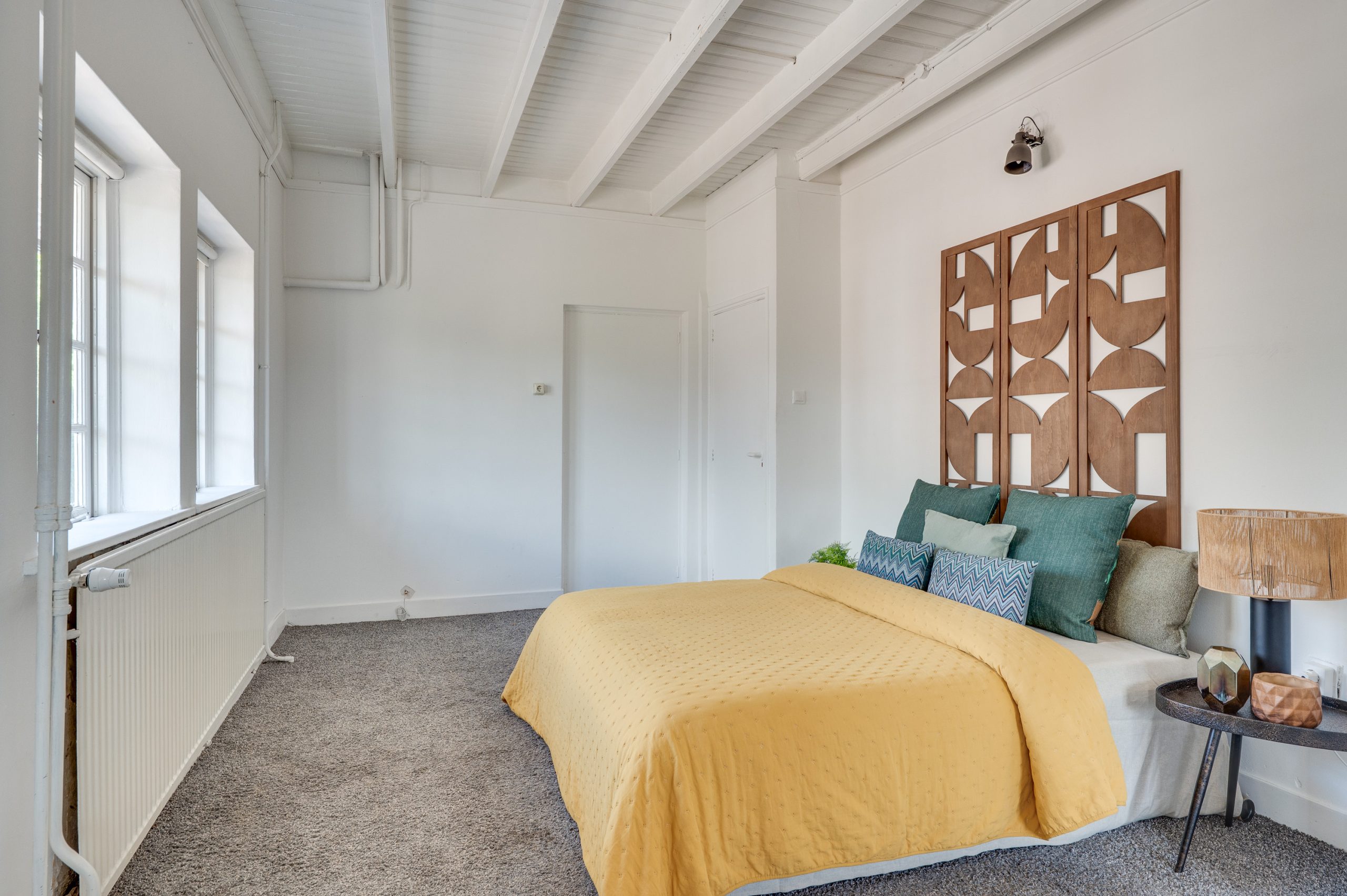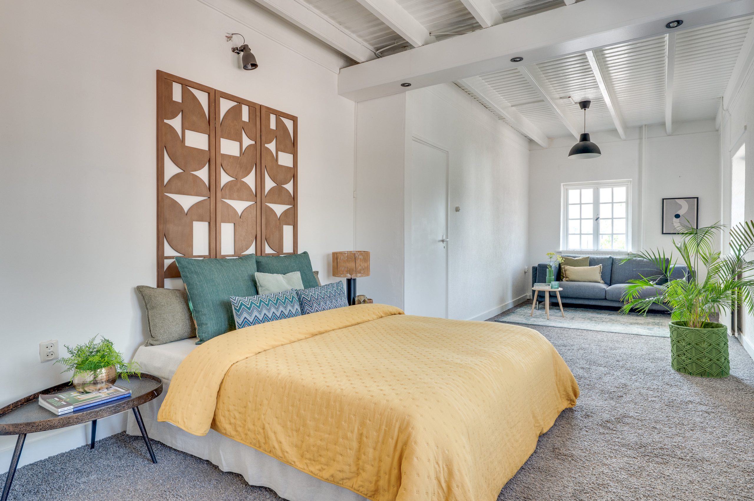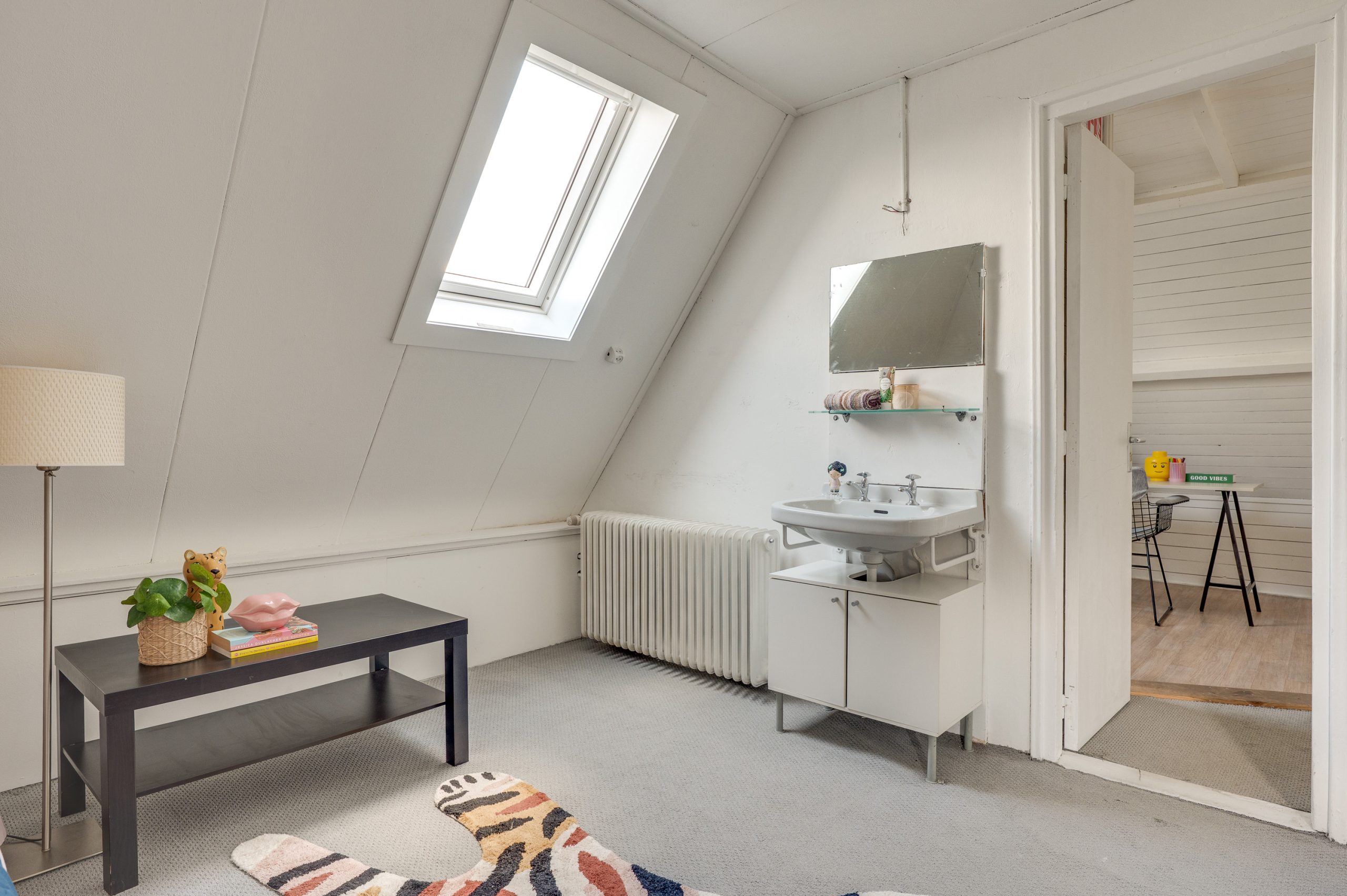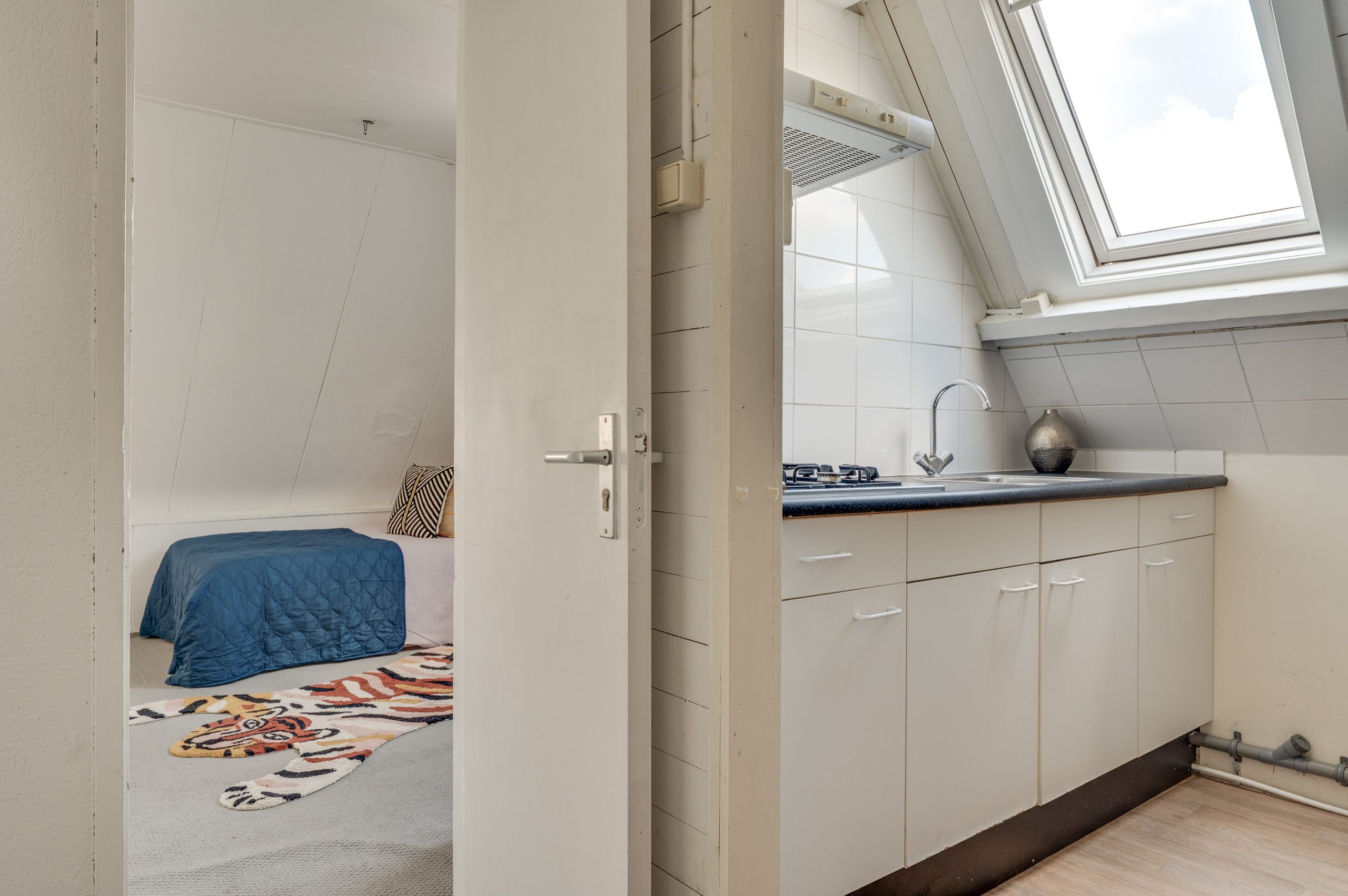 Via een vaste open trap kom je op de ruime en lichte tweede verdieping, ingericht als werkplek of extra slaapkamer. Aan de linkerzijde bevindt zich een sfeervolle slaapkamer met eigen wastafel, een Velux dakraam en een vlizotrap die toegang geeft tot de bergzolder. Aan het begin van deze verdieping vind je een tweede keukentje, voorzien van een gaskookplaat, gootsteen, afzuigkap, witte wandtegels en aansluiting voor de wasmachine. Deze verdieping is ideaal als gastenverblijf, hobbyruimte, tienerparadijs of zelfs als werkplek aan huis.