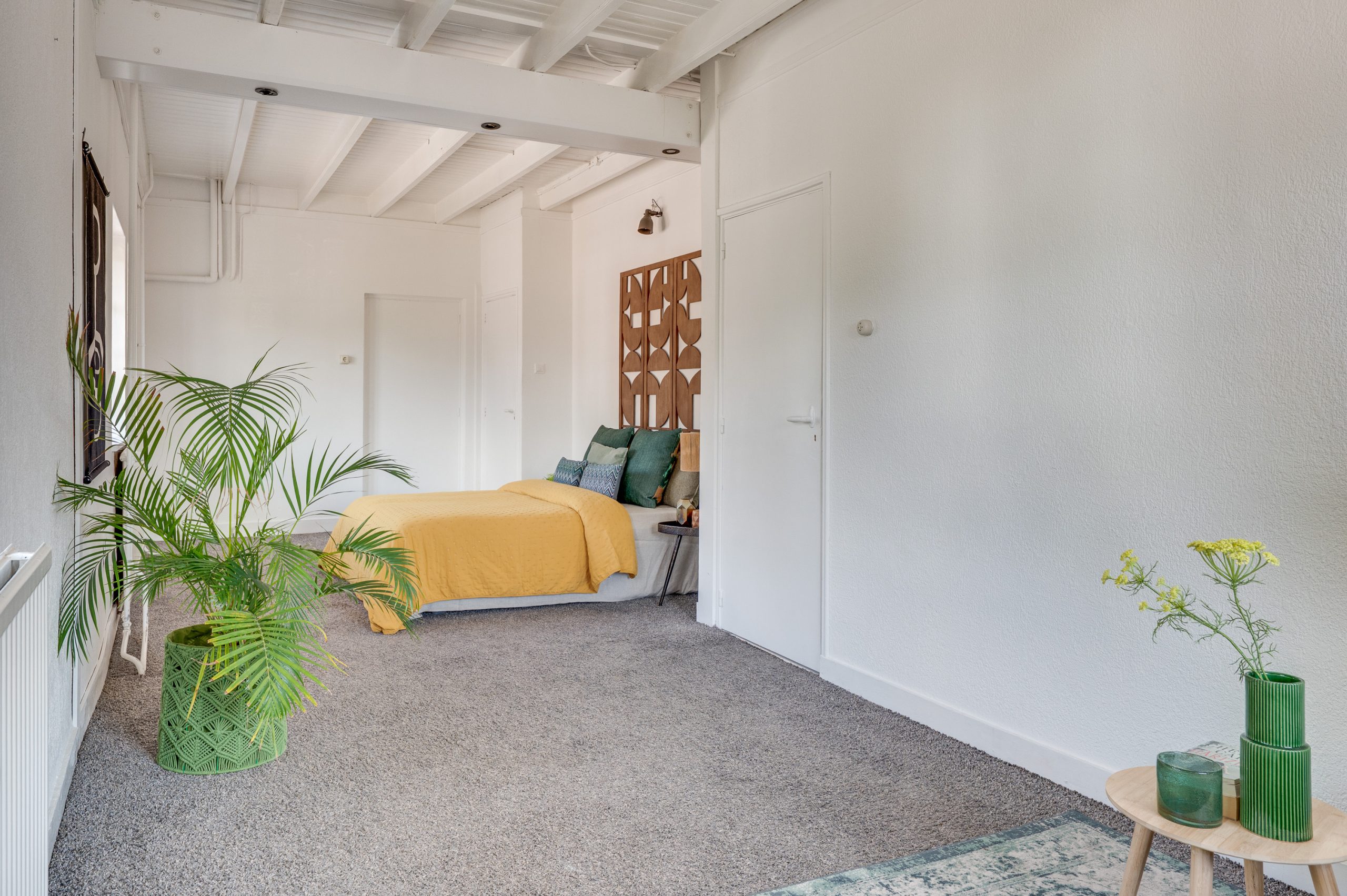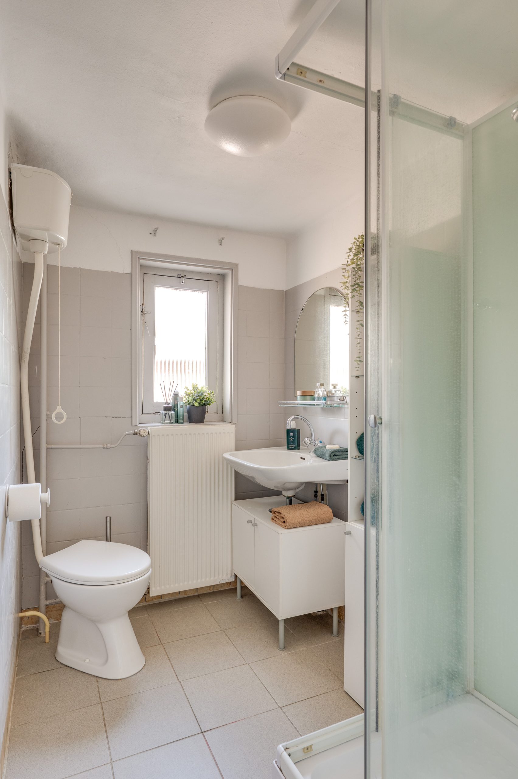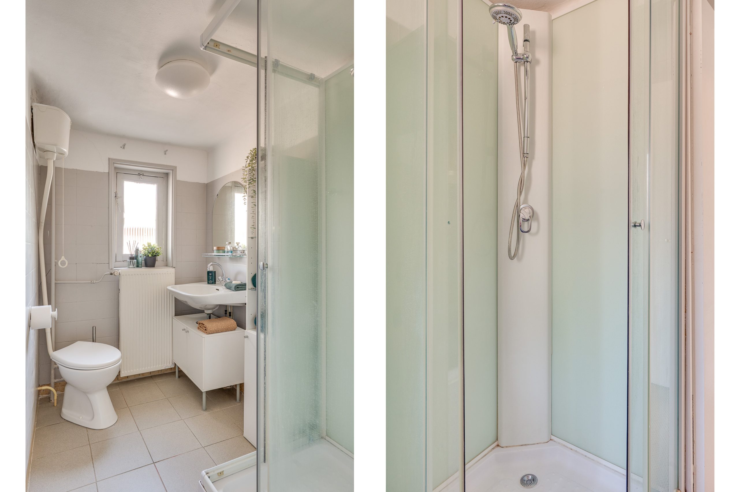 De eerste verdieping is voorzien van vloerbedekking en biedt verrassend veel ruimte en mogelijkheden. Aan de rechterzijde bevindt zich een royale slaapkamer, die dankzij de aanwezigheid van twee toegangsdeuren eenvoudig is op te splitsen in twee volwaardige kamers. Aan de voorzijde ligt een tweede slaapkamer met ingebouwde kast, perfect als kinderkamer, werkkamer of logeerruimte. De te moderniseren badkamer beschikt over een douchecabine, wastafel met onderkastje en een kiepraam dat zorgt voor natuurlijk daglicht en lucht. Aan de achterzijde biedt een deur toegang tot het dakterras.