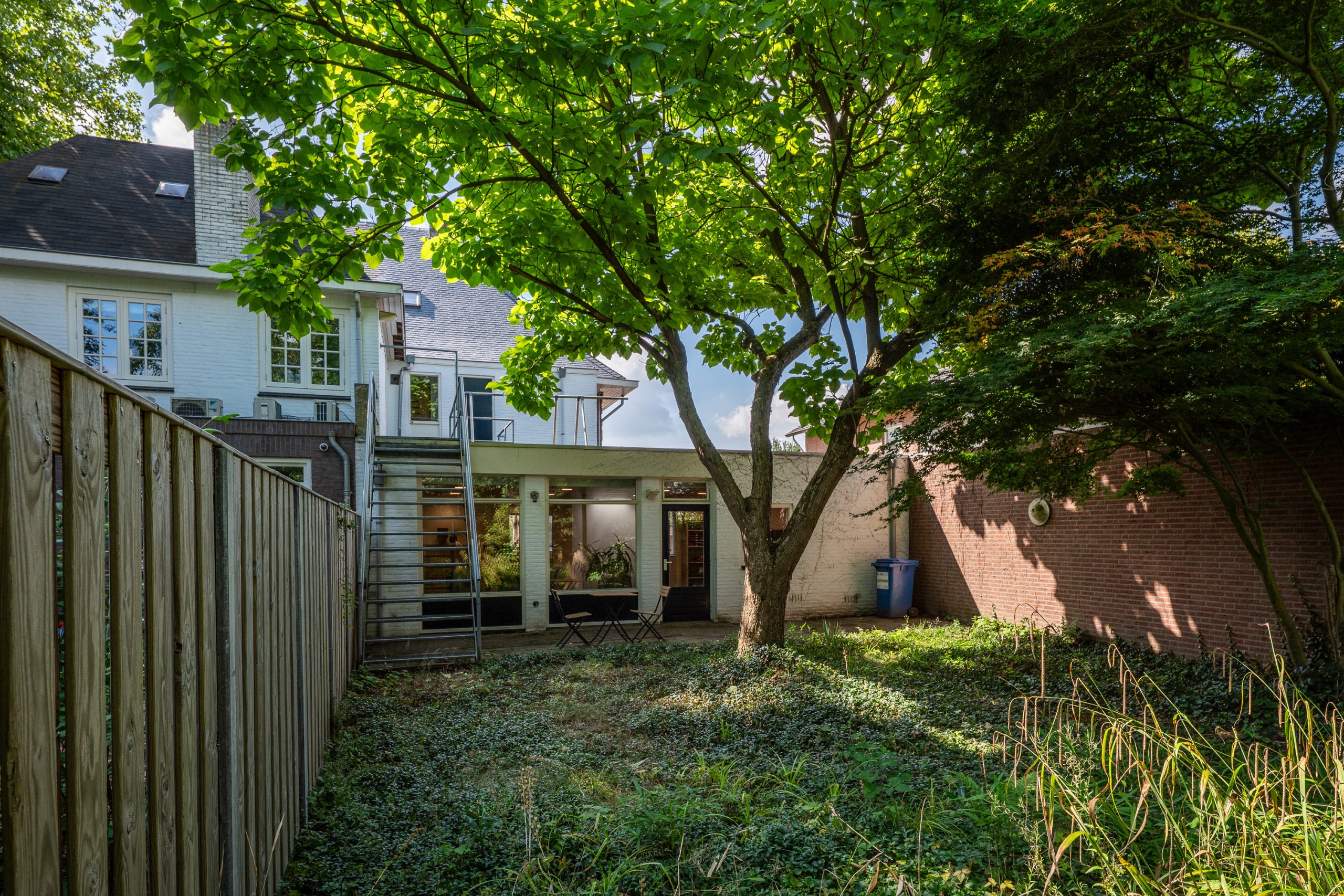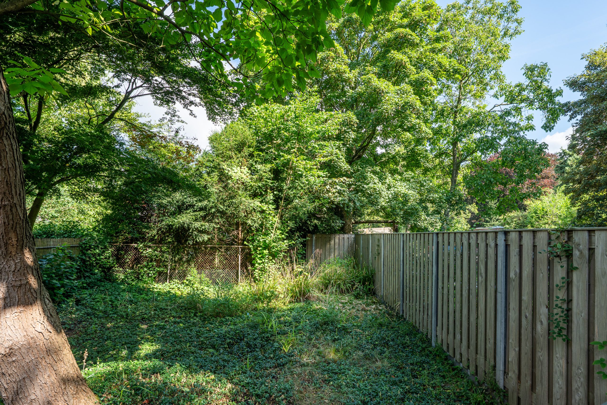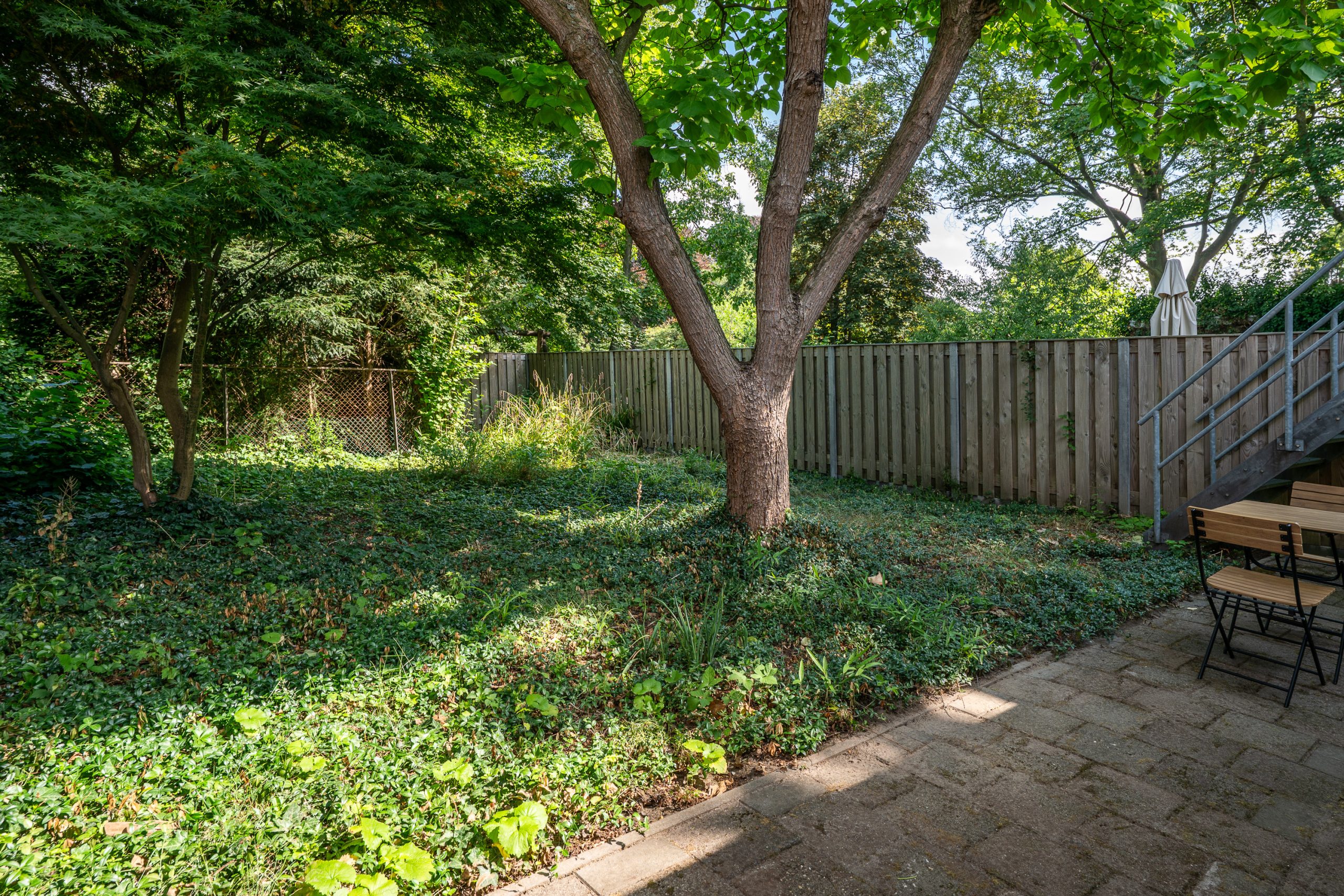 De achtertuin straalt rust en privacy uit en wordt gekenmerkt door een grote trompetboom die voor aangename schaduw zorgt. Daarnaast staat er een Japanse esdoorn die met zijn verfijnde blad een mooi accent geeft aan het geheel. De tuin is grotendeels begroeid met bodembedekkers en heeft een natuurlijke, volwassen uitstraling. Voor wie van groen houdt is dit een tuin met volop mogelijkheden. Met een slimme inrichting is hier eenvoudig een sfeervolle onderhoudsarme buitenruimte van te maken waar je het hele jaar van kunt genieten.