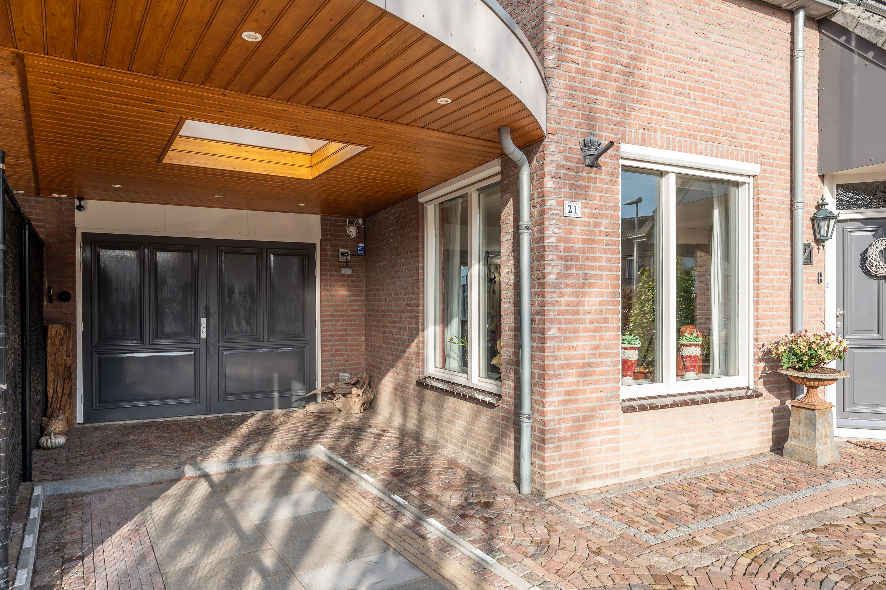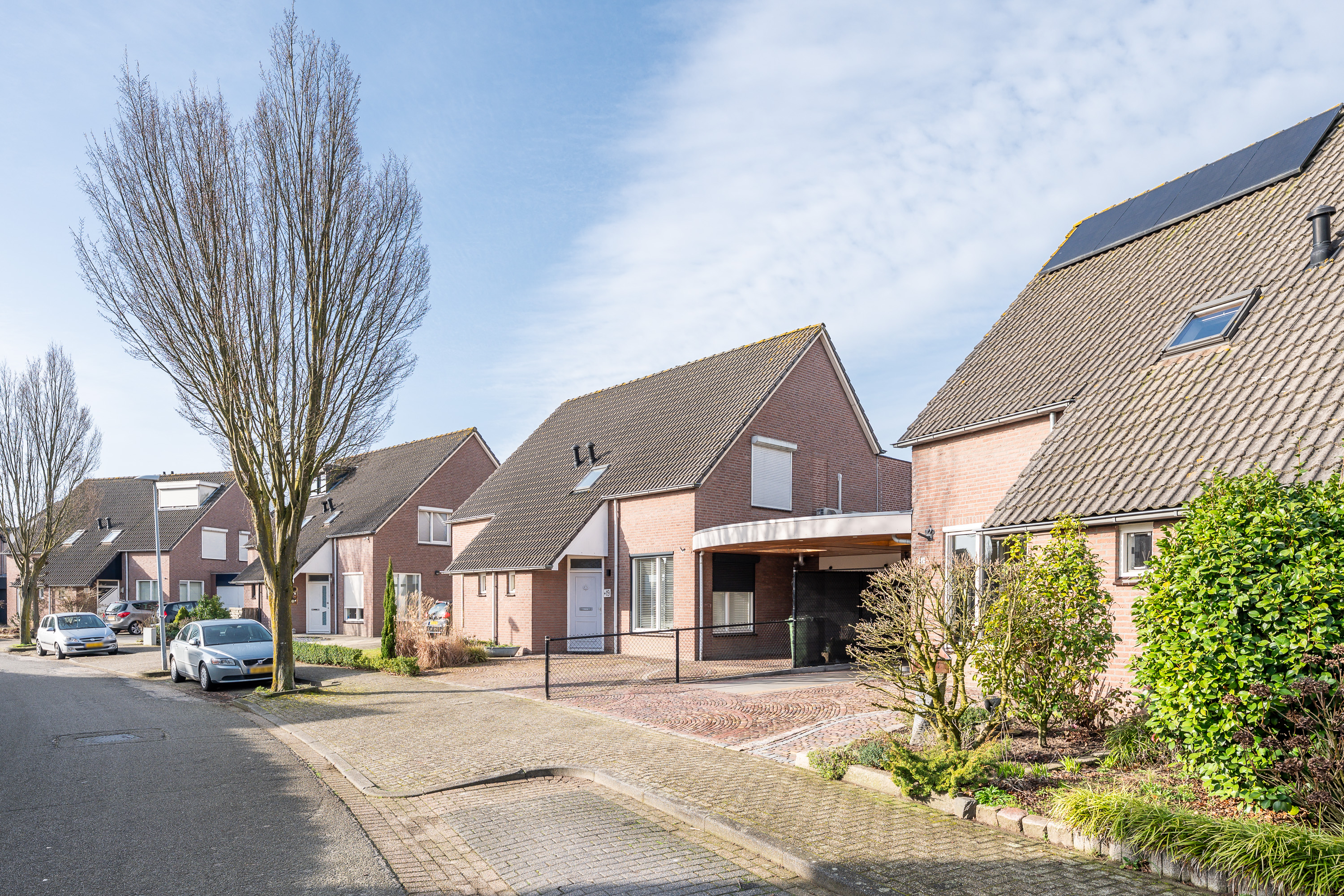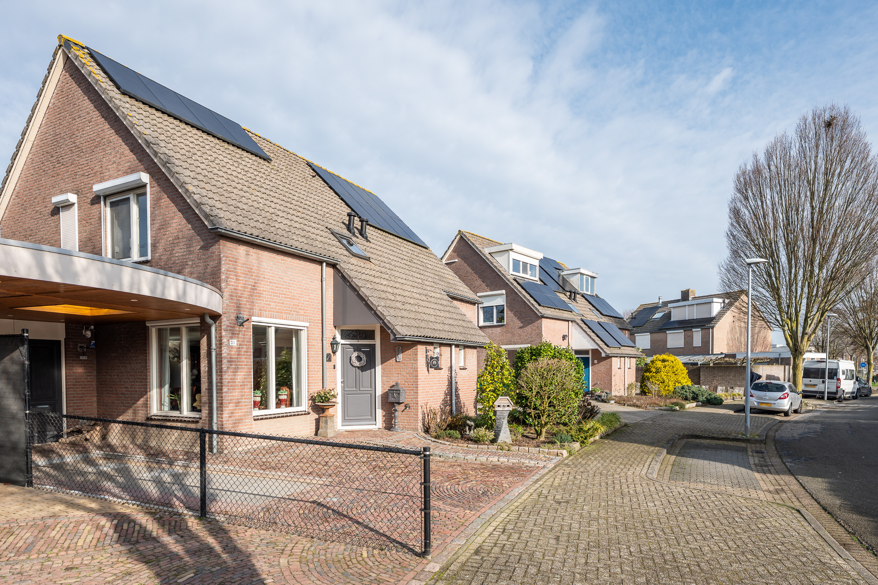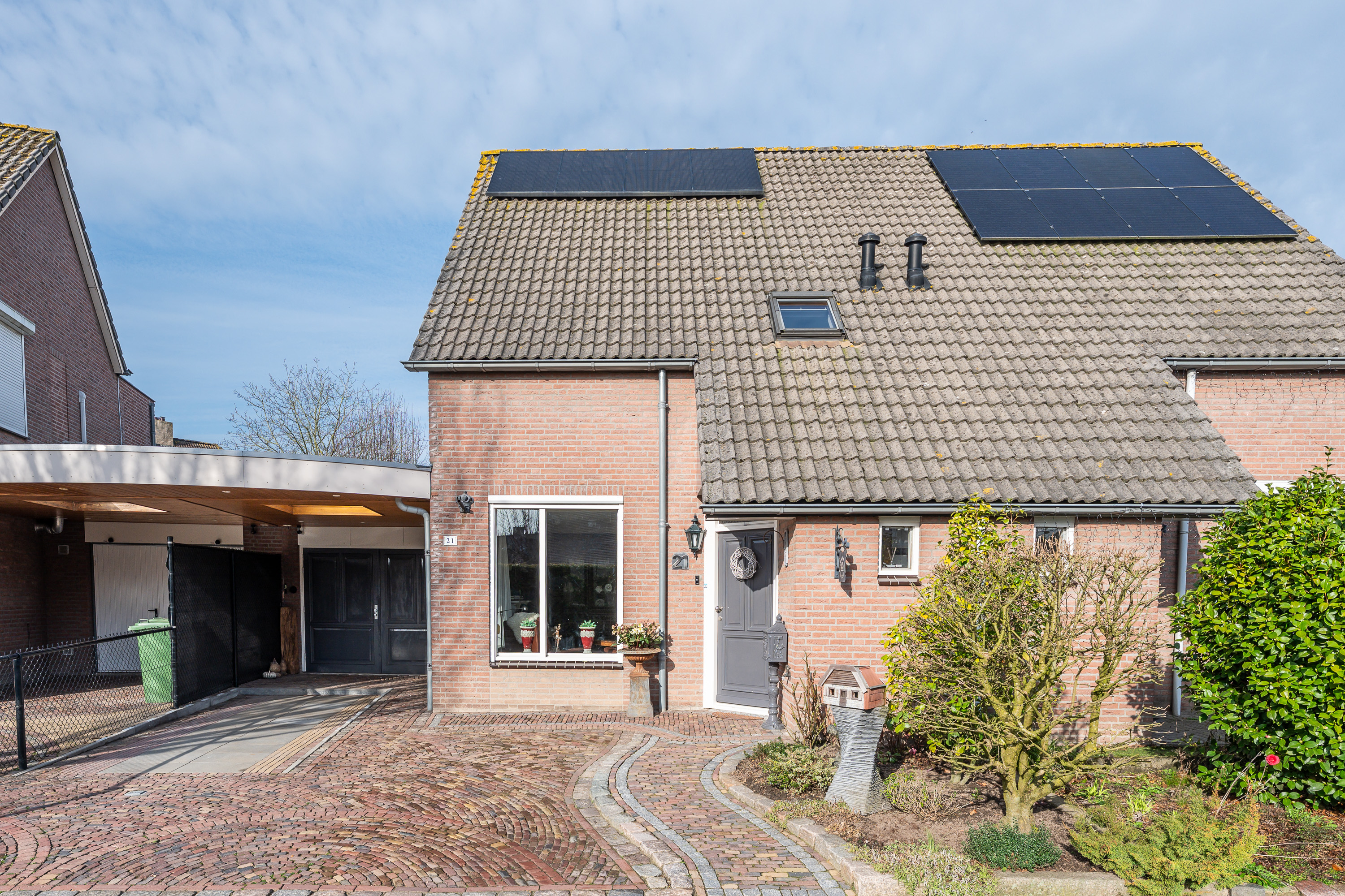 Via de brede, fraai aangelegde oprit met sierbestrating bereikt u deze goed onderhouden woning. De verzorgde voortuin, met aandacht aangelegd en groen omlijst, zorgt direct voor een prettige eerste indruk. Onder de carport staat uw auto beschut en droog.