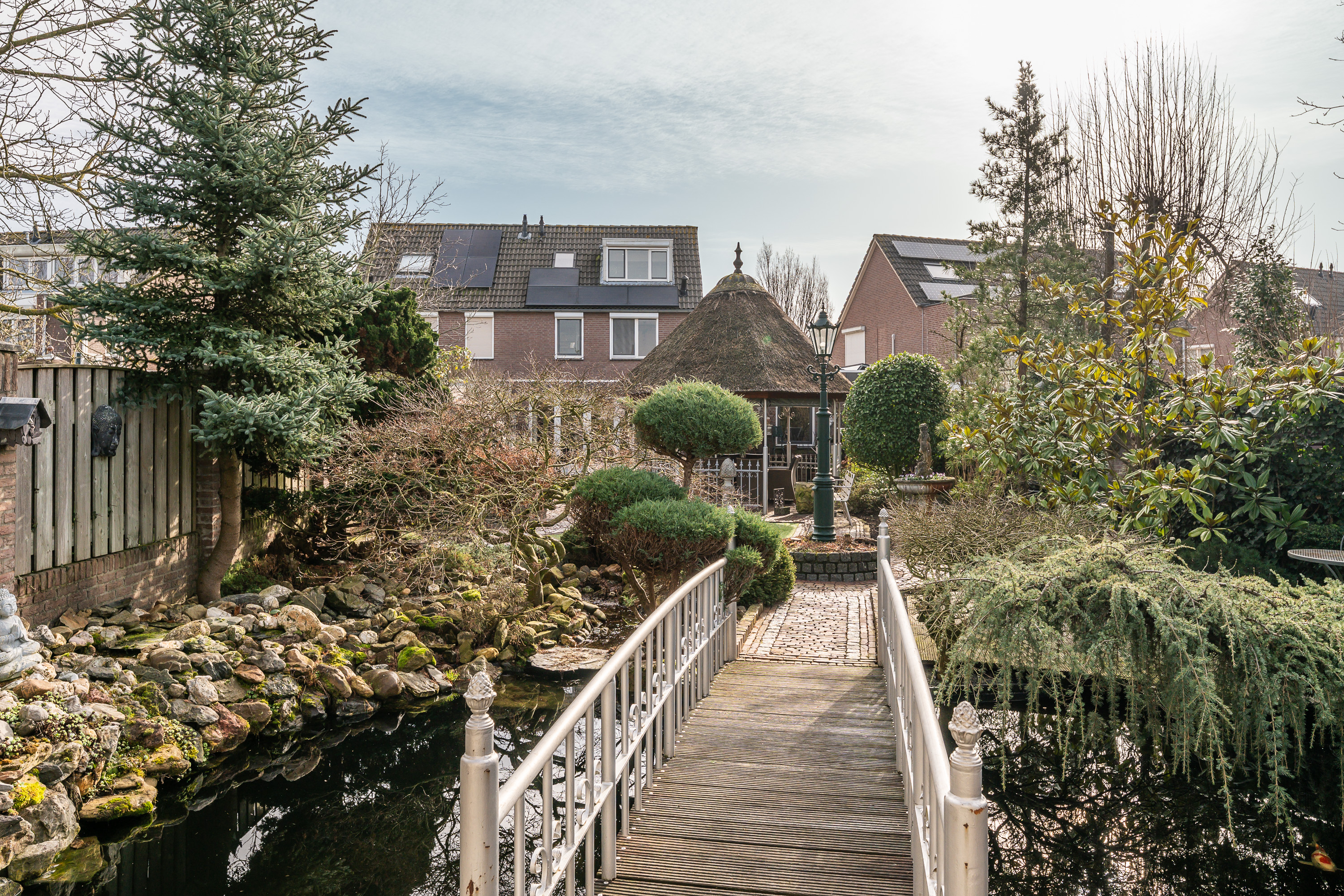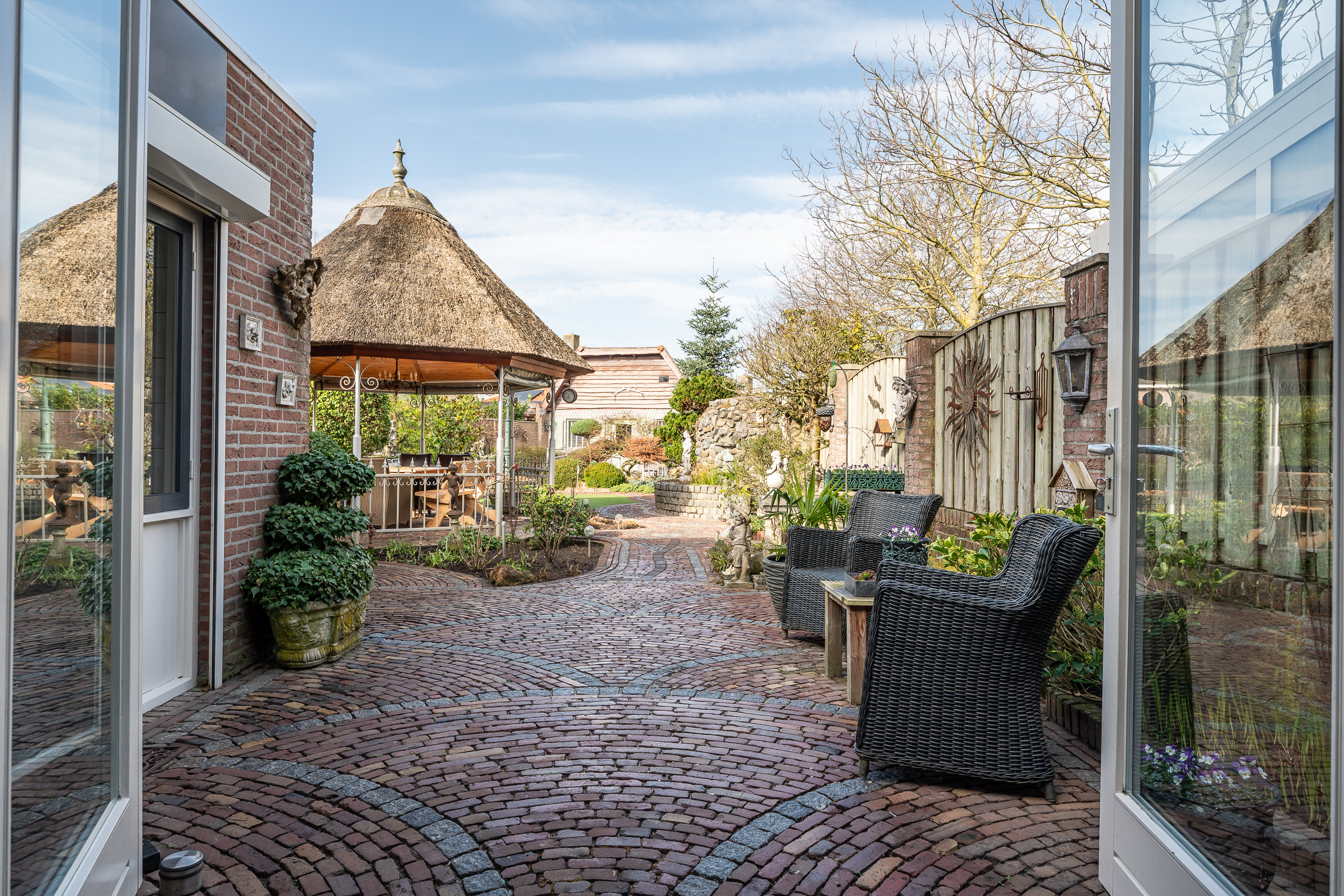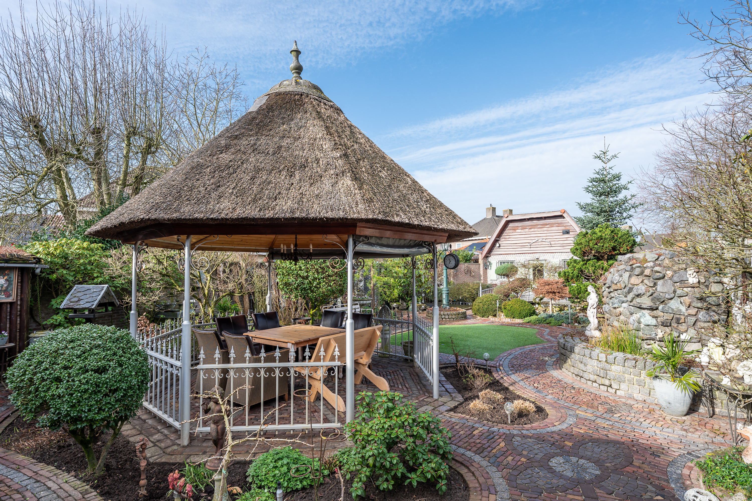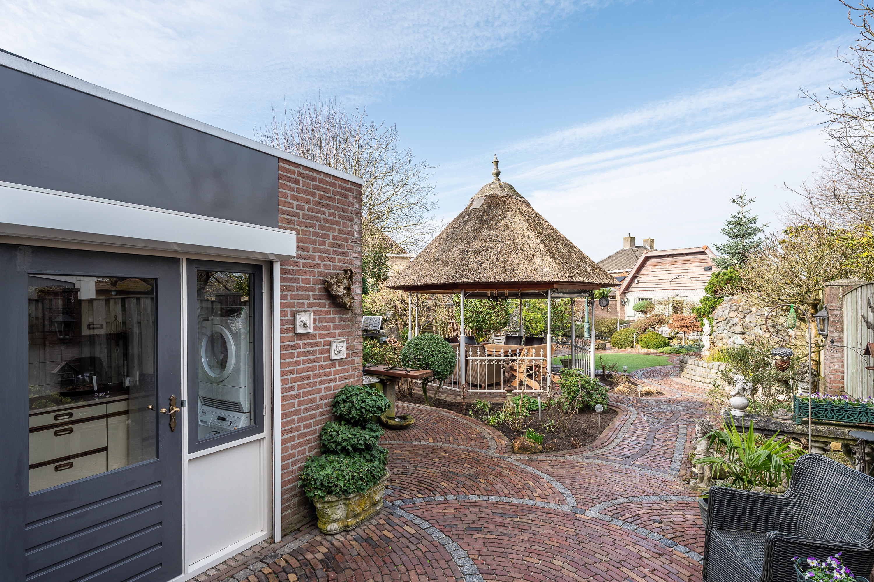 De woning beschikt over een bijzonder diepe en sfeervol aangelegde achtertuin, waar u volop kunt genieten van rust, groen en privacy. De tuin is deels voorzien van sierbestrating en deels van kunstgras, wat zorgt voor een onderhoudsvriendelijk geheel met een verzorgde uitstraling. Verspreid door de tuin vindt u diverse bordessen met gevarieerde beplanting en meerdere zitmogelijkheden, waardoor u op elk moment van de dag een fijne plek in zon of schaduw kunt kiezen. Het karakteristieke prieel met rietgedekt dak vormt een echte blikvanger en biedt een beschutte plek om lange avonden comfortabel door te brengen. De tuin beschikt over verlichting, welke per zone naar wens instelbaar is en hij is volledig omheind met een onderhoudsarme omheining.