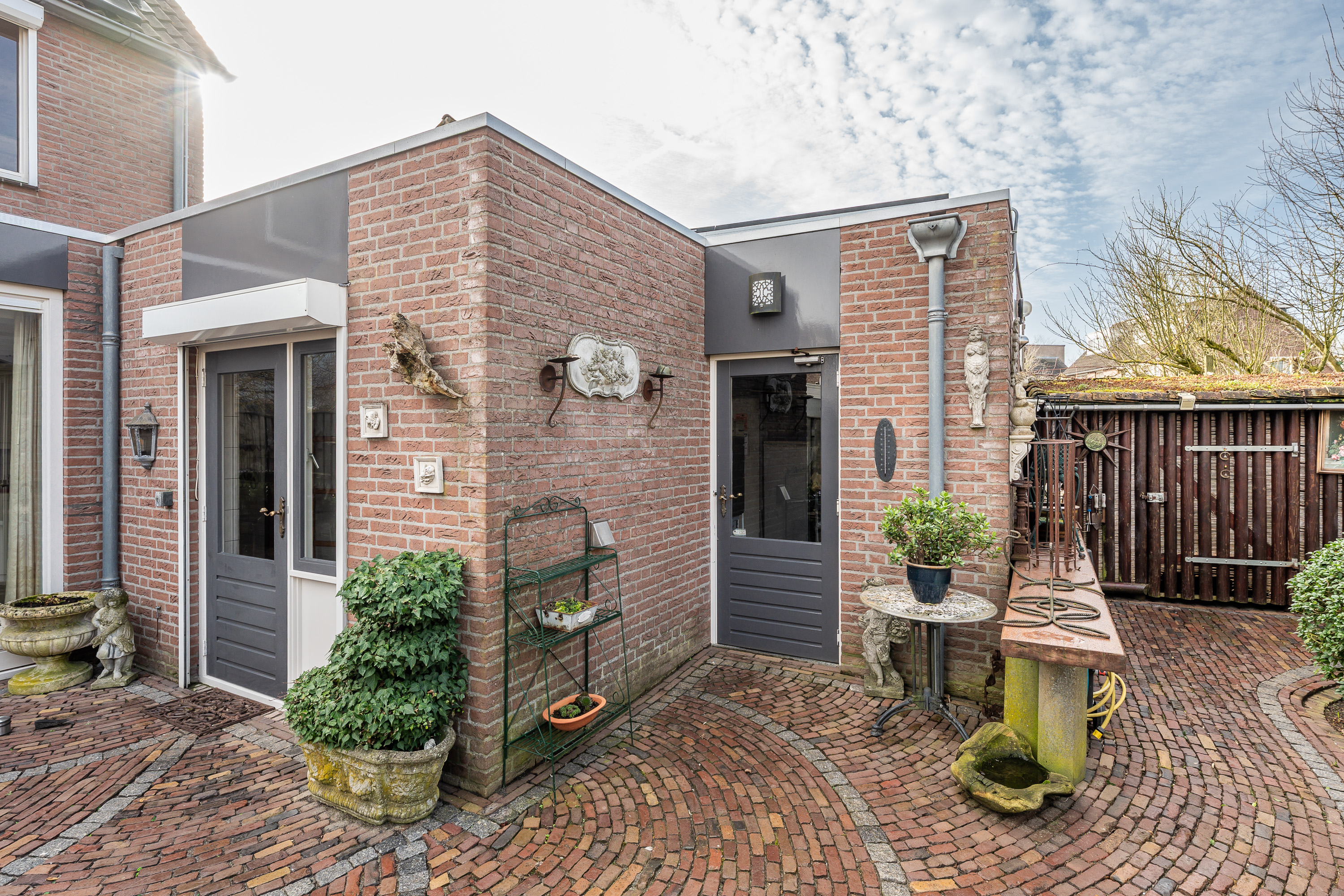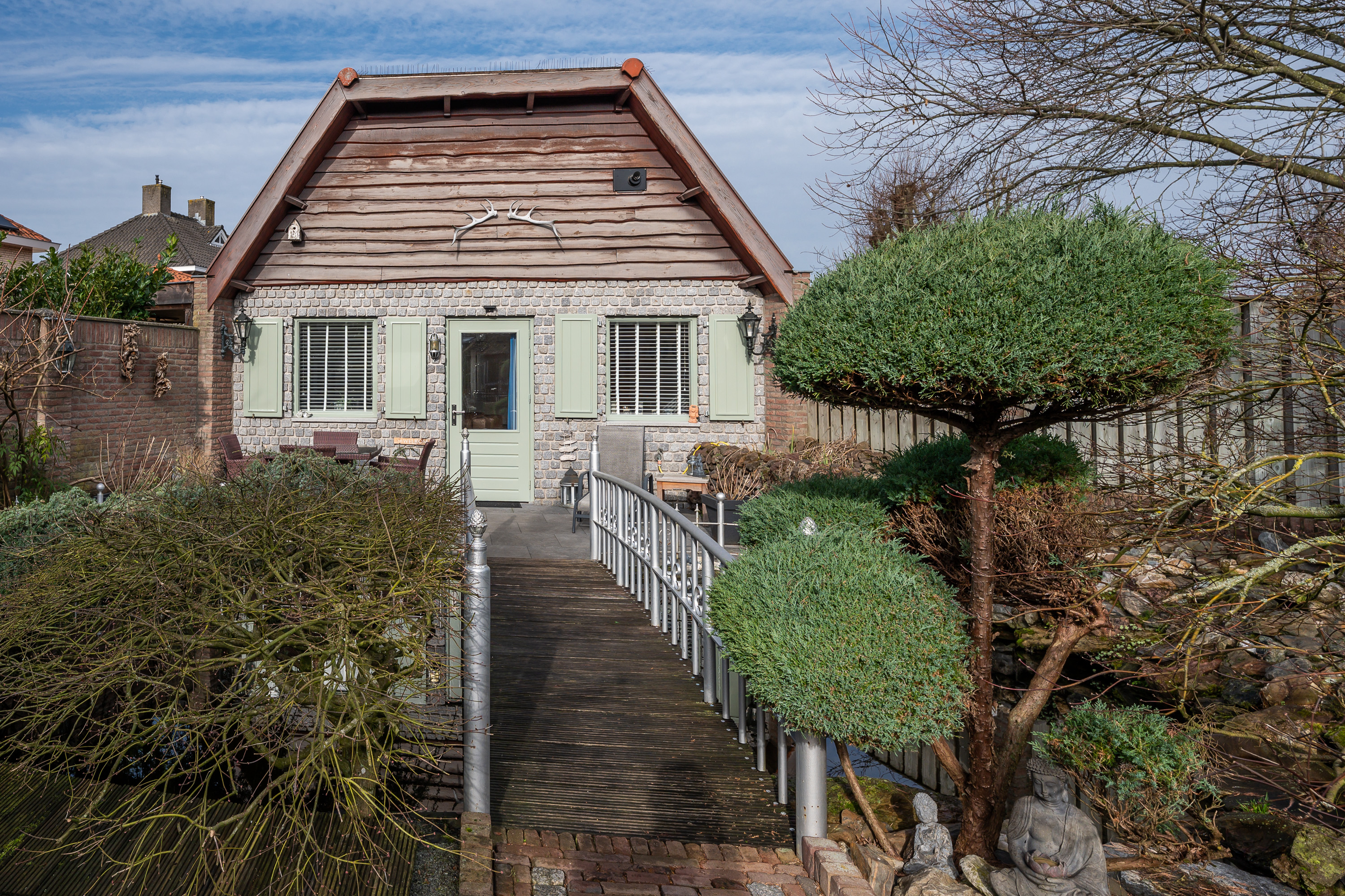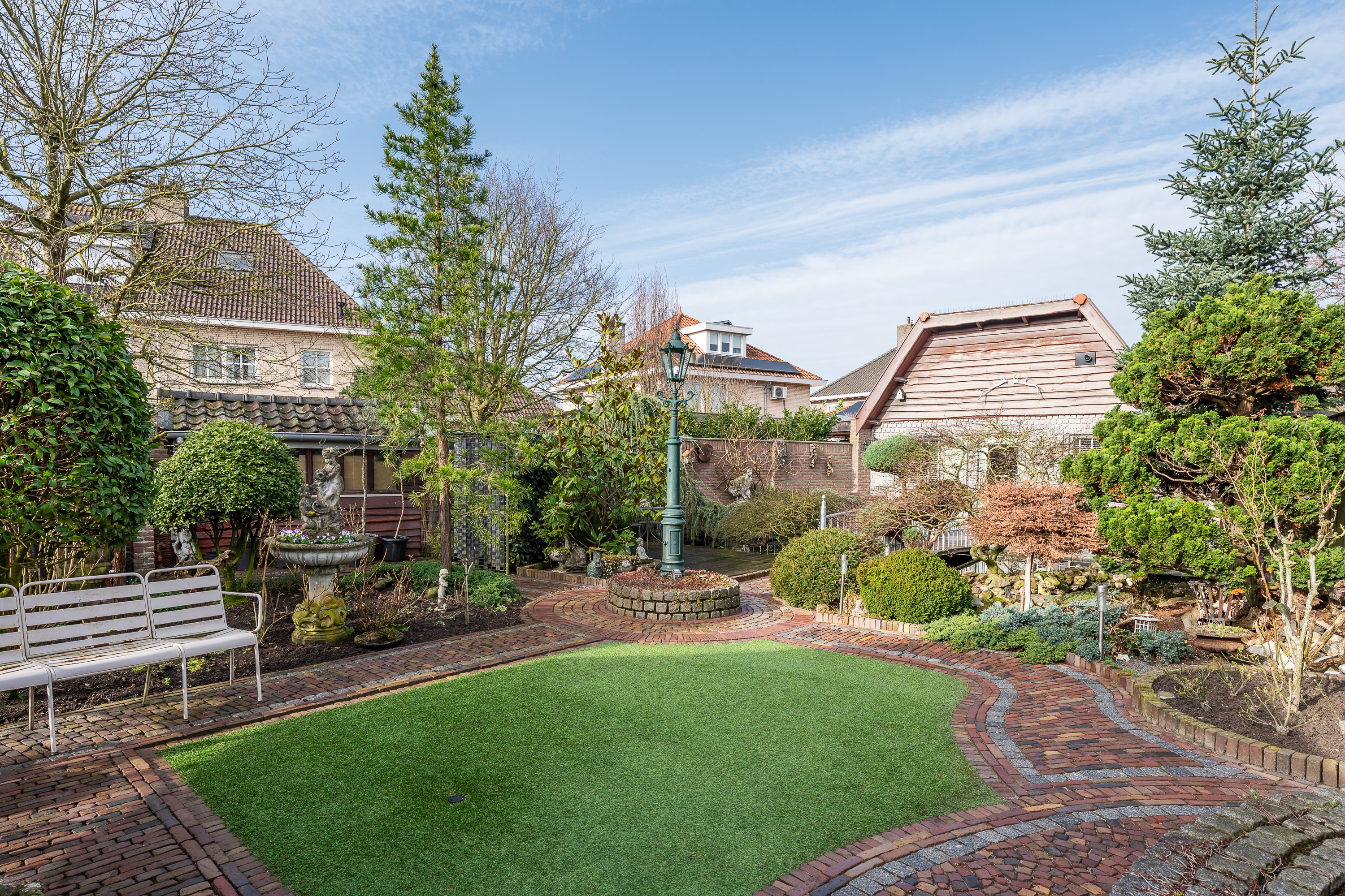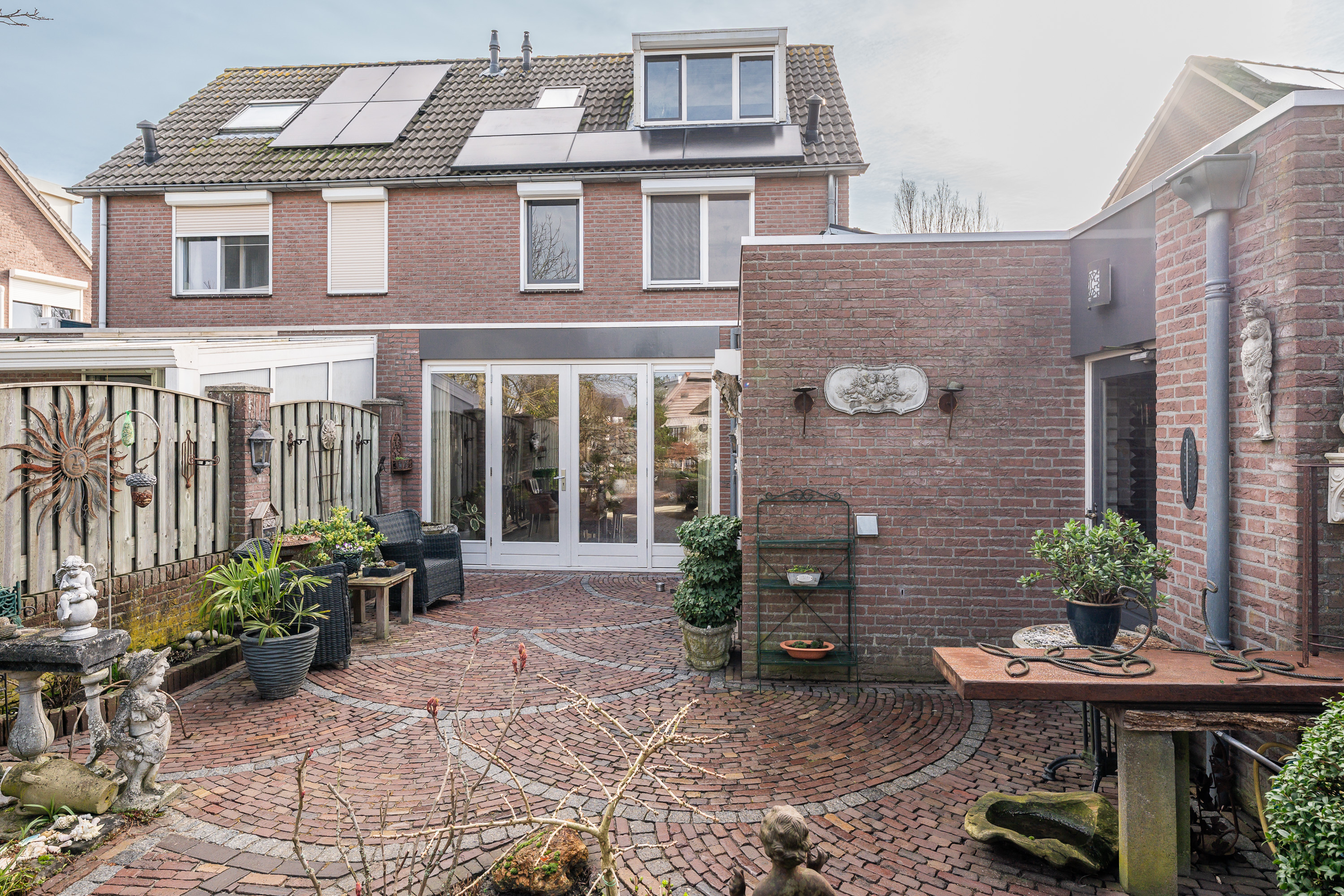 De woning beschikt over een bijzonder diepe en sfeervol aangelegde achtertuin, waar u volop kunt genieten van rust, groen en privacy. De tuin is deels voorzien van sierbestrating en deels van kunstgras, wat zorgt voor een onderhoudsvriendelijk geheel met een verzorgde uitstraling. Verspreid door de tuin vindt u diverse bordessen met gevarieerde beplanting en meerdere zitmogelijkheden, waardoor u op elk moment van de dag een fijne plek in zon of schaduw kunt kiezen. Het karakteristieke prieel met rietgedekt dak vormt een echte blikvanger en biedt een beschutte plek om lange avonden comfortabel door te brengen. De tuin beschikt over verlichting, welke per zone naar wens instelbaar is en hij is volledig omheind met een onderhoudsarme omheining.