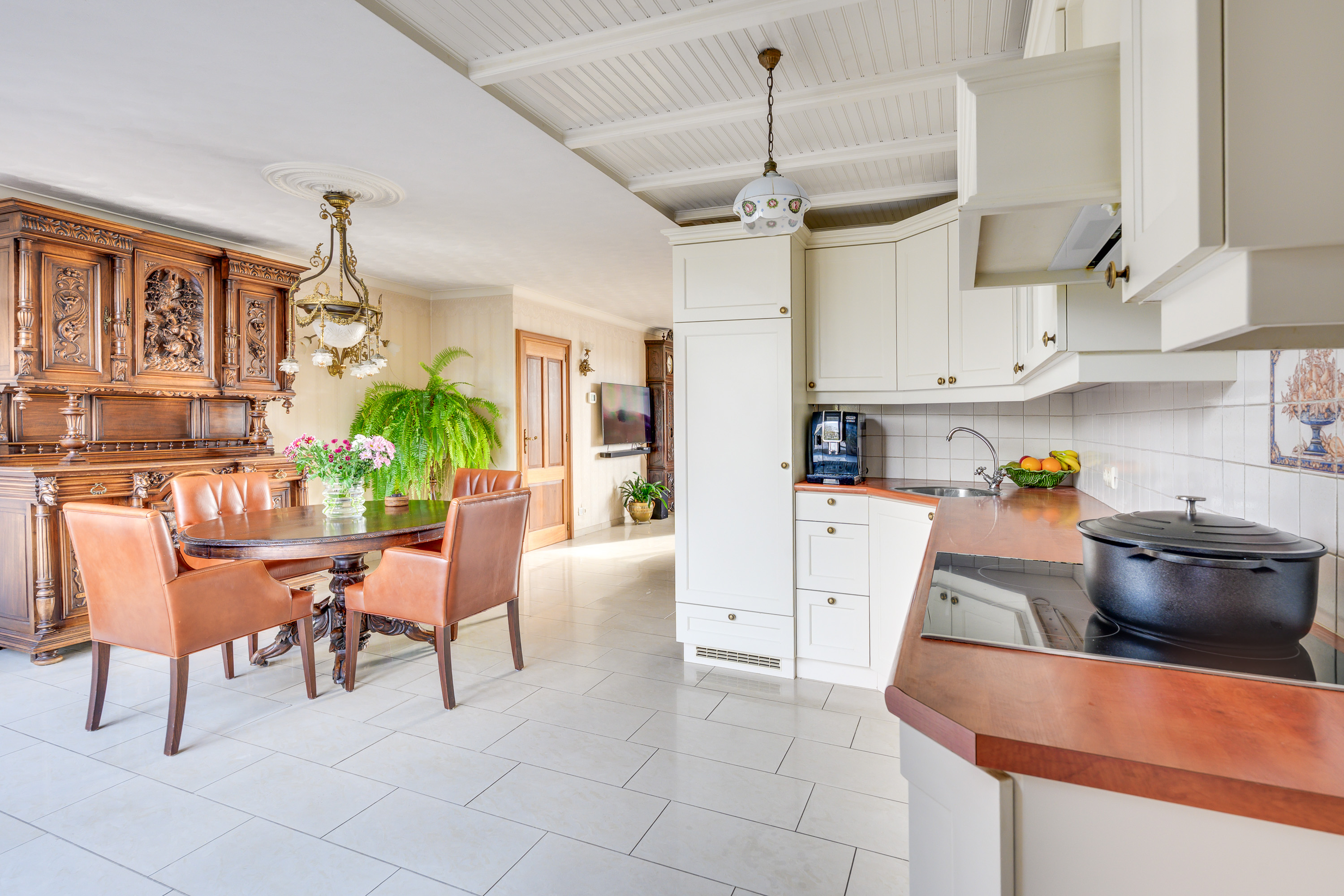 De woonkamer vormt samen met de open keuken een royale leefruimte waar u zich direct thuis voelt. De tegelvloer met comfortabele vloerverwarming – doorlopend over de gehele begane grond – zorgt voor een aangename warmte. Aan de voorzijde bevindt zich het zitgedeelte. De grote raampartijen zorgen voor een prettige lichtinval en een open uitstraling, waarbij u dankzij de aanwezige screens het binnenklimaat en de lichtinval naar wens kunt reguleren. Aan de achterzijde gaat de woonkamer over in het eetgedeelte, een fijne plek voor lange diners en gezellige momenten met familie en vrienden. De dubbele openslaande deuren verbinden binnen en buiten op natuurlijke wijze en geven direct toegang tot de tuin.