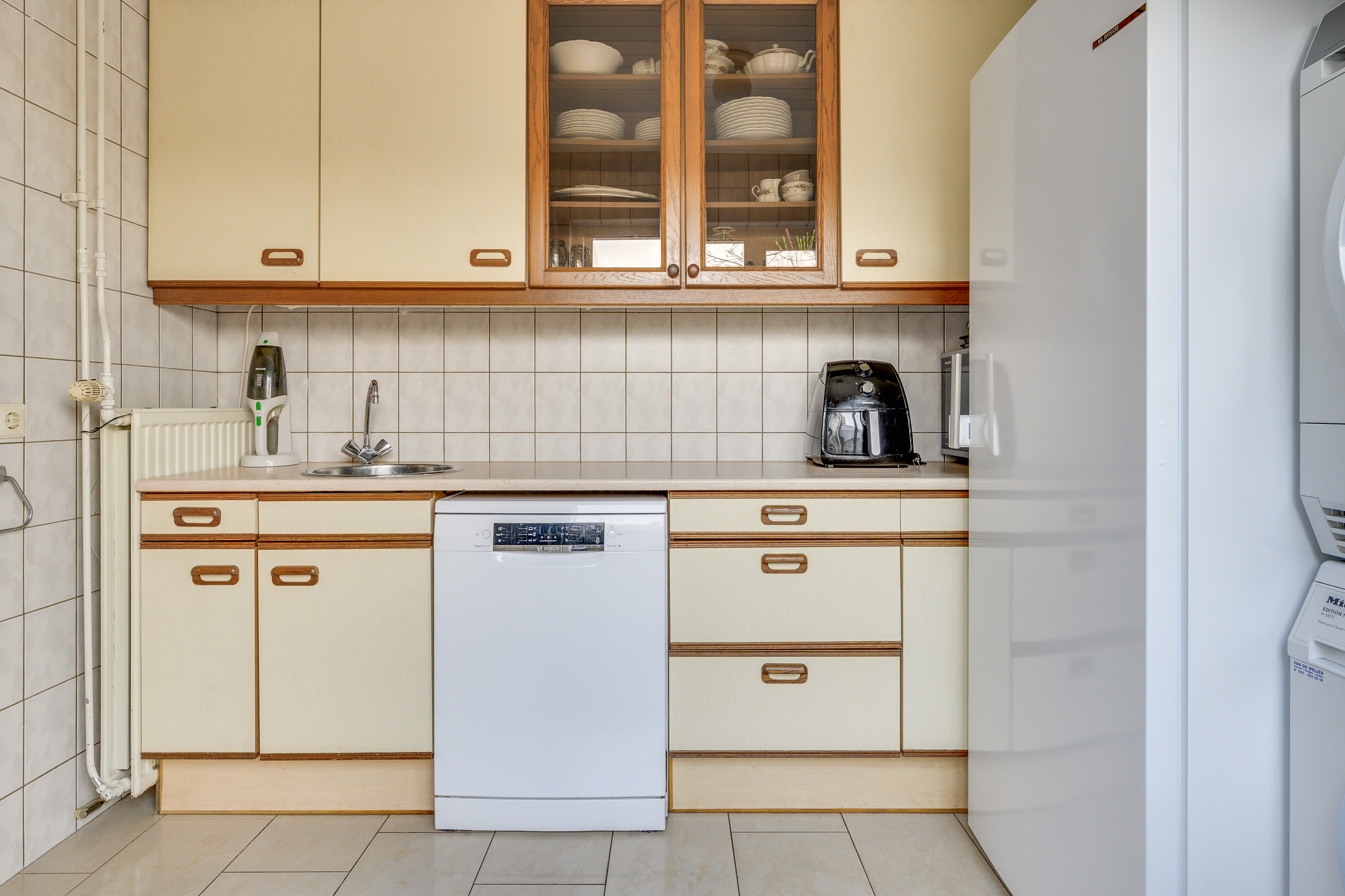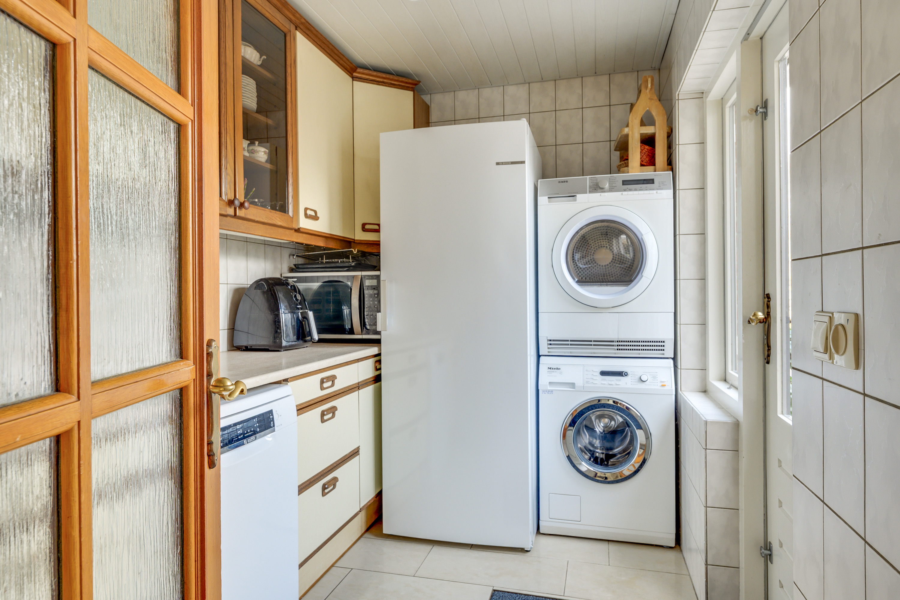 Via een deur vanuit de keuken bereikt u de bijkeuken. Deze ruimte is eveneens betegeld en beschikt over een extra keukenblok met spoelbak en vaatwasser. Daarnaast is er voldoende plaats voor het opstellen van een vriezer en zijn er aansluitingen voor wasmachine en droger. Het aanwezige uitzetraam zorgt voor natuurlijke ventilatie en daglichttoetreding. Via de deur heeft u direct toegang tot de tuin.