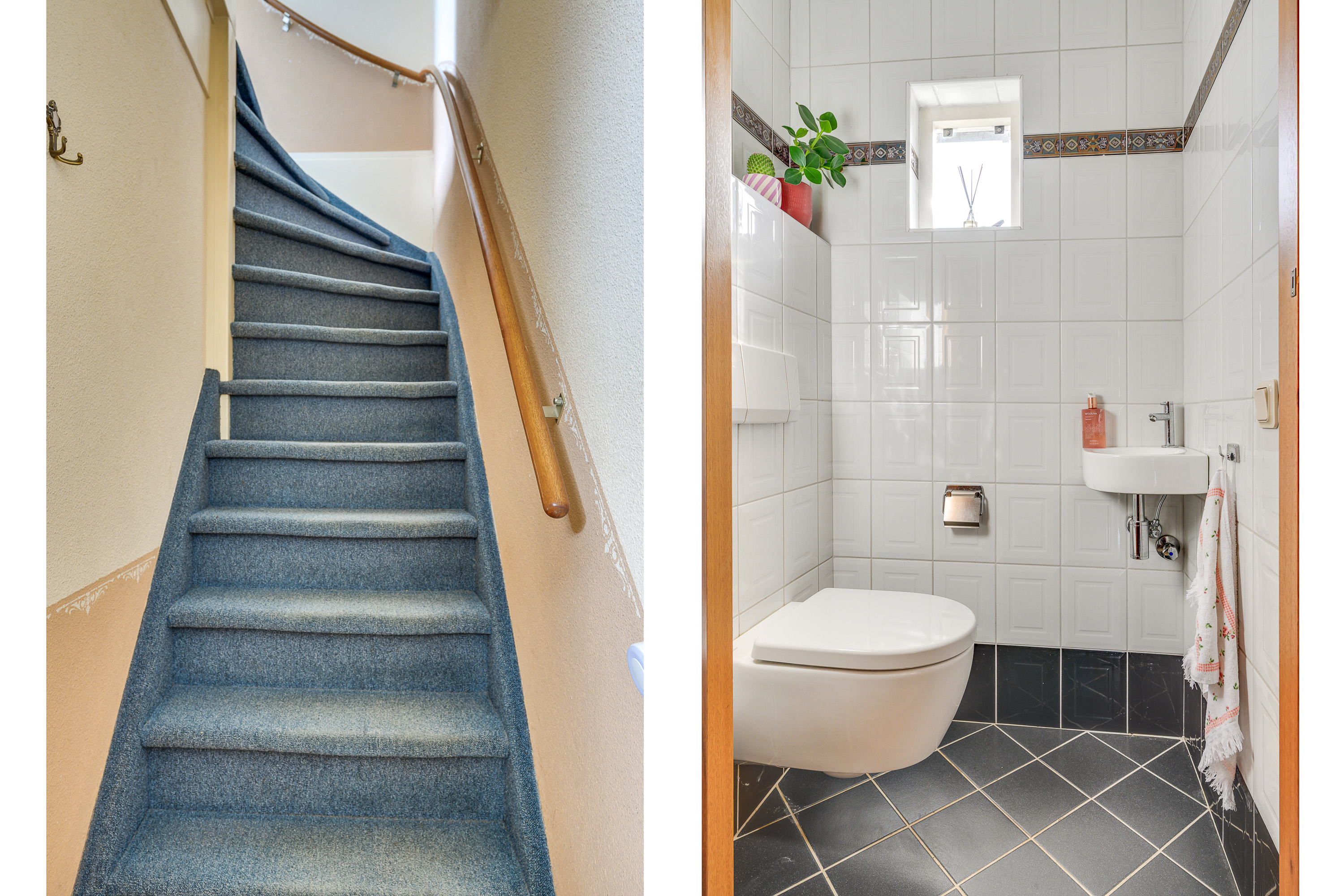 Bij binnenkomst ervaart u meteen de nette en verzorgde sfeer van de woning. De hal biedt ruimte voor garderobe en toegang tot de verschillende vertrekken. Aan de rechterzijde bevindt zich de volledig betegelde toiletruimte. Deze is uitgevoerd met een hangcloset en een fontein. Het uitzetraam zorgt voor natuurlijke ventilatie en aangenaam daglicht.