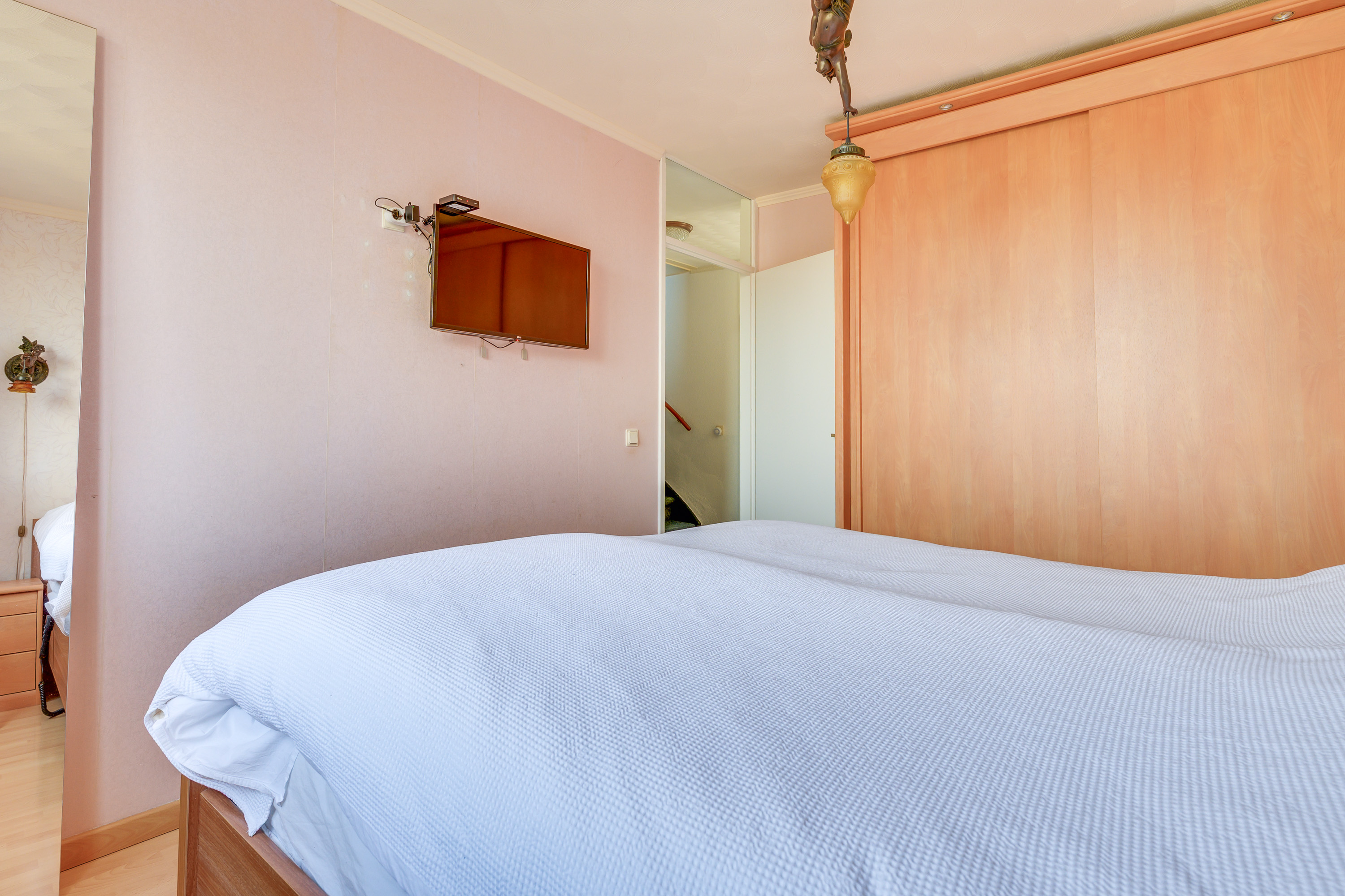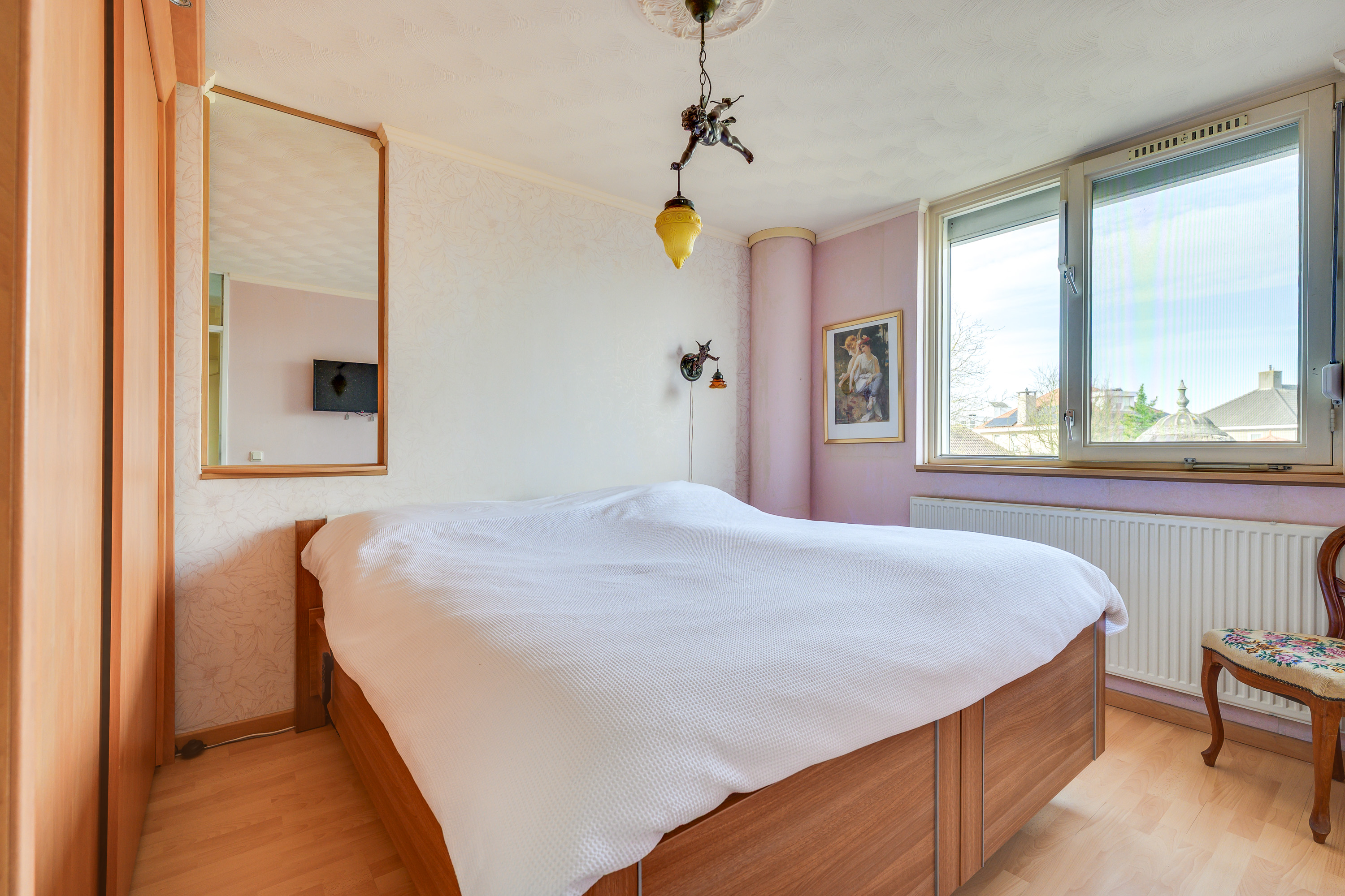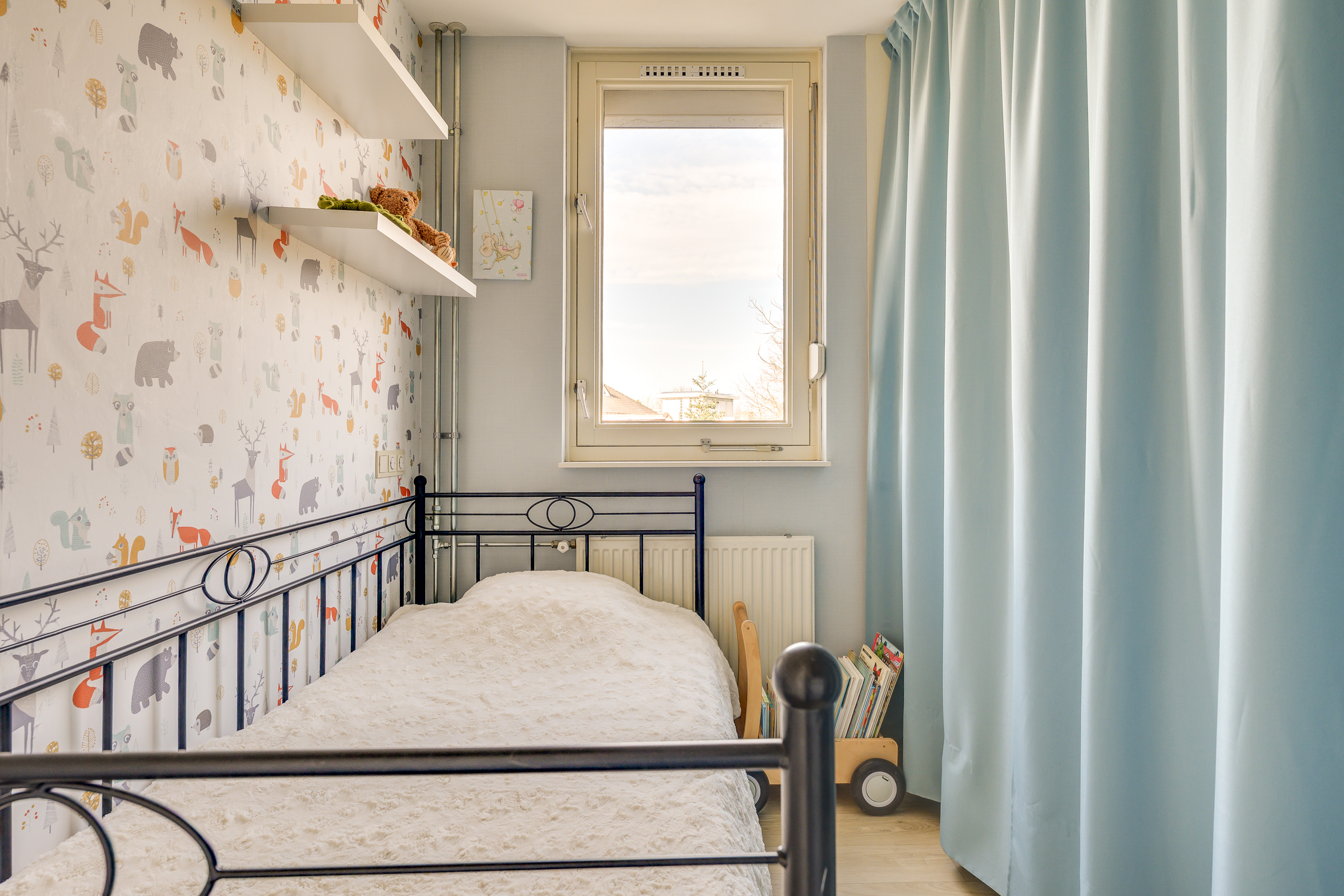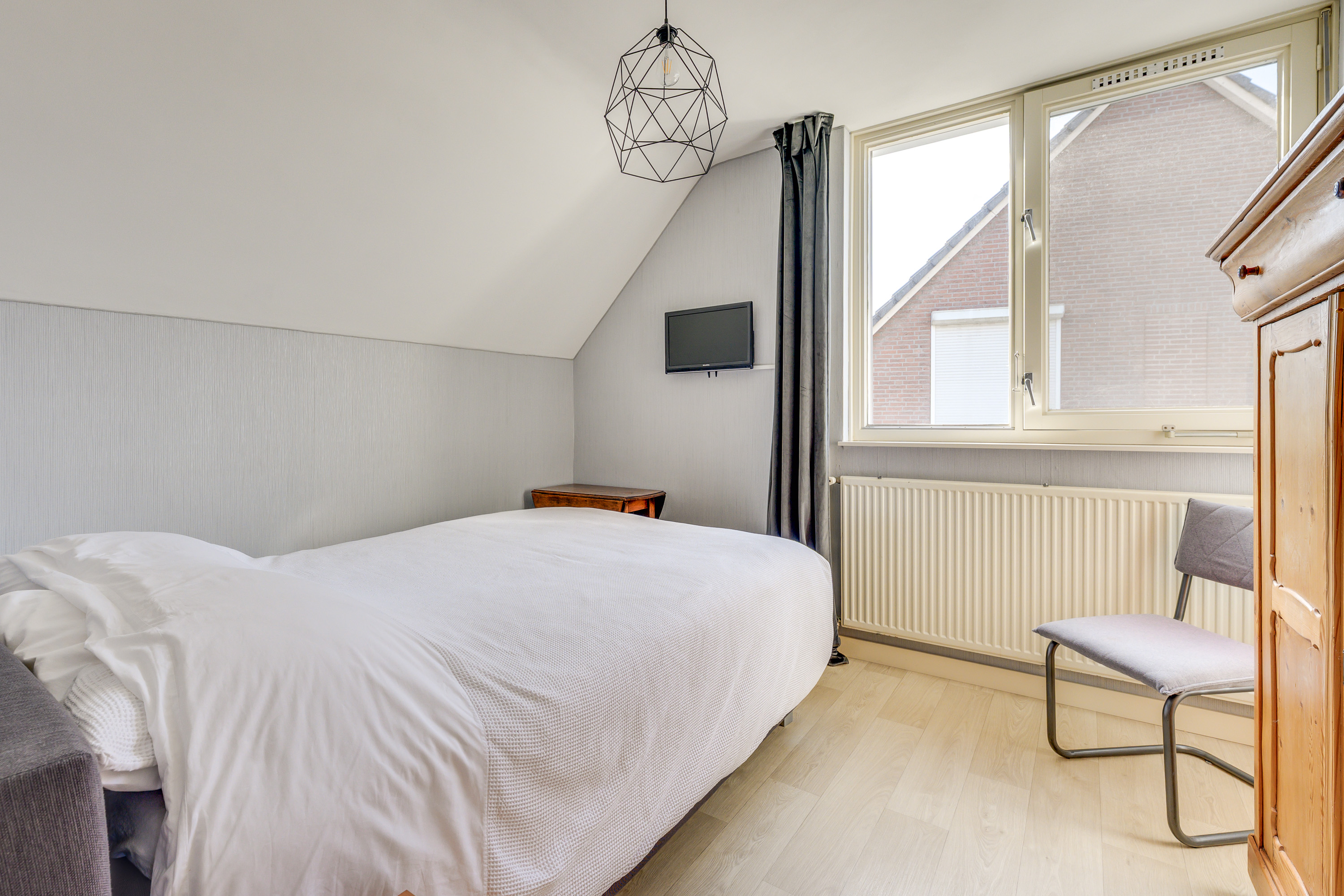 Aan de achterzijde bevinden zich twee slaapkamers, beide met een prettig uitzicht over de tuin. De kinderkamer is afgewerkt met een vinylvloer, behang en raam voorzien van een rolluik. Deze kamer heeft ook een vaste garderobekast. De ruime hoofdslaapkamer beschikt over een laminaatvloer en is voorzien van een uitzetraam met hor en een rolluik, wat zorgt voor extra ventilatiemogelijkheden en verduistering. De derde slaapkamer ligt aan de voorzijde van de woning en is afgewerkt met een vinylvloer. Deze kamer beschikt over een uitzetraam met hor en een rolluik.