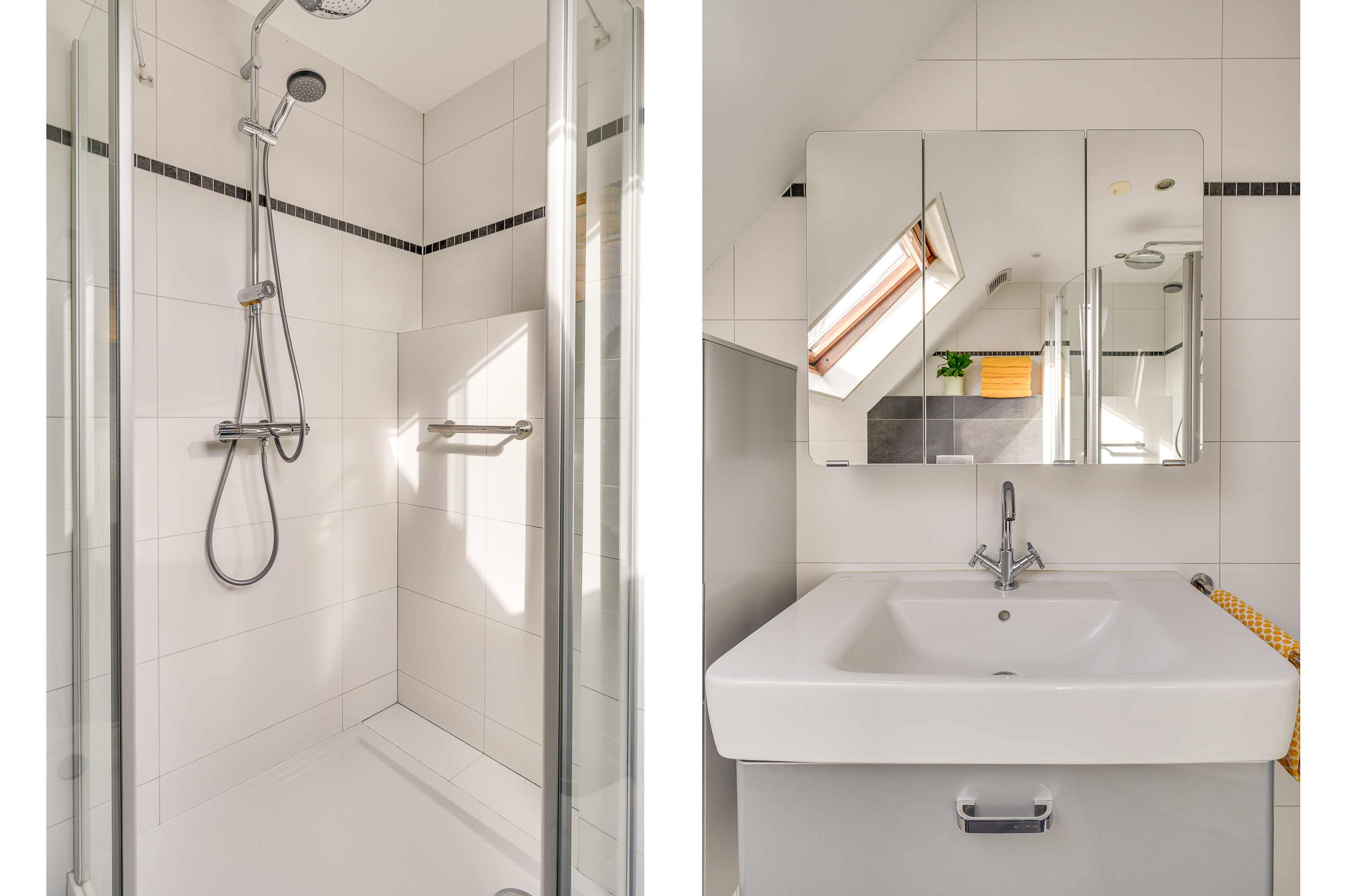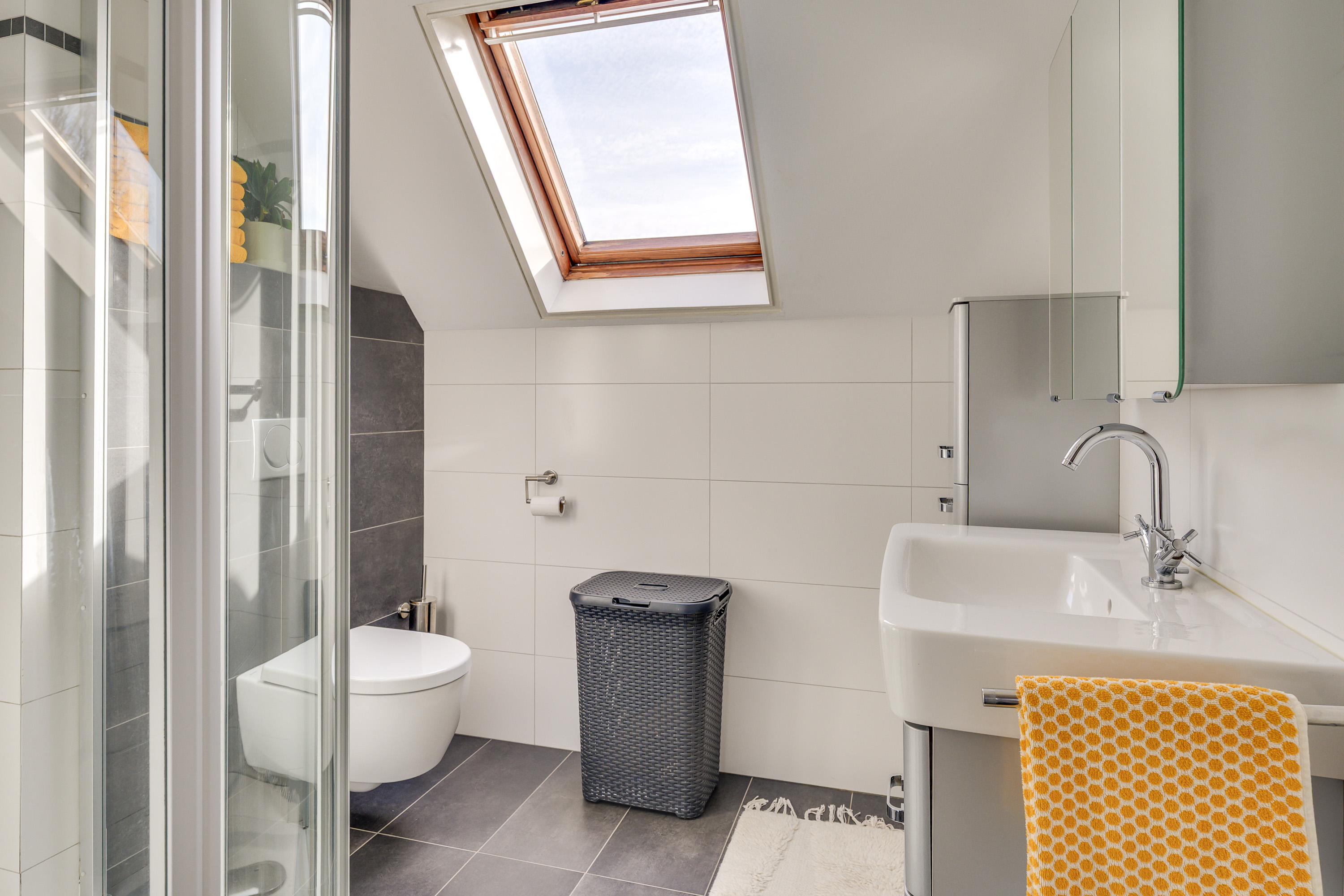 De badkamer is geheel betegeld en voorzien van vloerverwarming. Dankzij het Velux dakraam profiteert u van natuurlijke lichtinval, terwijl de mechanische ventilatie zorgt voor een prettig binnenklimaat. De ruimte is uitgerust met een wastafel met meubel, een douchecabine en een hangcloset.