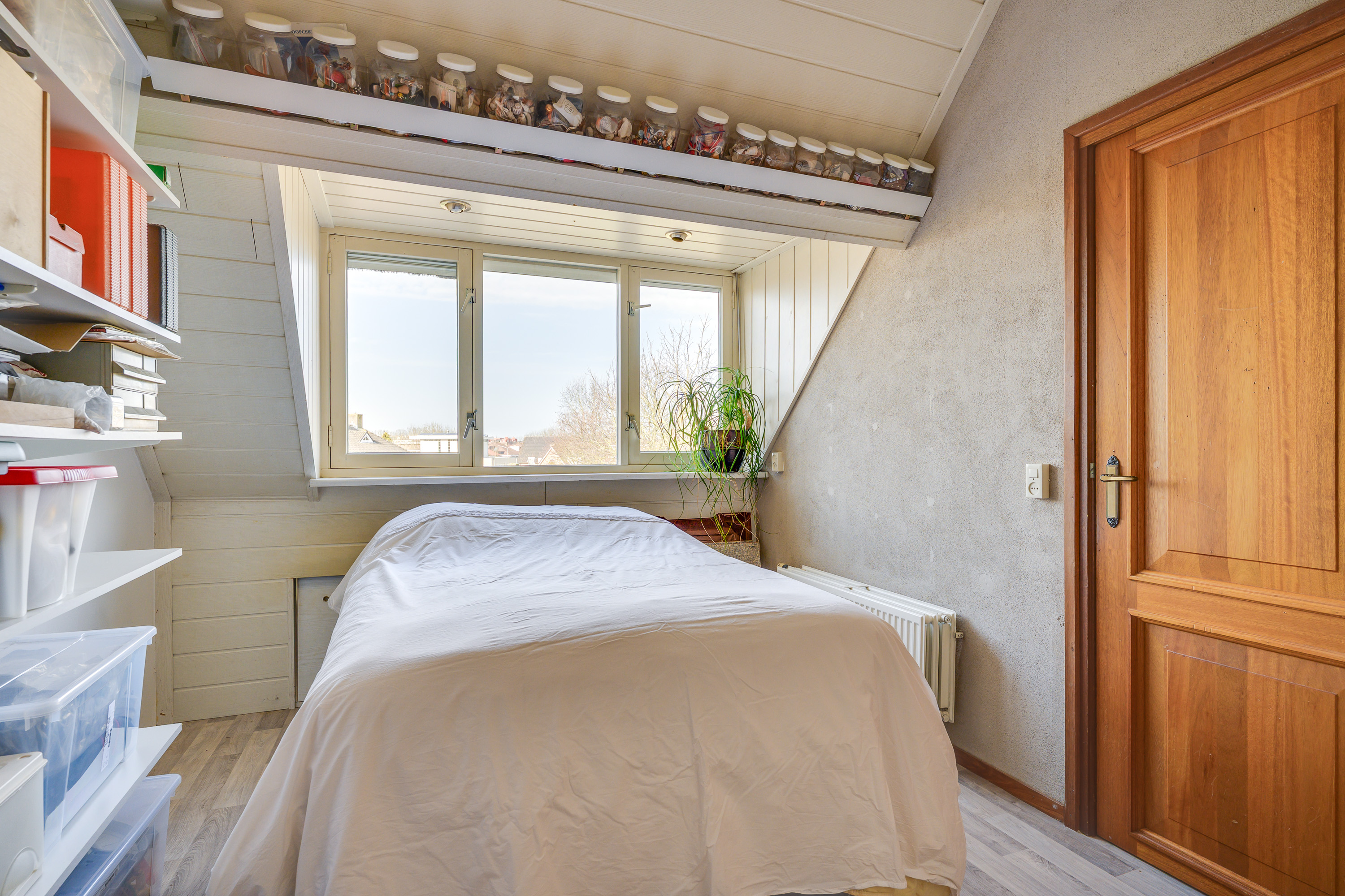 Aansluitend treft u een multifunctionele ruimte die zich uitstekend leent als vierde slaapkamer, maar ook zeer geschikt is als thuiswerkplek, hobbyruimte of logeerkamer. De ruimte is voorzien van een vinylvloer en profiteert van extra licht dankzij de dakkapel. Tevens is er een uitzetraam met hor en een rolluik aanwezig.