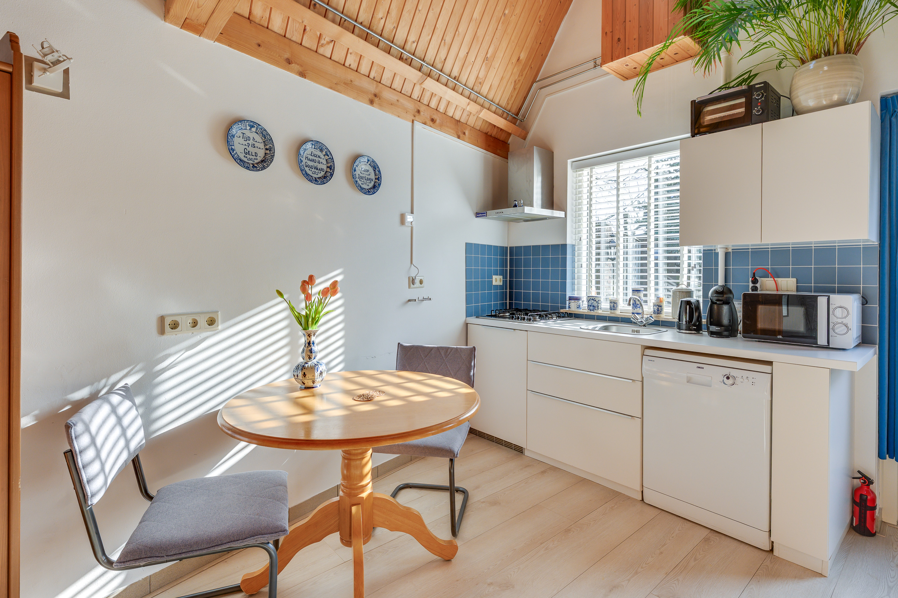 De keuken is uitgevoerd in een praktische hoekopstelling met lichte fronten en een warm werkblad, wat zorgt voor een rustige uitstraling. Hier treft u een spoelbak, een inductiekookplaat met afzuiging en een koelkast. Daarnaast zijn er aansluitingen aanwezig voor een vaatwasser en voldoende bergruimte.