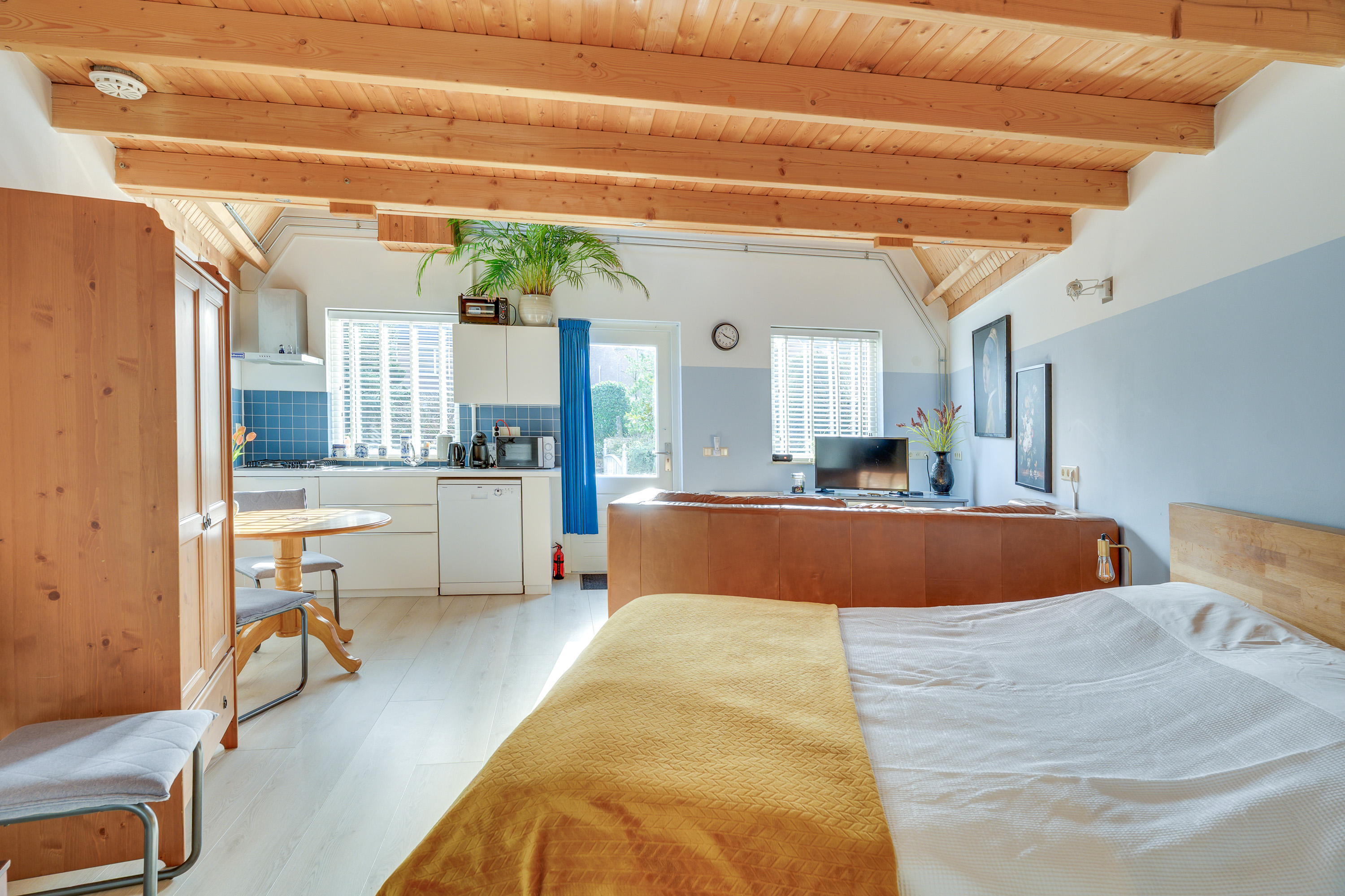 Via de charmante brug over de vijver bereikt u het vrijstaande guesthouse, dat momenteel met succes in gebruik is als Bed & Breakfast. Deze sfeervolle ruimte kenmerkt zich door het balkenplafond en de prettige lichtinval dankzij meerdere dakramen (waarvan één met hor), wat zorgt voor een open en aangename atmosfeer. De ruimte is afgewerkt met een laminaatvloer en functioneel ingedeeld: aan de linkerzijde bevindt zich het zitgedeelte, terwijl rechtsachter het keuken- en eetgedeelte is gesitueerd. Het keukenblok is voorzien van een gasfornuis, afzuigkap, vaatwasser en spoelbak, waardoor zelfstandig verblijf uitstekend mogelijk is. Achterin bevindt zich het slaapgedeelte. De volledig betegelde badkamer beschikt over een douchecabine, wastafel met meubel en een closet.