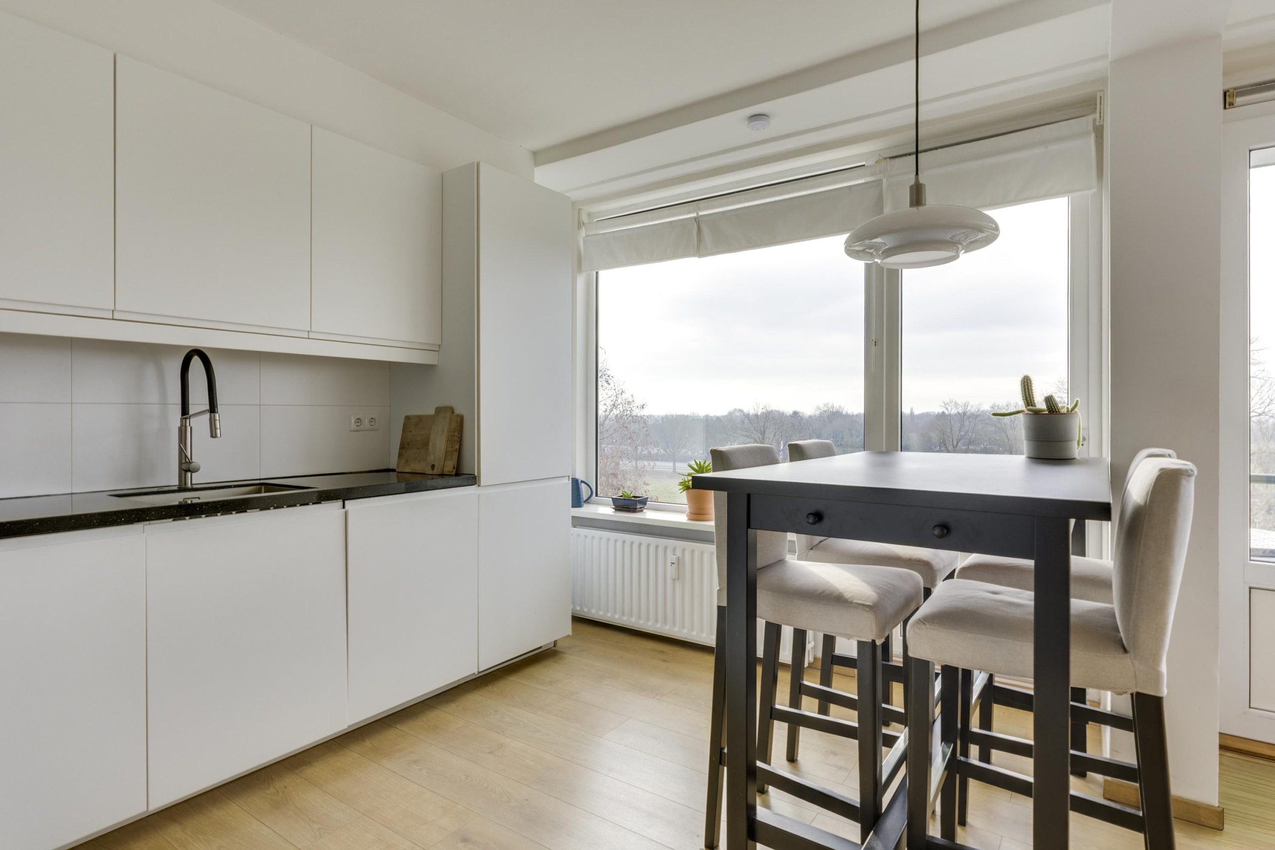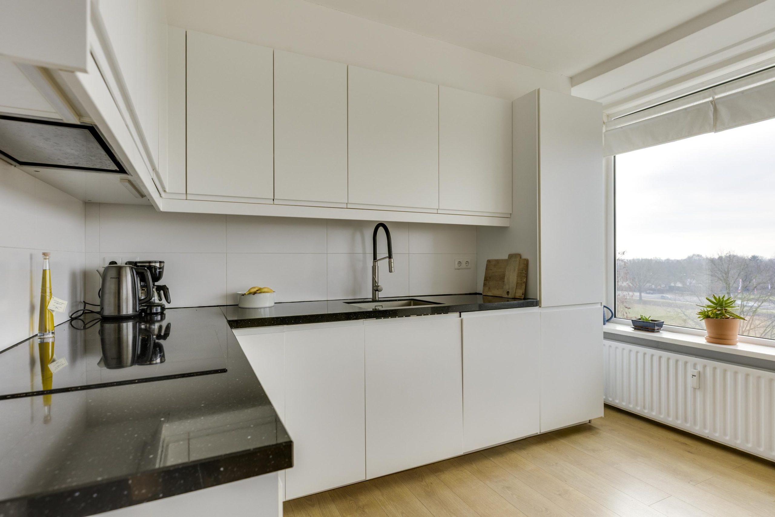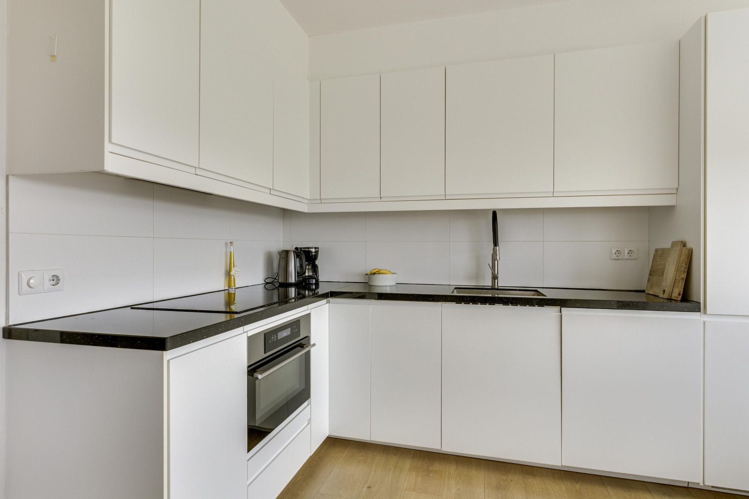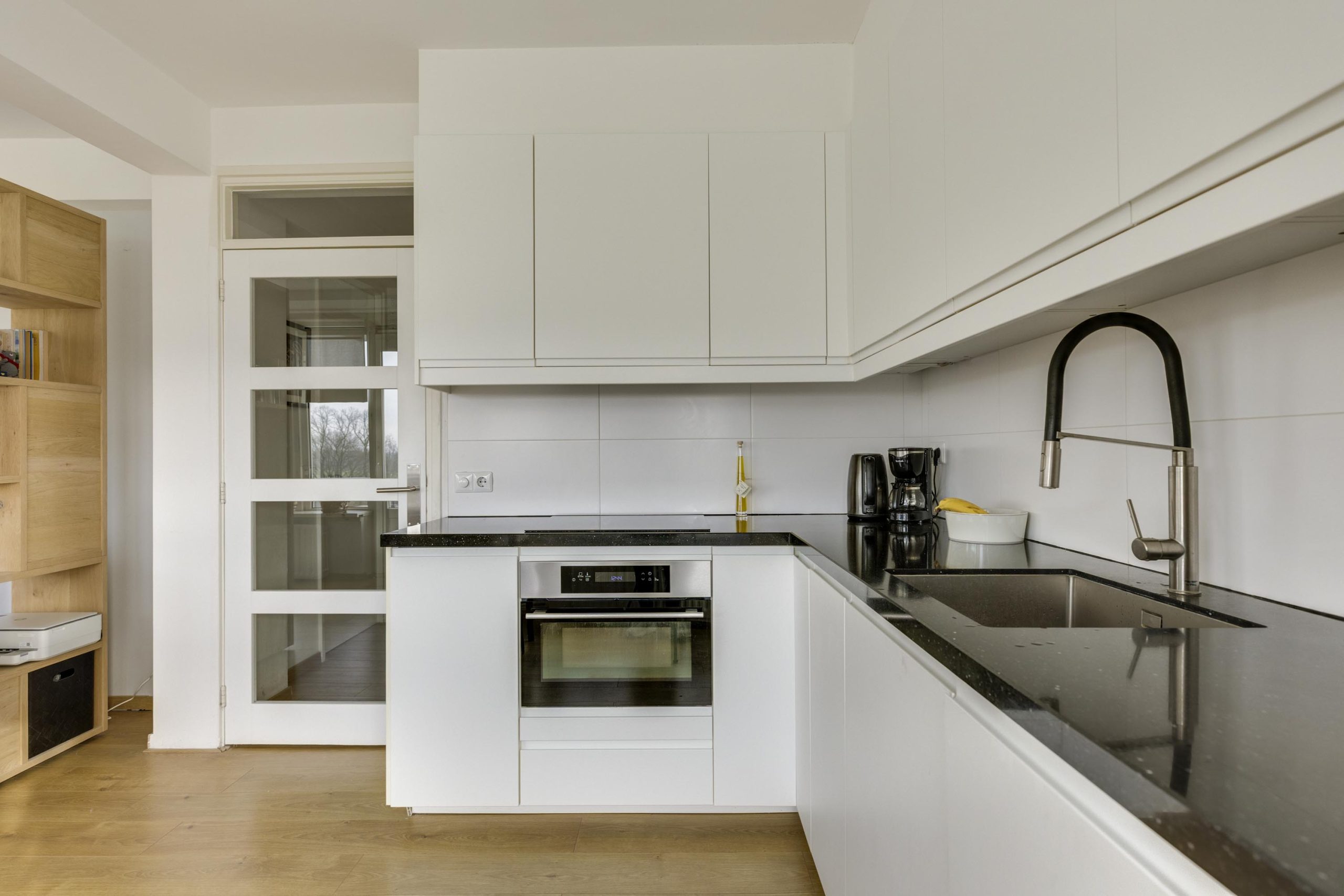 Meteen naast de living bevindt zich de keuken, efficiënt ingericht in een hoekopstelling. Deze is voorzien van strakke witte greeploze onder- en bovenkasten, een antraciet granieten blad en heeft diverse inbouwapparatuur, waaronder een vaatwasser, koelkast, combi magnetronoven en inductiekookplaat.