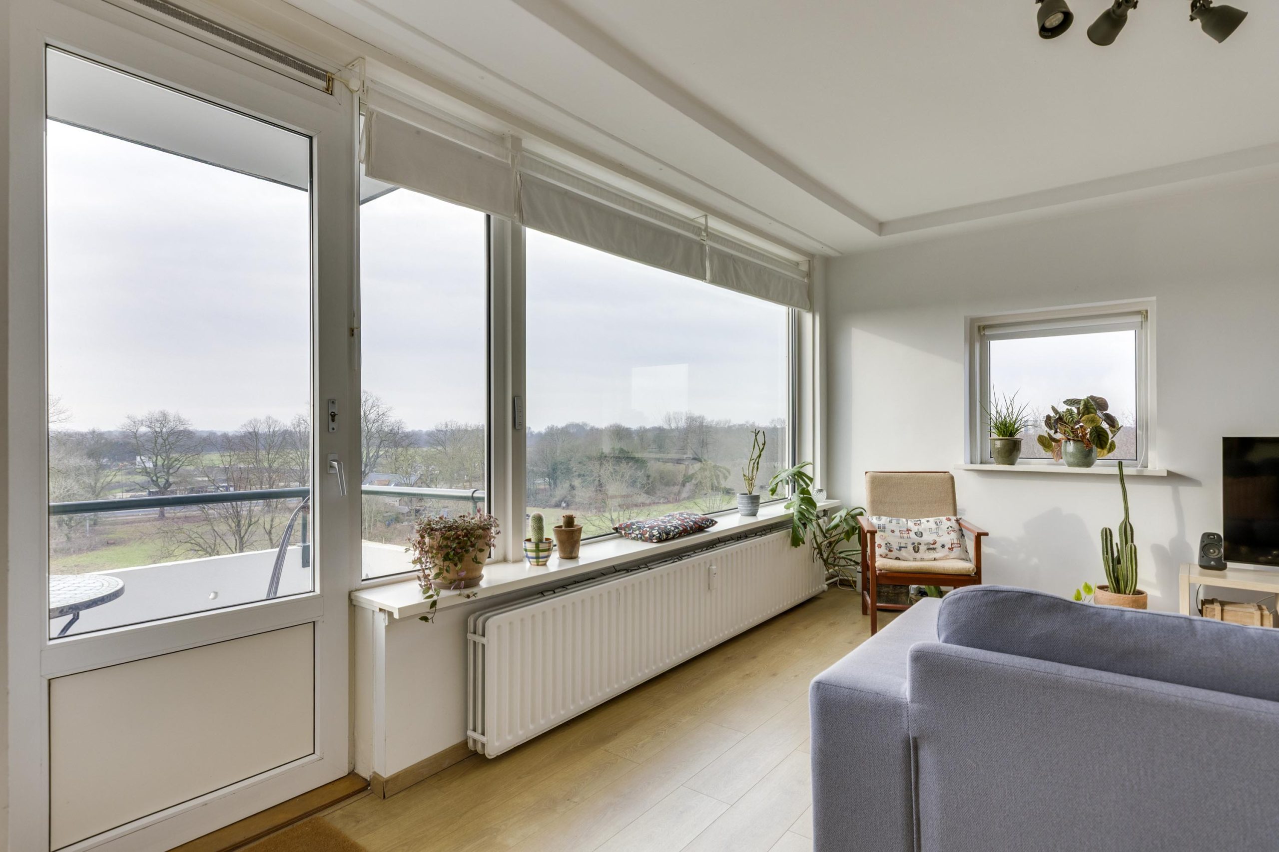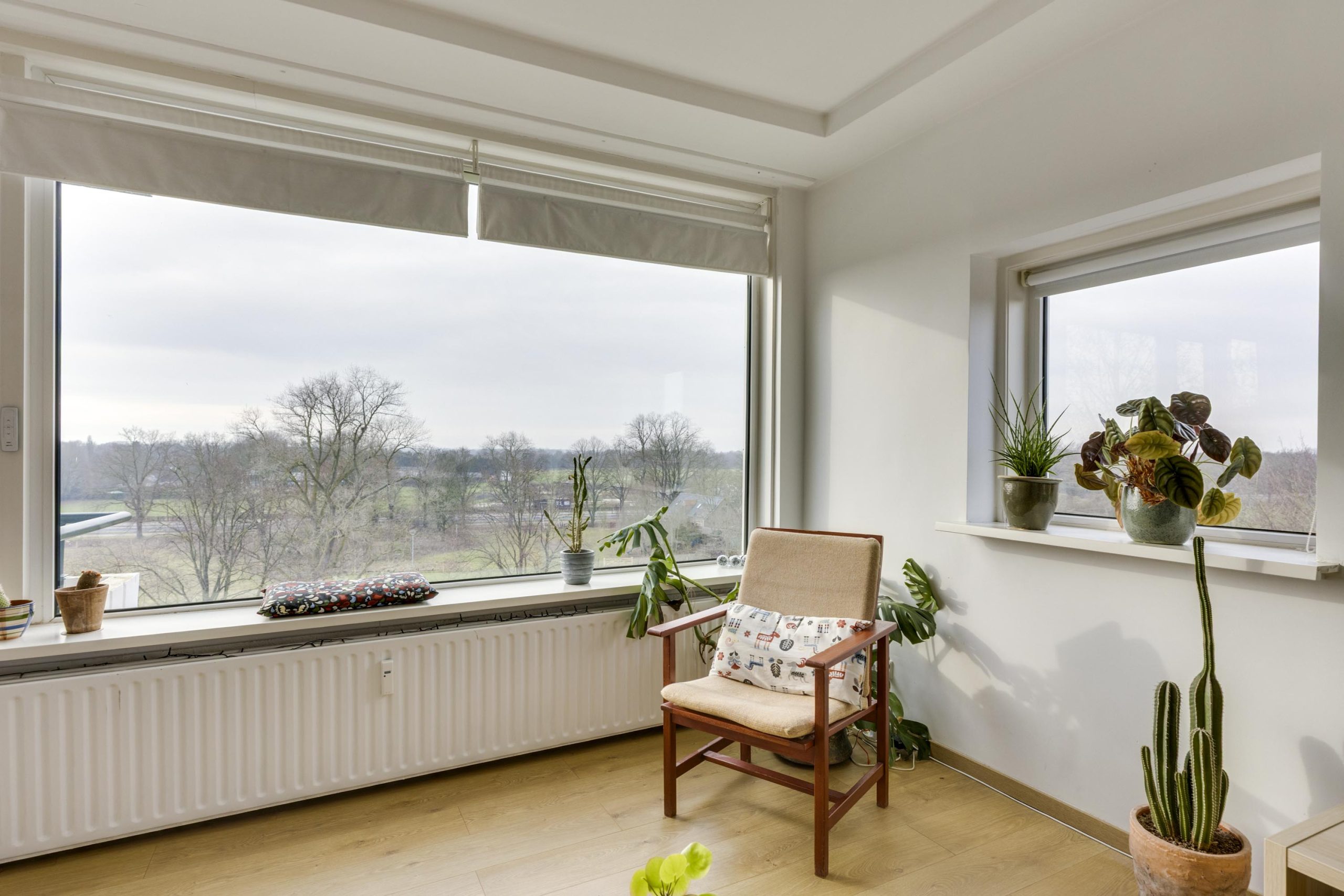 De living is vanwege de vele ramen heerlijk licht en heeft ruimte voor een eet- én zitgedeelte. Vanuit deze living heeft u fantastisch uitzicht over ’s-Hertogenbosch en het direct tegenoverliggende natuurgebied.