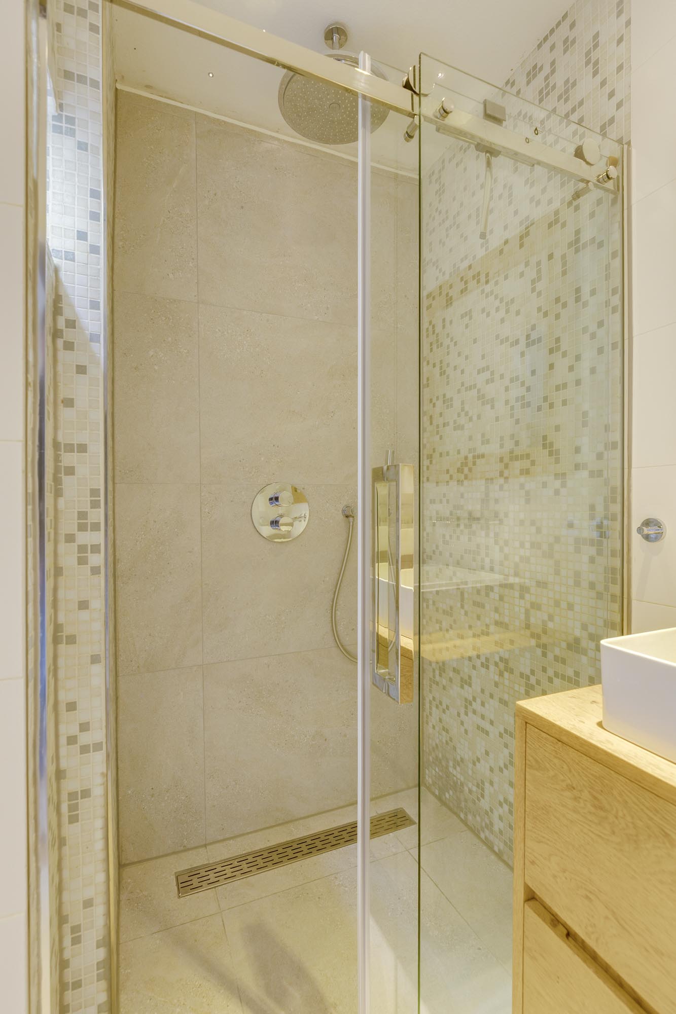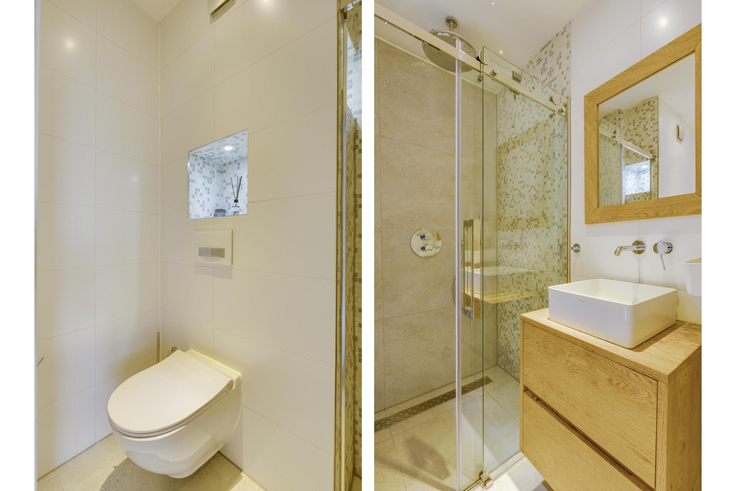 De moderne badkamer is functioneel ingericht met een ruime inloopdouche met stortdouche, easy drain rooster, een strak houten meubel met ruime wastafel en een wand closet. De badkamer is volledig betegeld tot aan het plafond, met strakke witte tegels en in het douchegedeelte is een wand tot boven aan toe betegeld met moderne mozaïek steentjes.