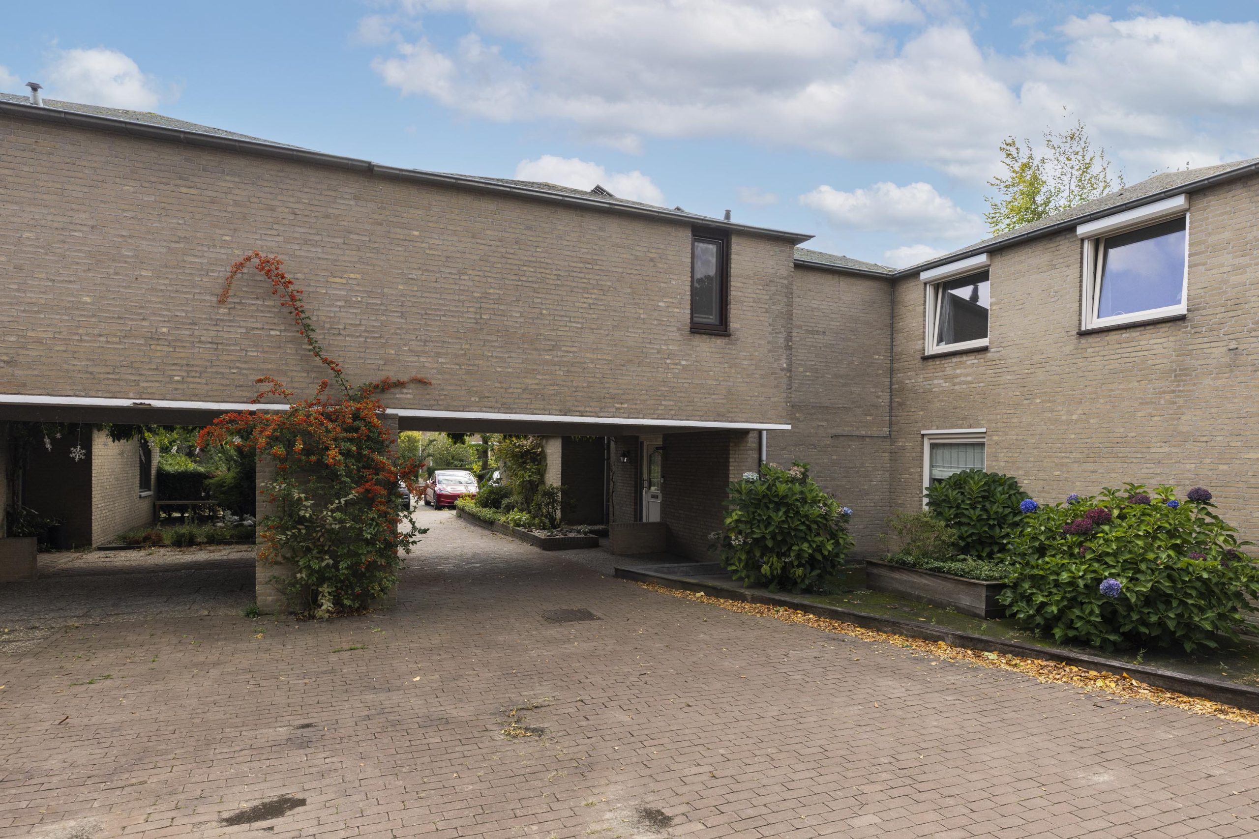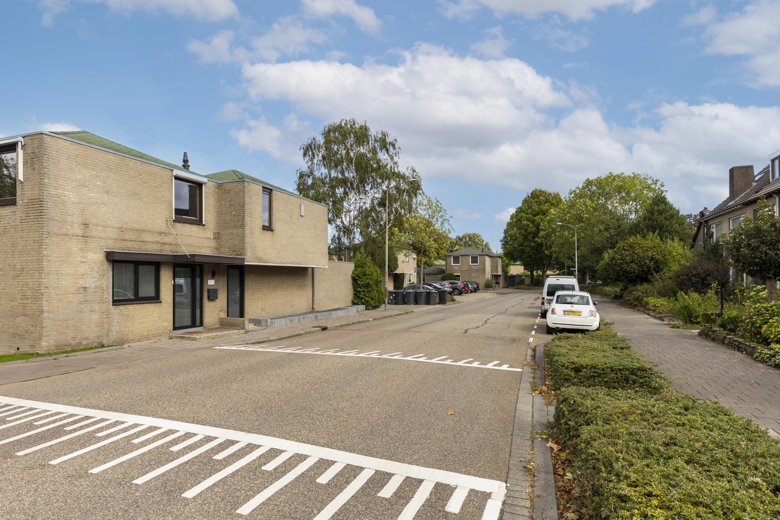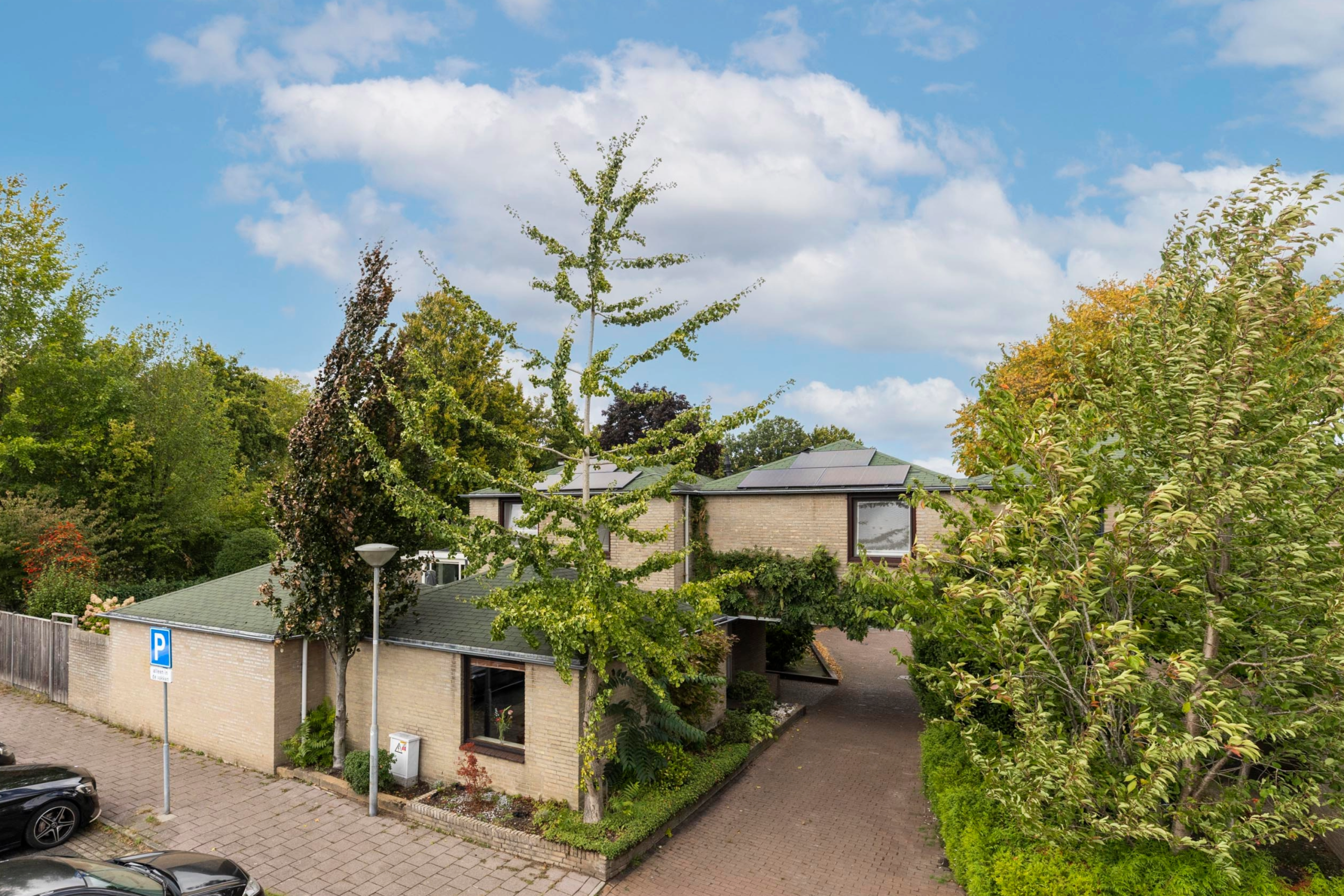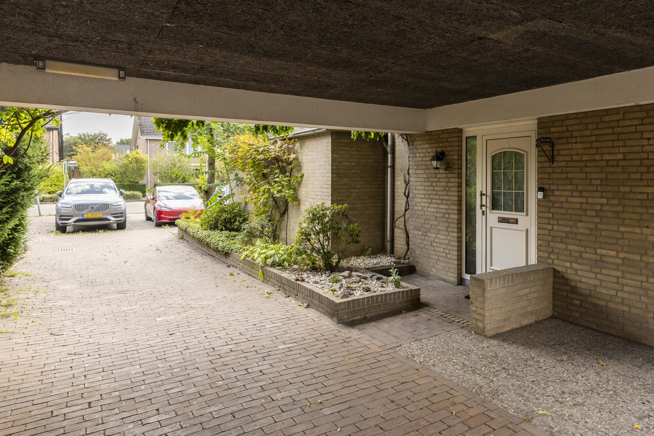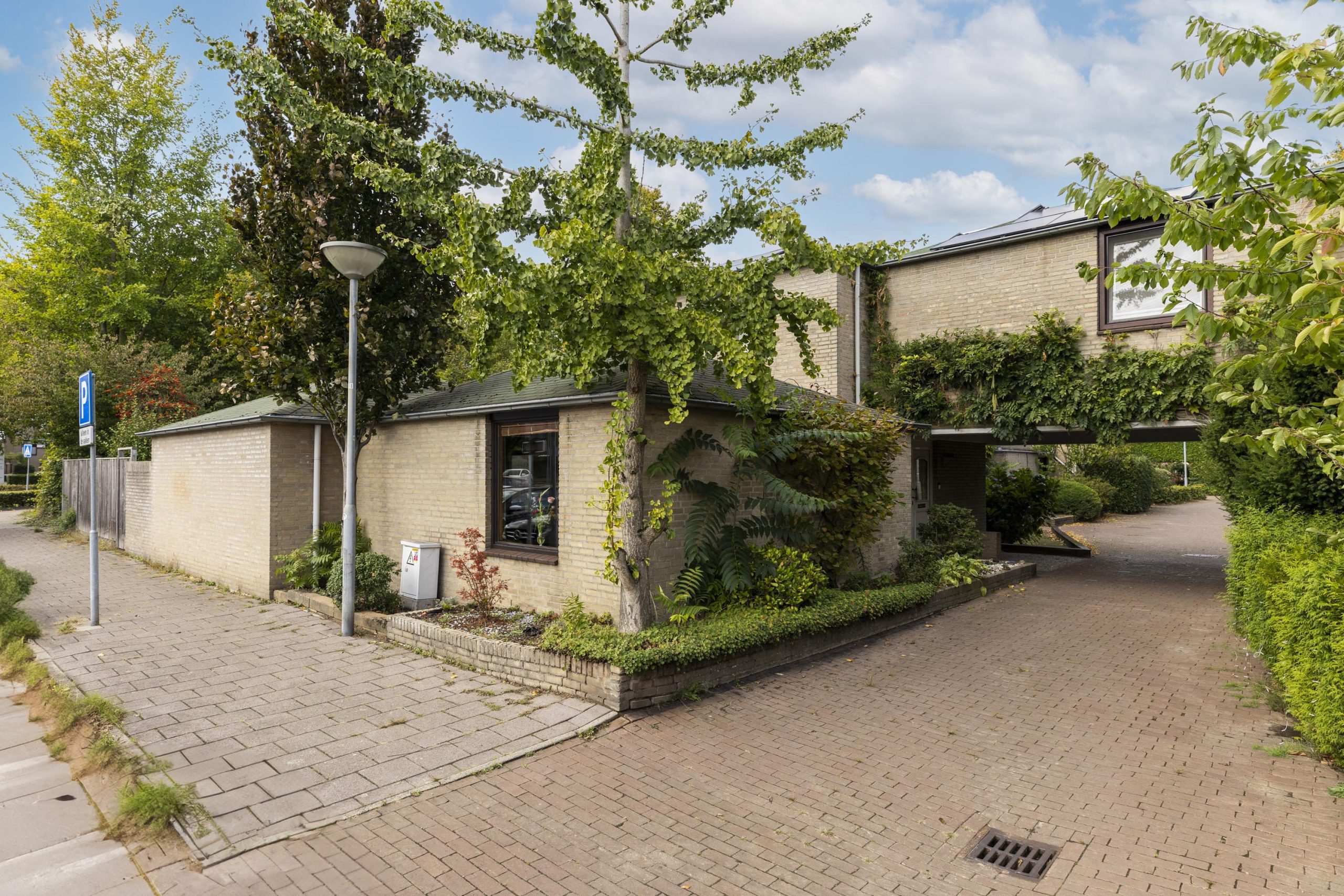Vanaf de straat trekt de opvallende architectuur meteen de aandacht. Een autovrij pad leidt onder de eerste verdieping van het huis naar de entree. Groene struiken langs het netjes geplaveide pad zorgen voor een uitnodigende entree.