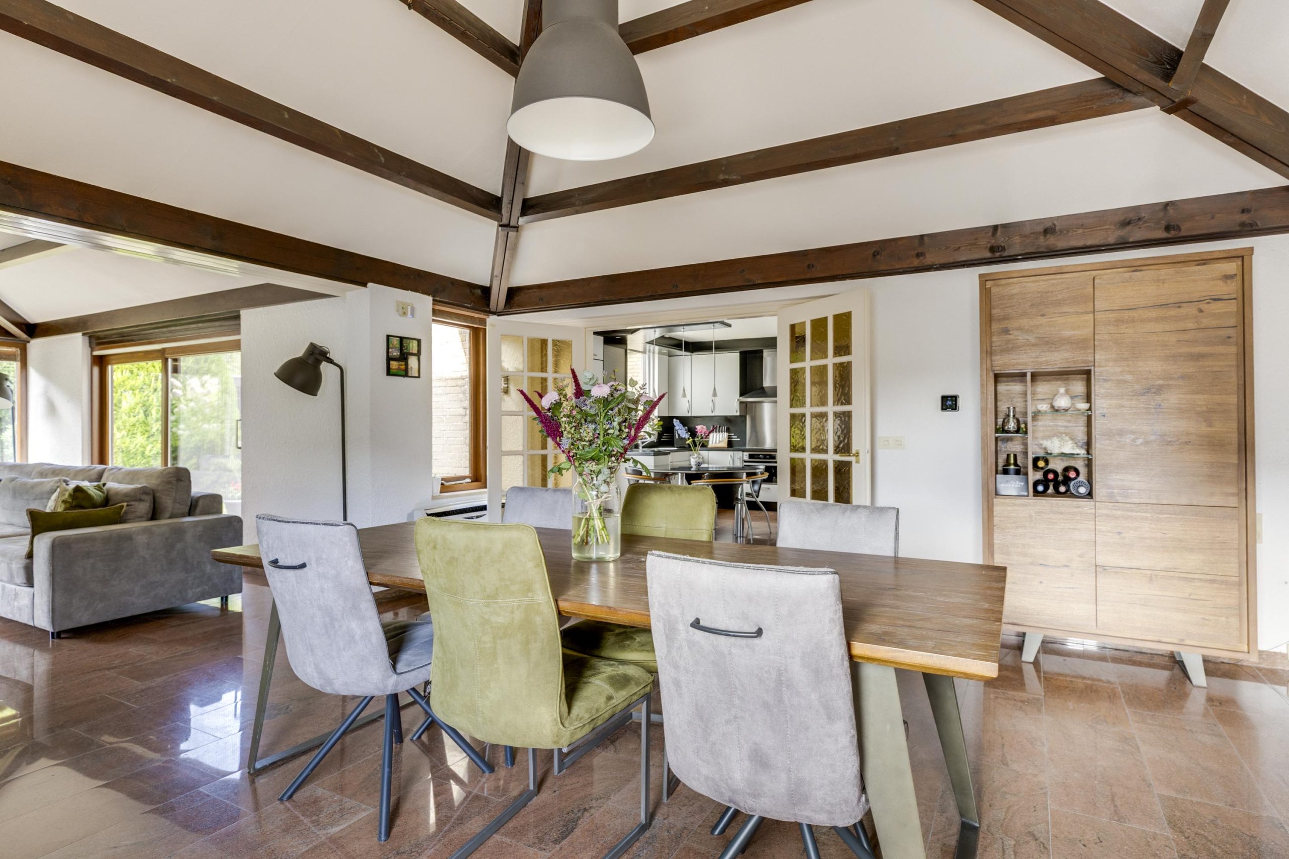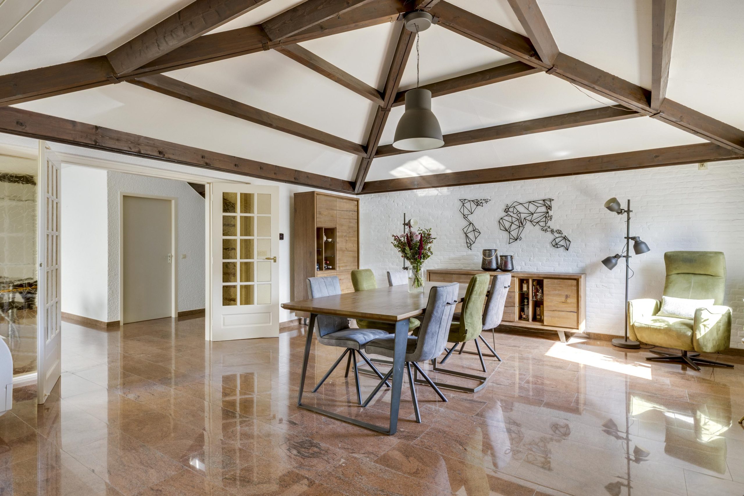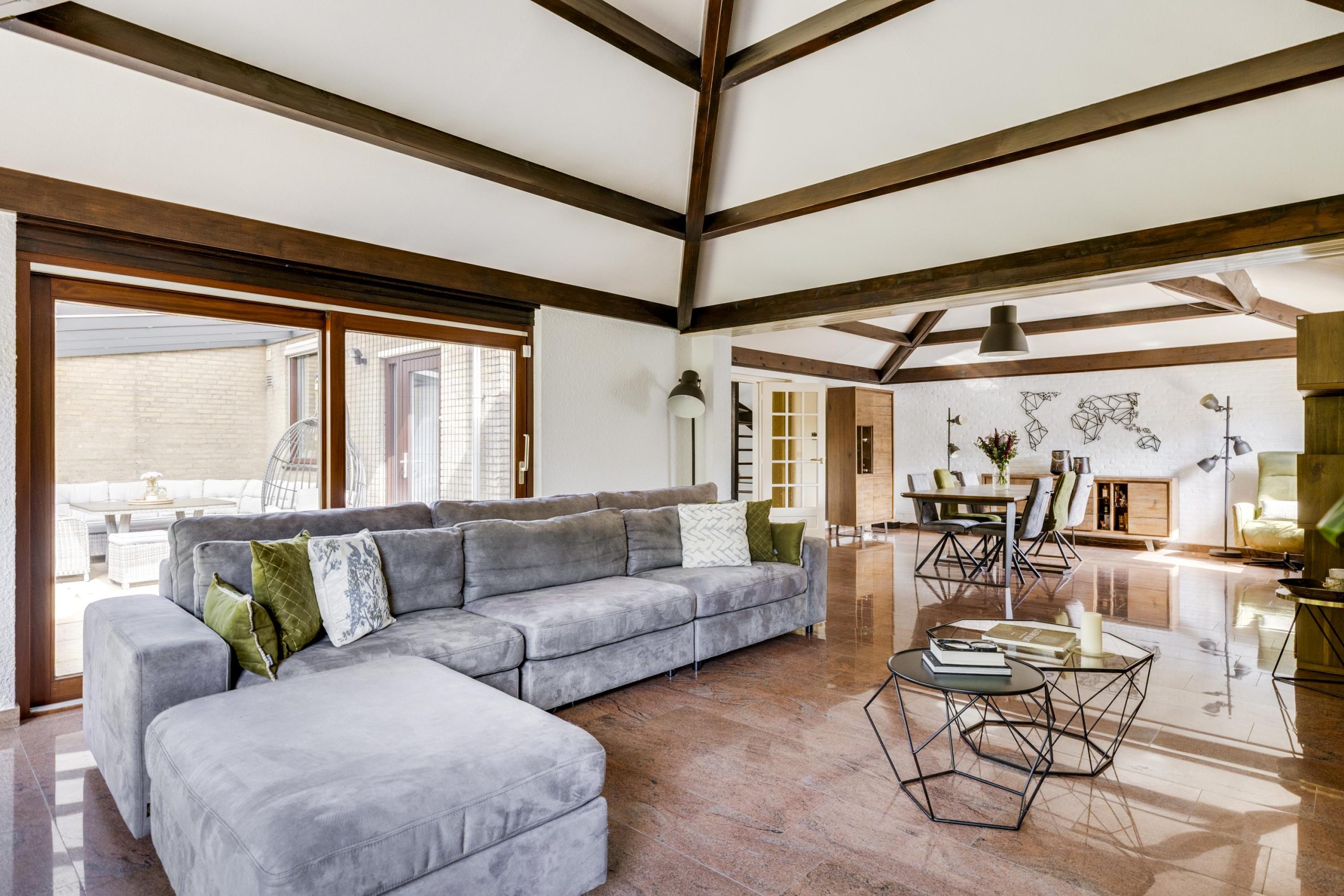 De verlengde woonkamer is echt een blikvanger. Een schuin plafond met zichtbare donkere houten balken geeft een gevoel van grandeur en karakter. Hoge plafonds, ruw gepleisterde muren en natuurstenen vloeren dragen bij aan de unieke sfeer.