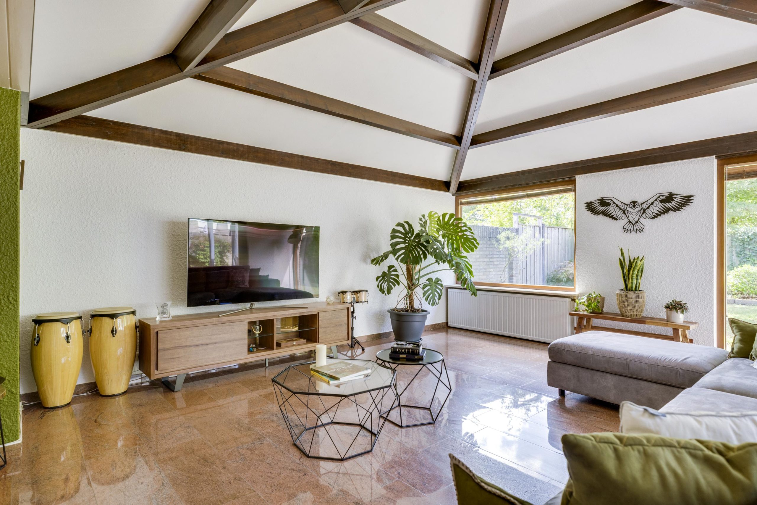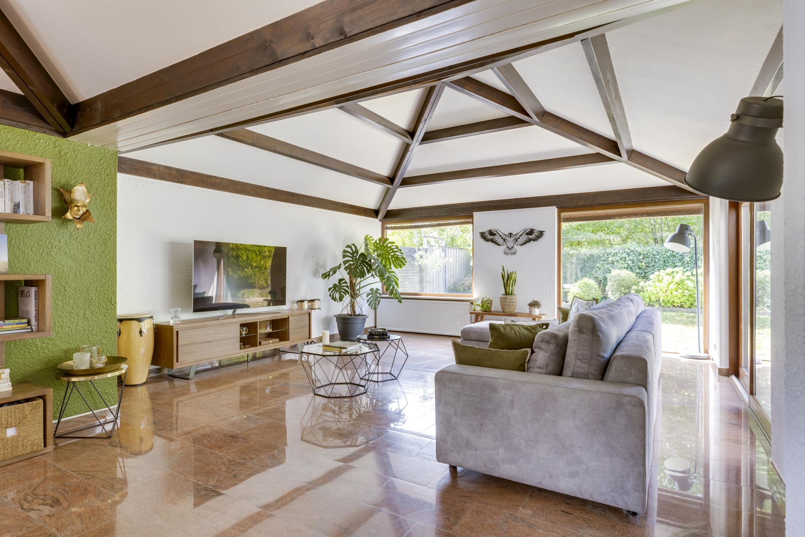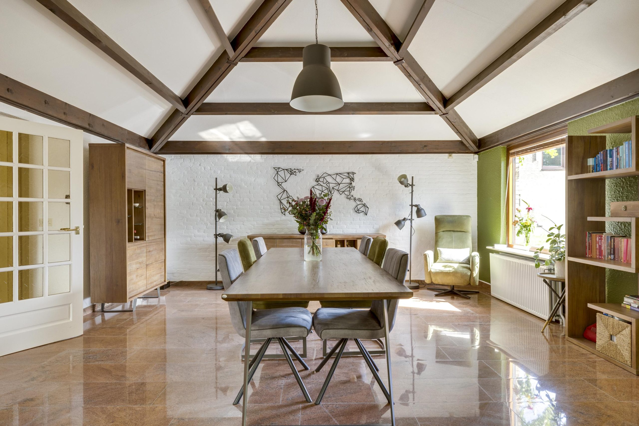 De verlengde woonkamer is echt een blikvanger. Een schuin plafond met zichtbare donkere houten balken geeft een gevoel van grandeur en karakter. Hoge plafonds, ruw gepleisterde muren en natuurstenen vloeren dragen bij aan de unieke sfeer.