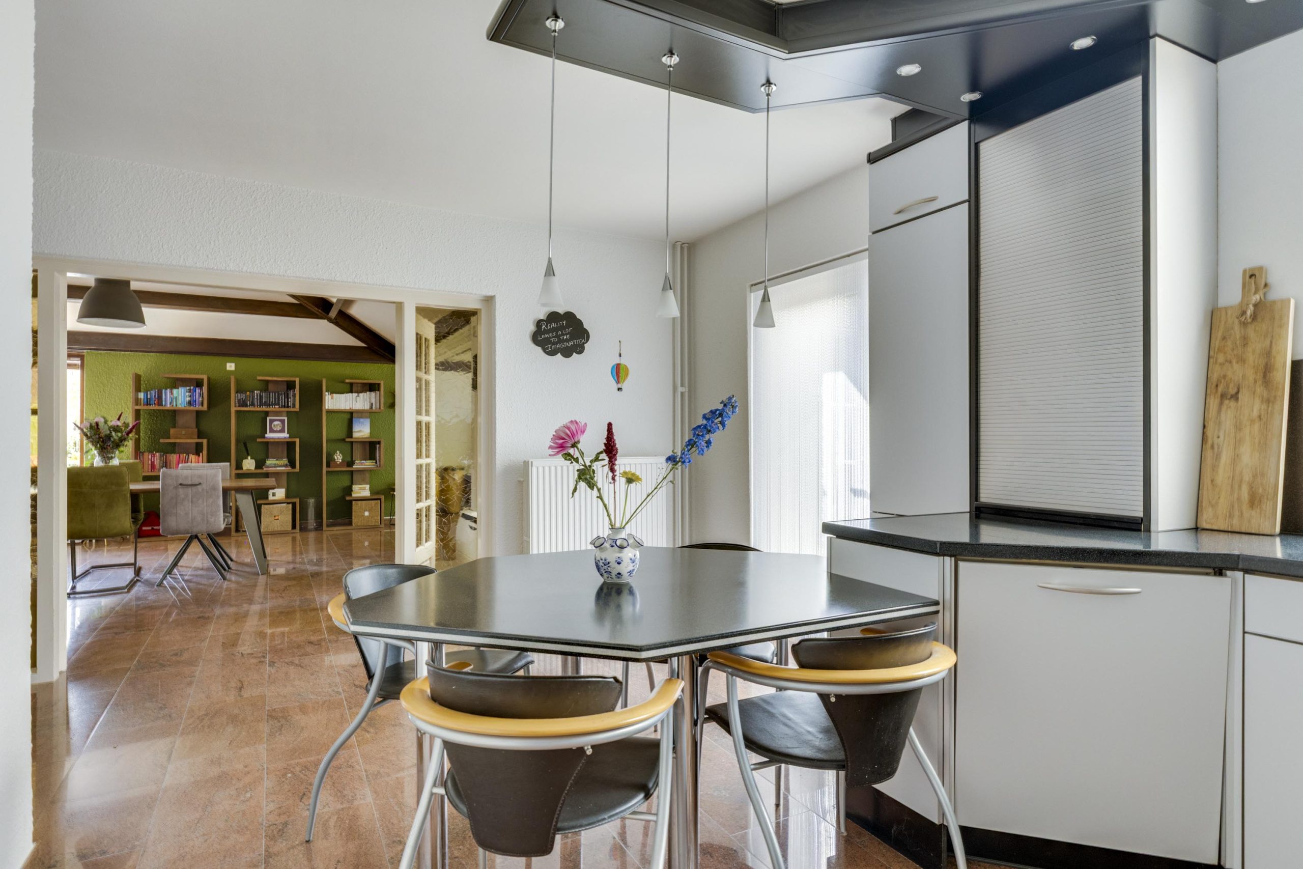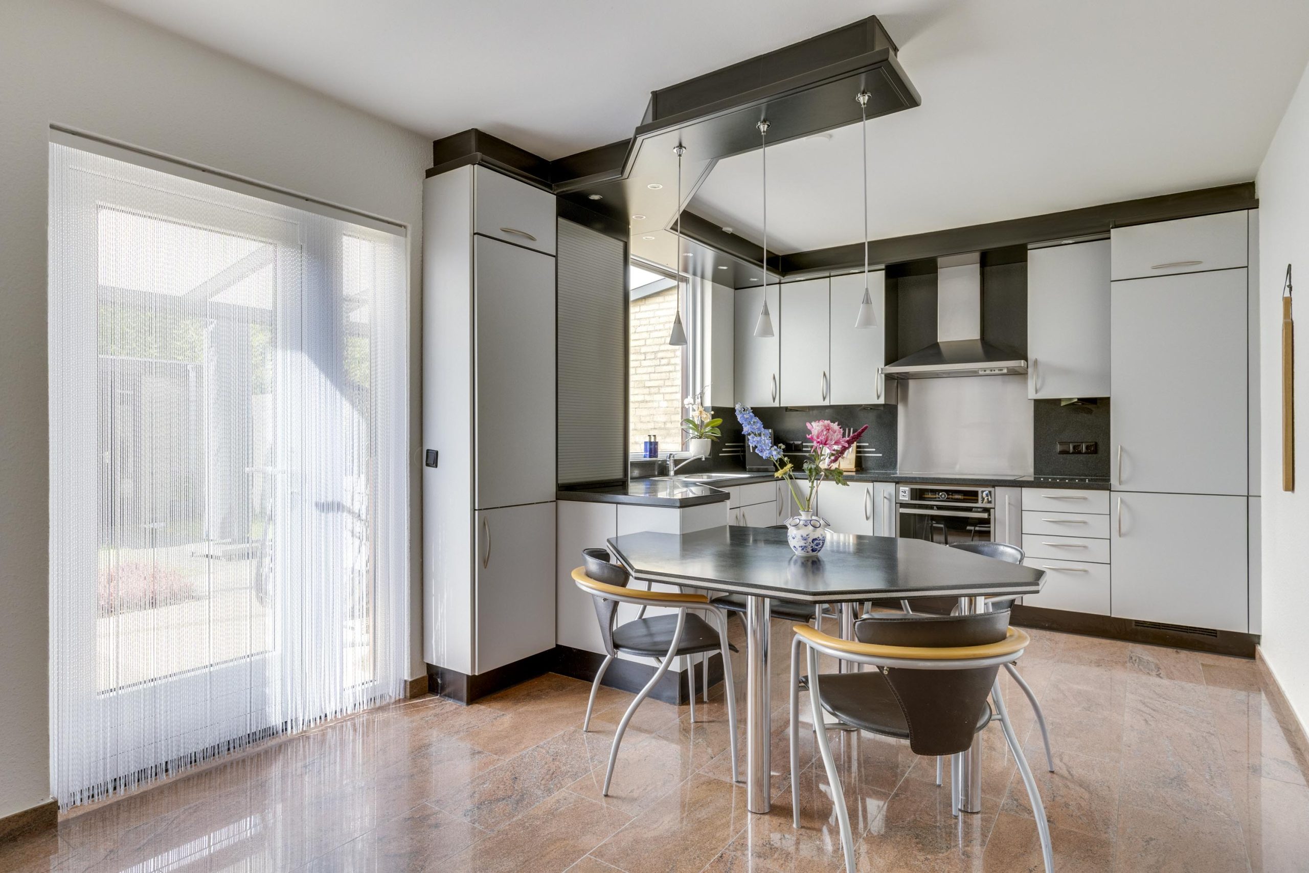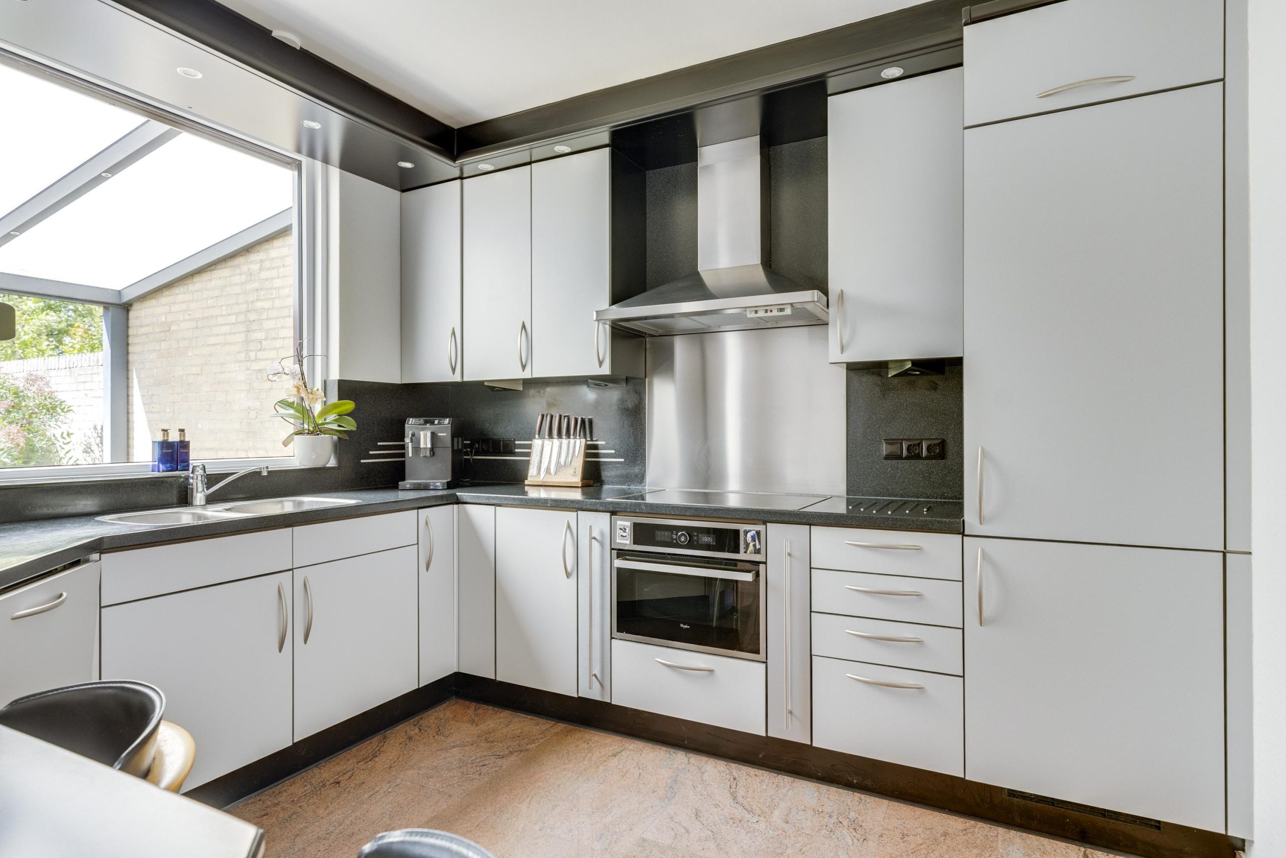 De ruime keuken, ingericht in een U-vorm, combineert lichtgrijze kasten met een modern zwart composiet werkblad. Een extra tafelblad biedt ruimte voor informeel dineren. Grote openslaande deuren verbinden de keuken met de woonkamer, terwijl een ingebouwde schuifdeurkast extra opbergruimte biedt.