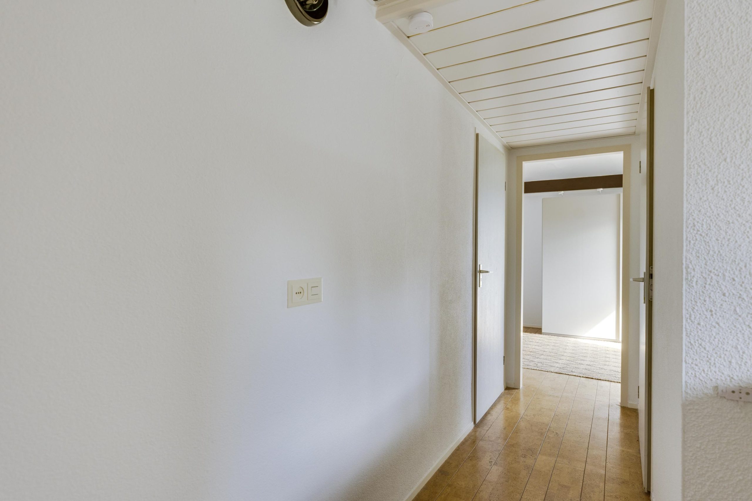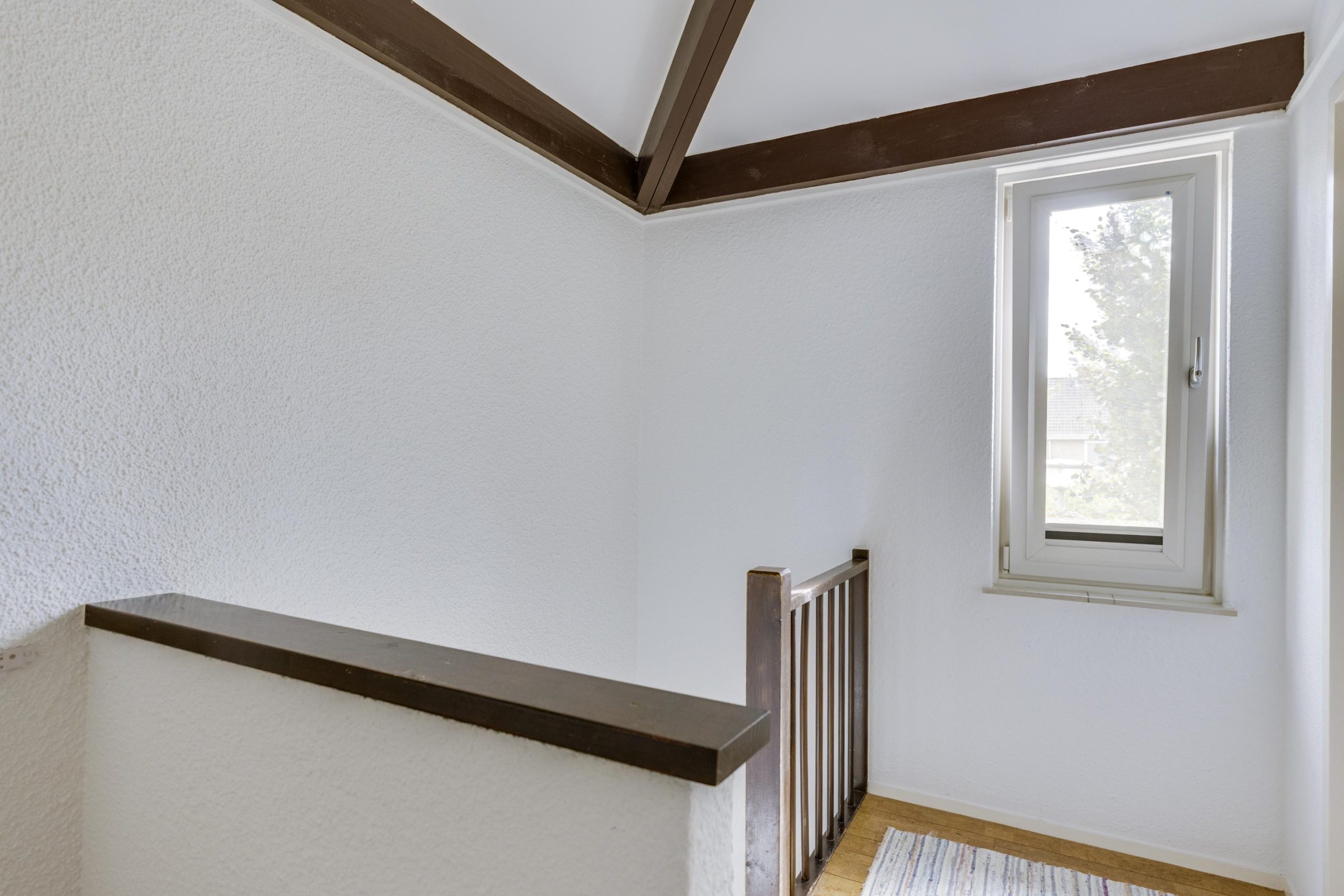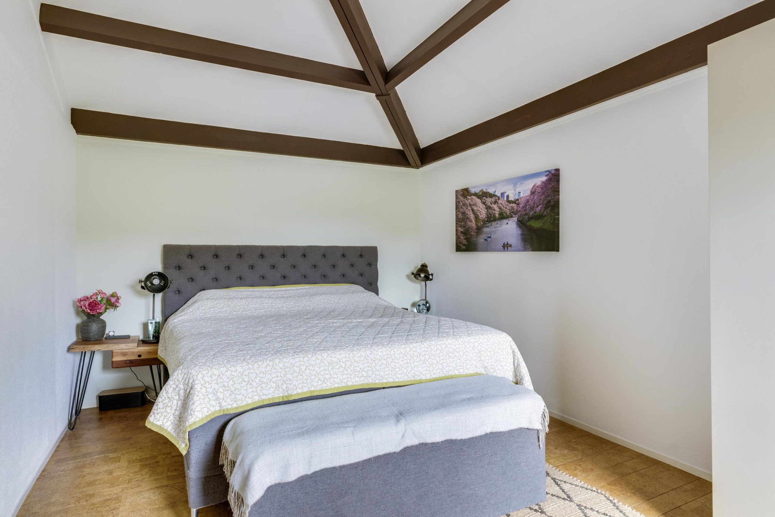 Een open trap vanuit de keuken leidt naar de eerste verdieping, die volledig is afgewerkt met warme, duurzame kurkvloeren. De speelse dakconstructie en hoge balkenplafonds versterken het ruime, luchtige gevoel.