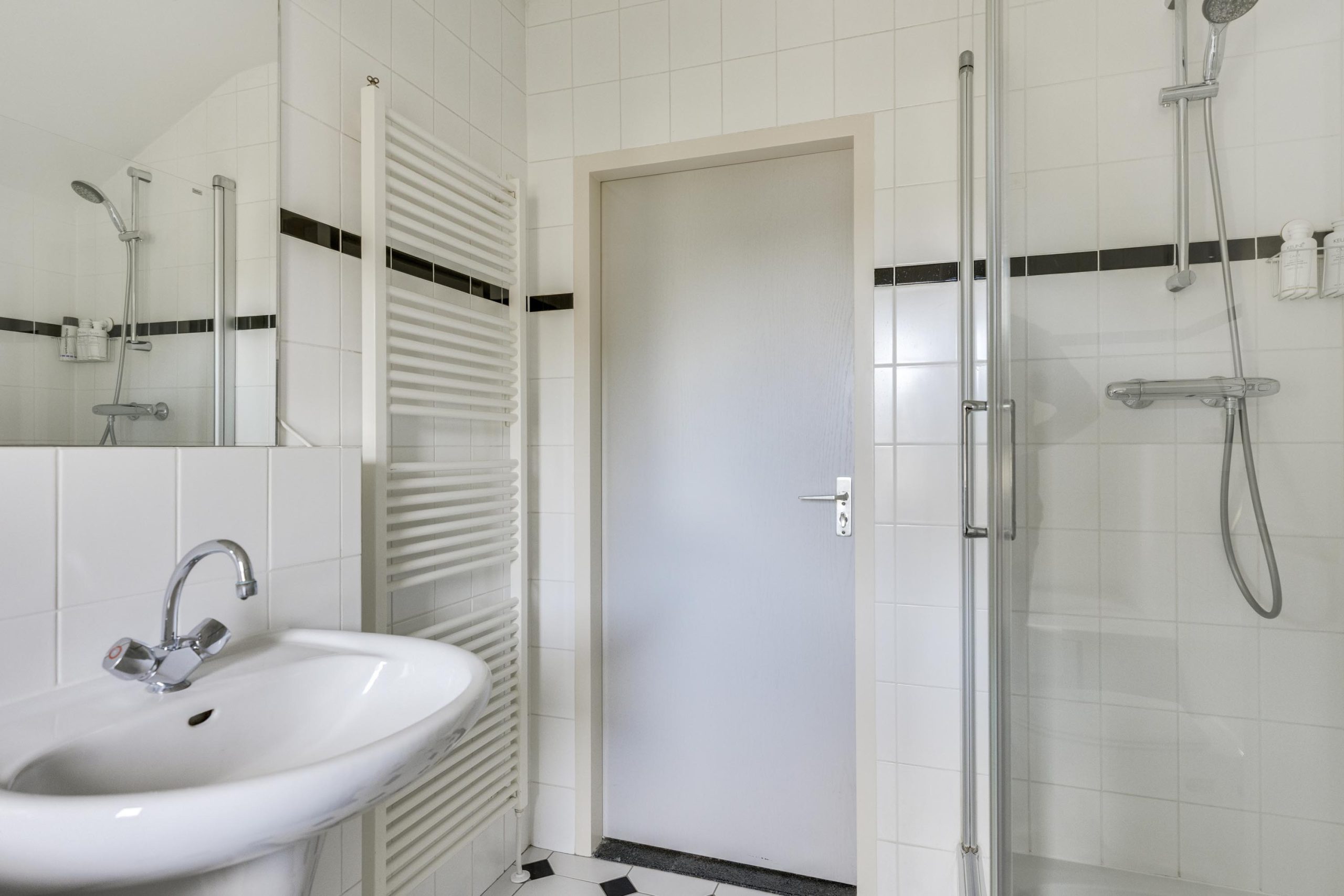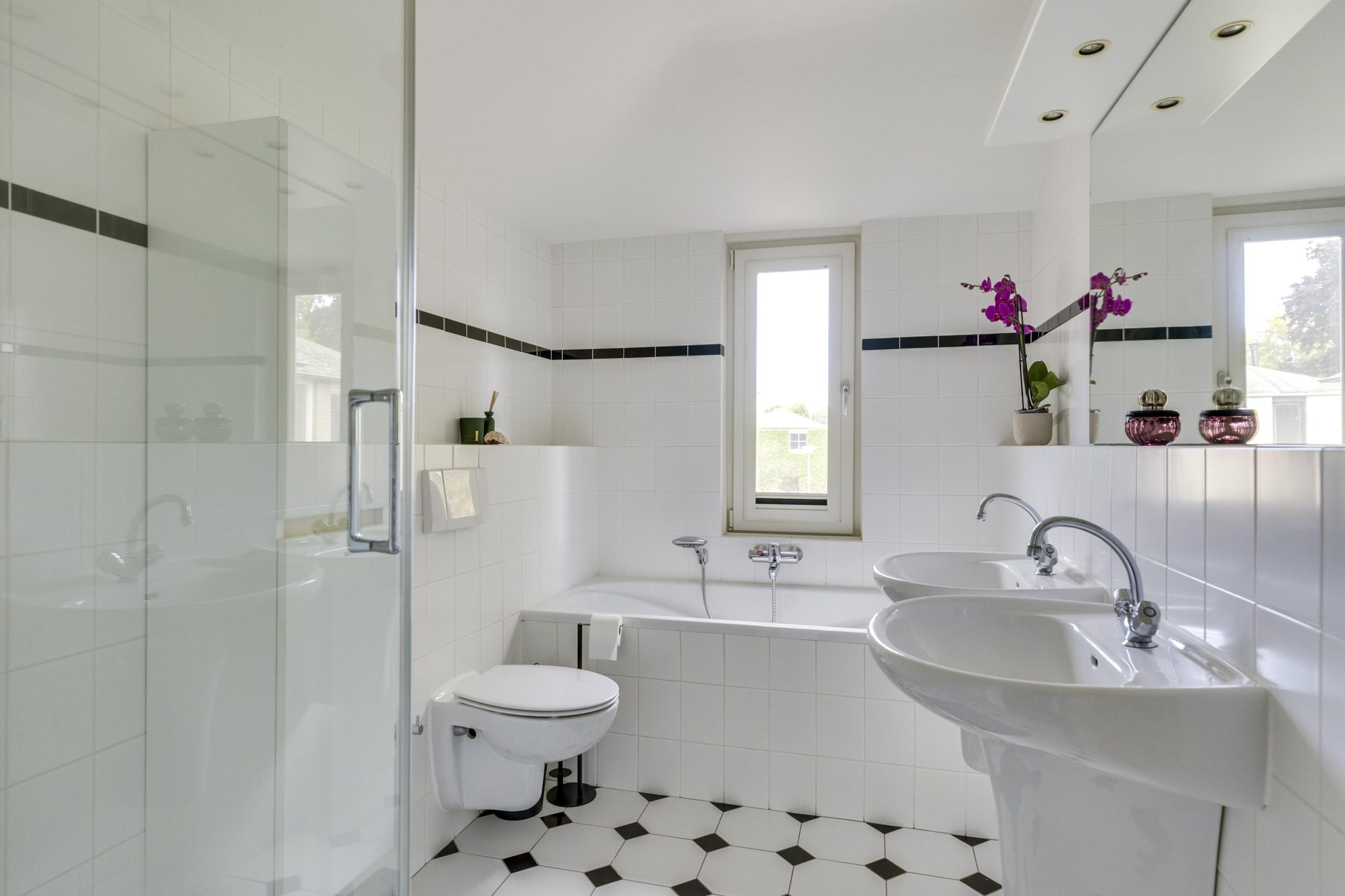 * Badkamer met zwart-witte tegelvloer, twee wastafels, ligbad, inloopdouche, wandtoilet, kiep-draai-raam van PVC, mechanische ventilatie en designradiator