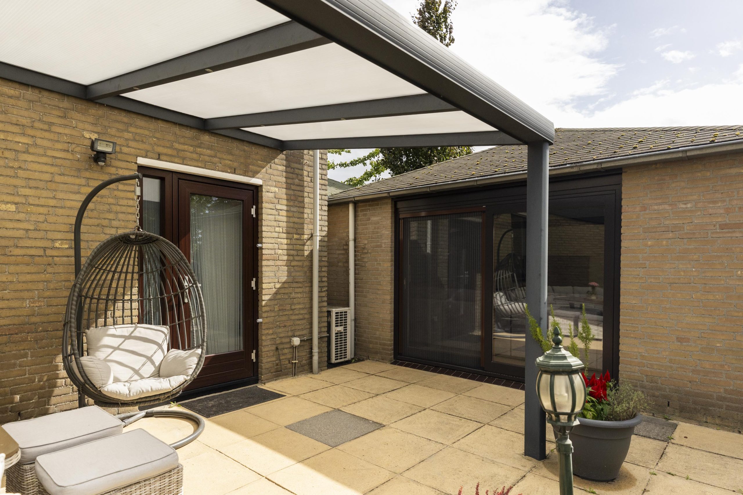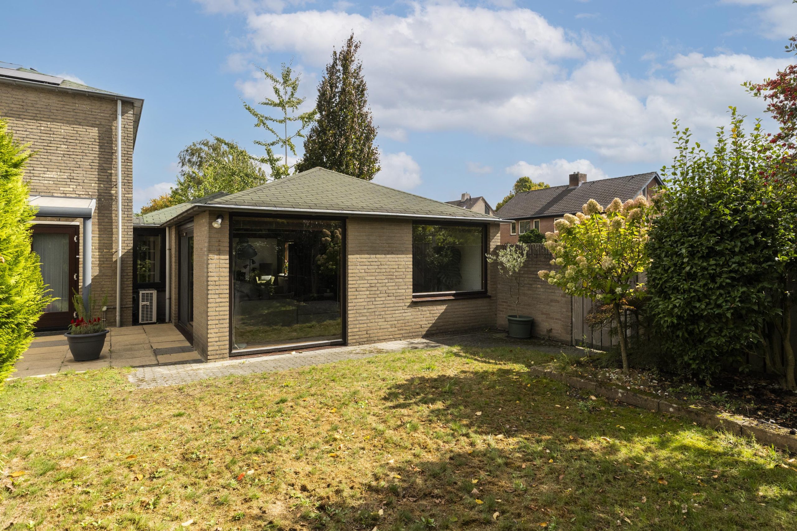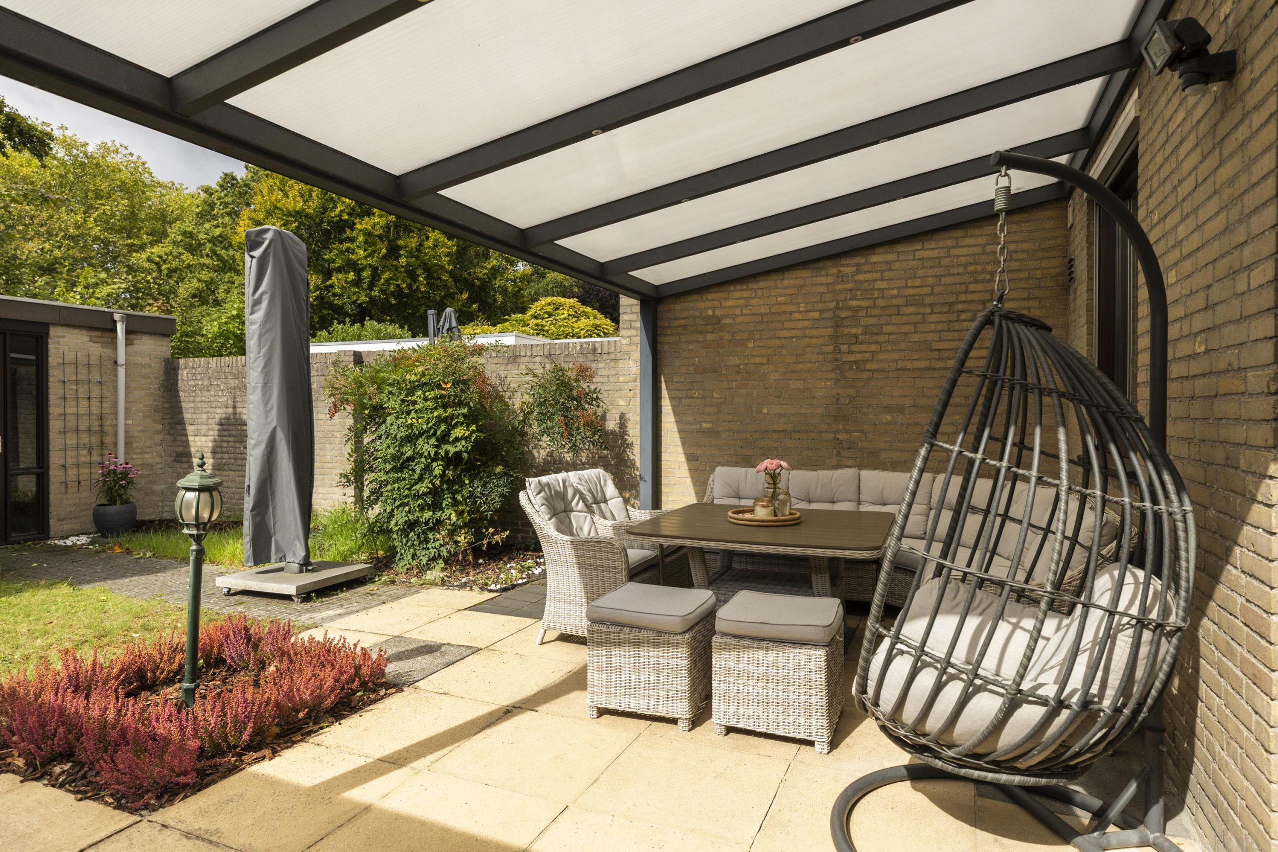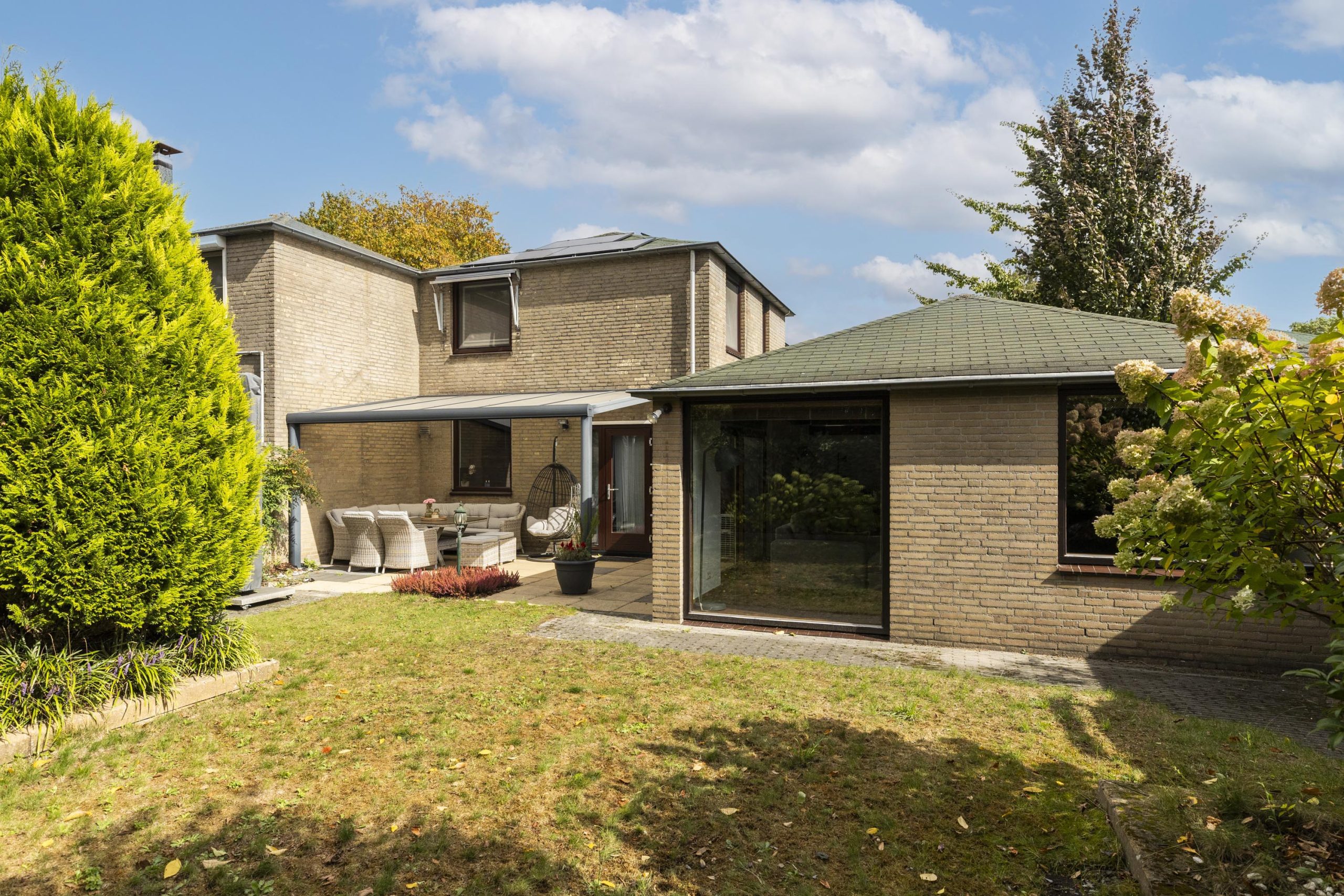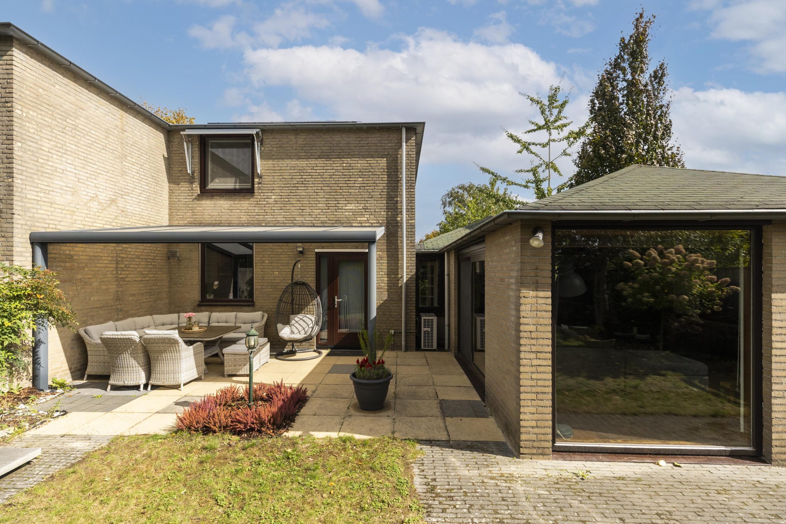 Grote ramen met houten kozijnen aan drie zijden laten veel daglicht binnen en bieden via schuifdeuren een naadloze verbinding met de tuin. Er is voldoende ruimte voor zowel een grote eettafel als een royale zithoek. Dankzij de airconditioning is het hele jaar door comfort gegarandeerd.