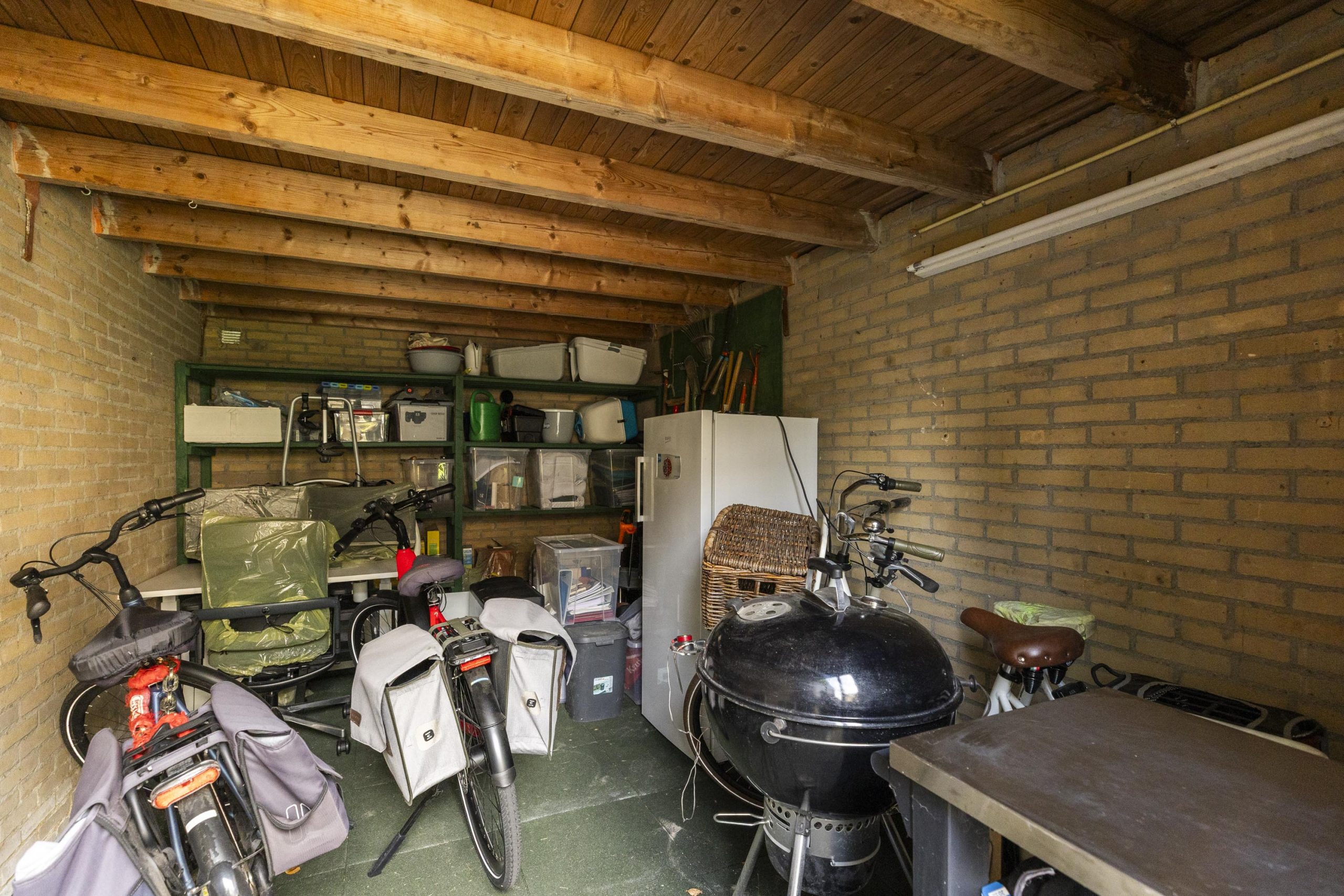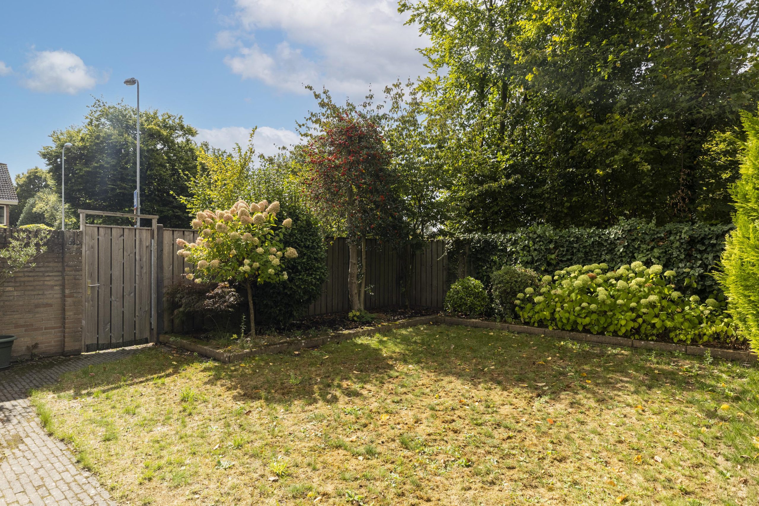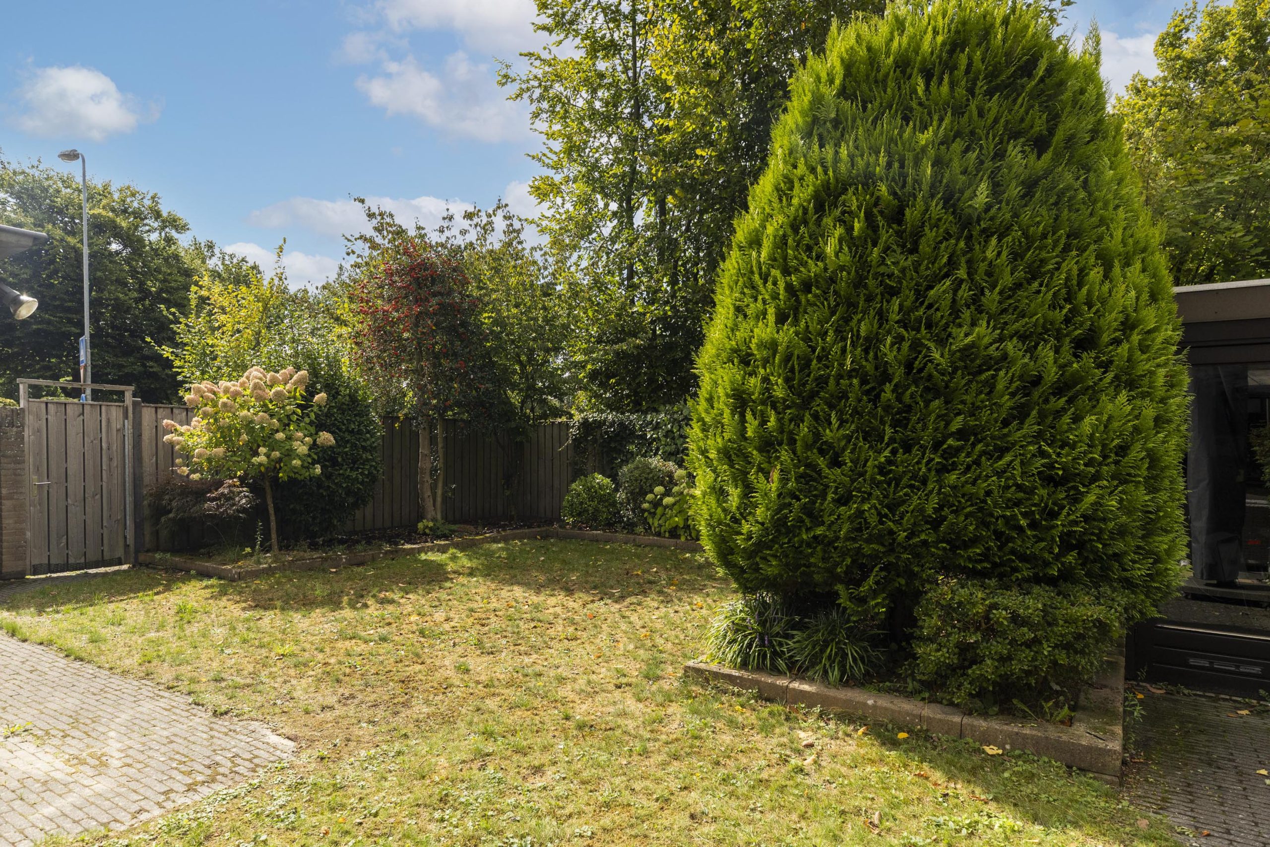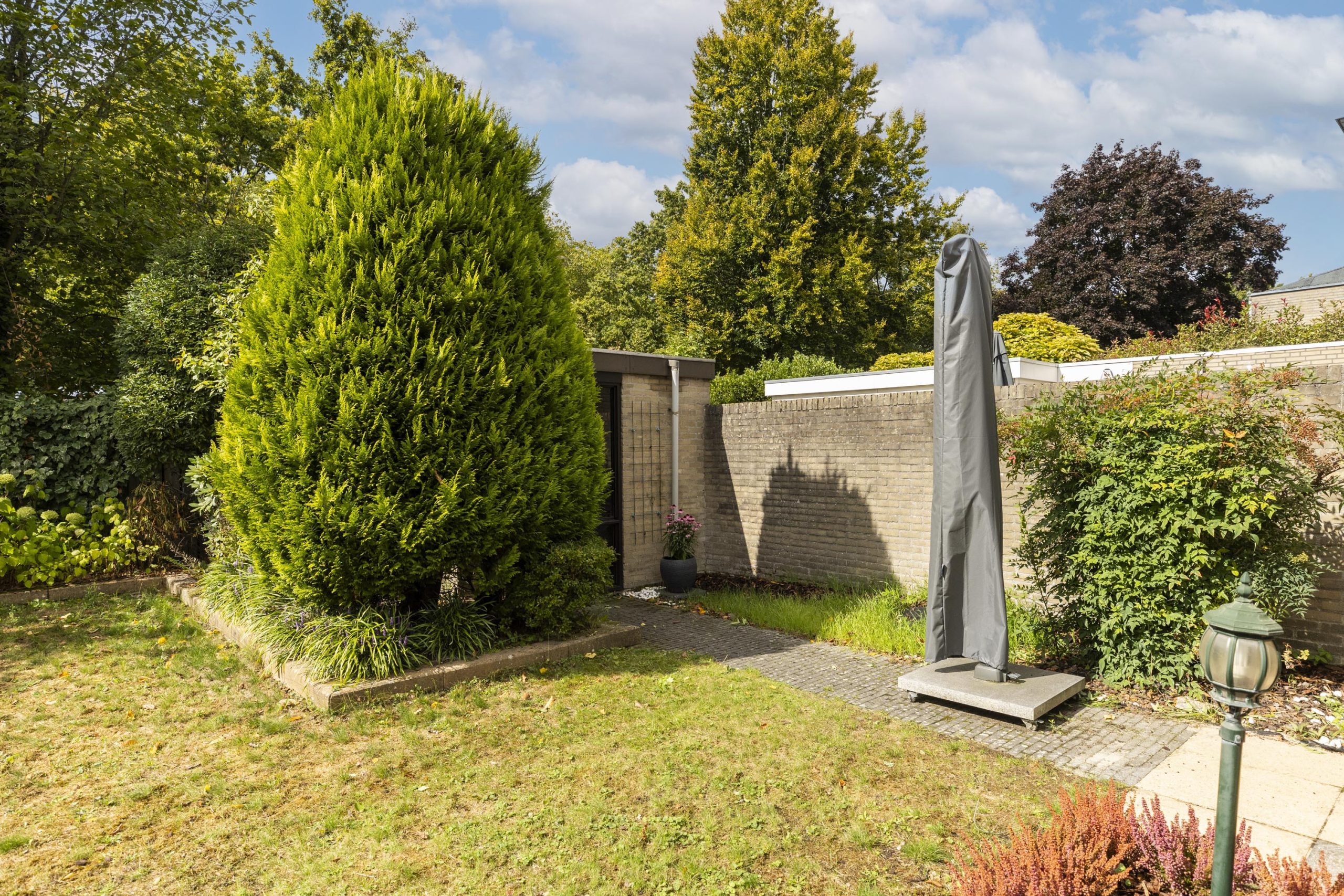 De op het zuidwesten gelegen achtertuin is een groene oase van rust, ideaal voor de middag- en avondzon. Een stevige luifel biedt een beschutte zitplaats, terwijl een gazon en volgroeide struiken een natuurlijke, besloten omgeving creëren. Hier bevindt zich een handige buitenkraan en aan de achterzijde vindt u een ruime stenen schuur met elektriciteit.