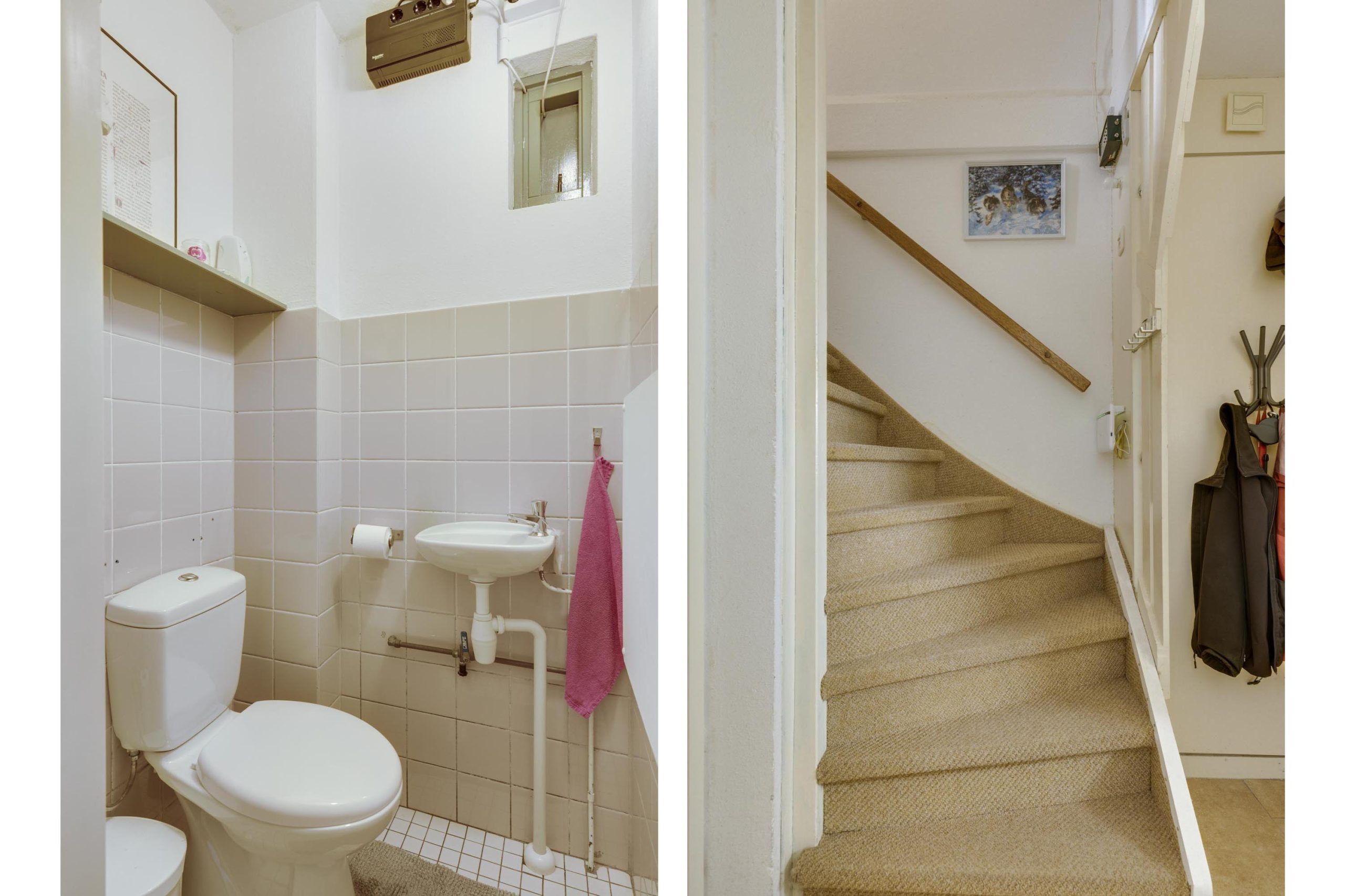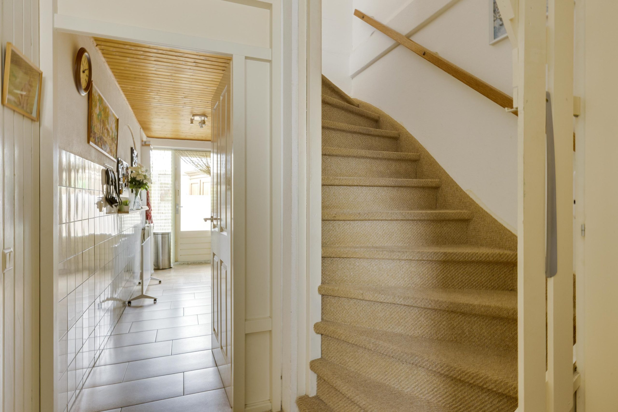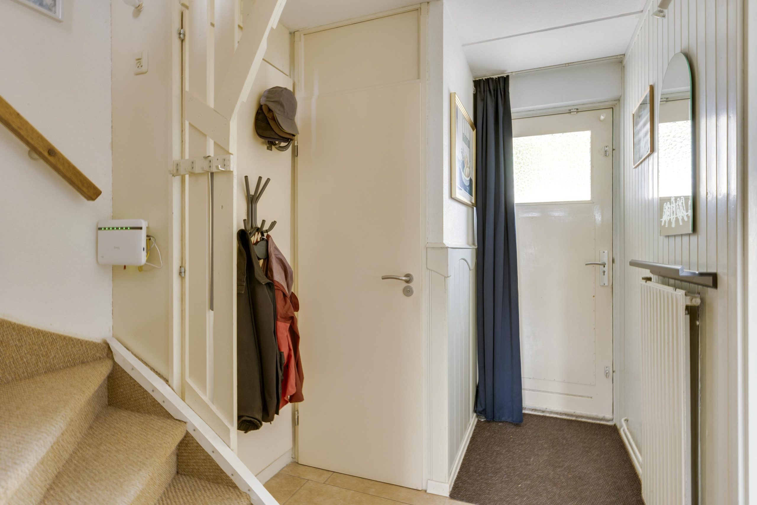 In de hal met tegelvloer vindt u de meterkast met slimme meters, het toilet (gedeeltelijk betegeld, met fonteintje en kiepraam) en de beklede trapopgang naar de verdieping.