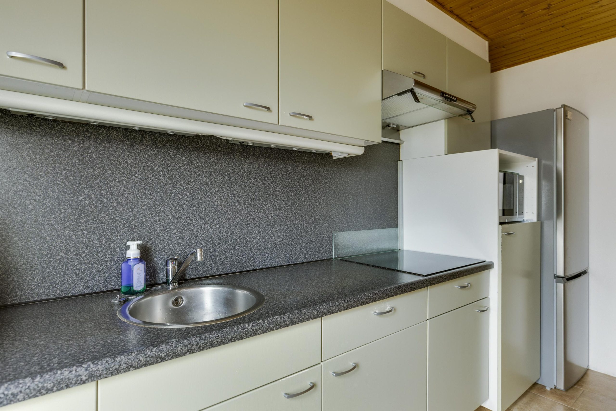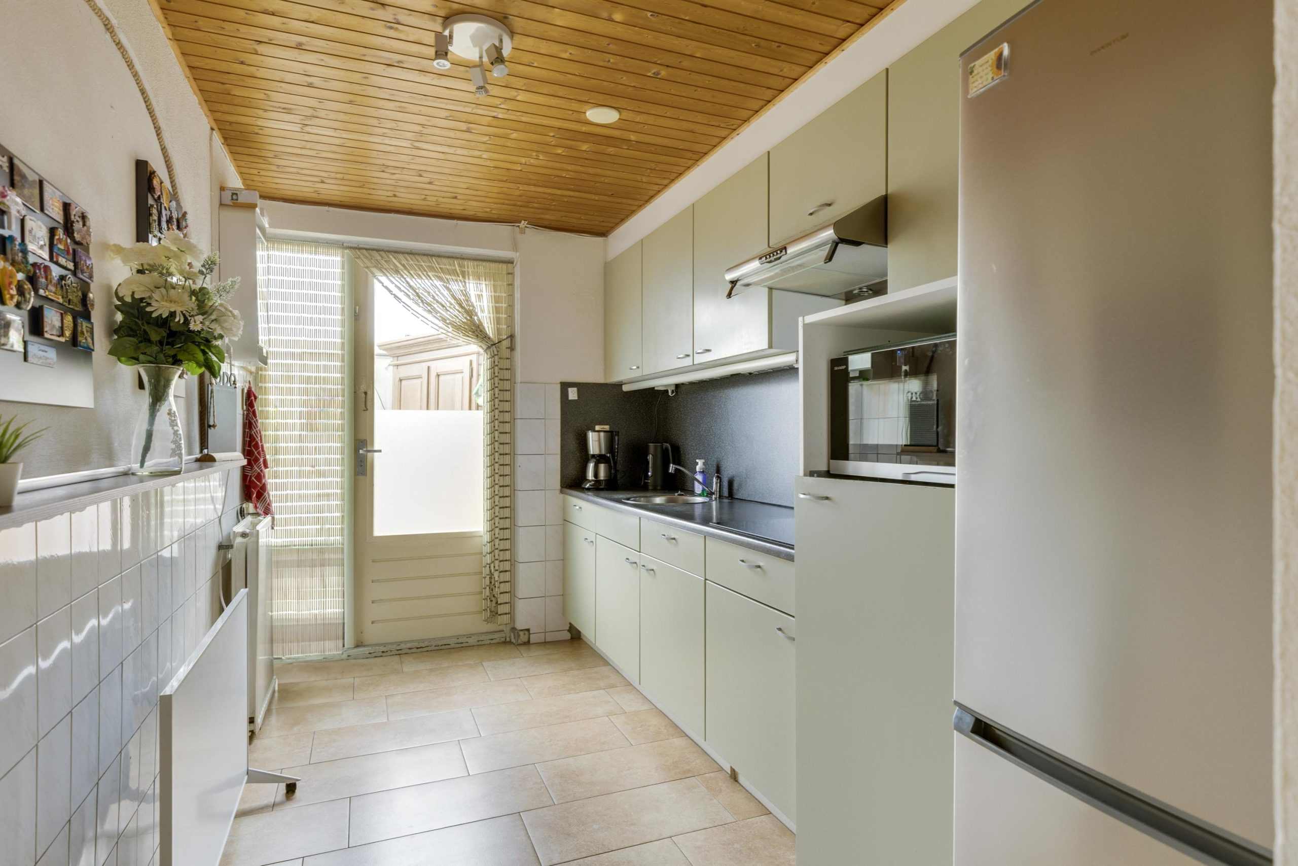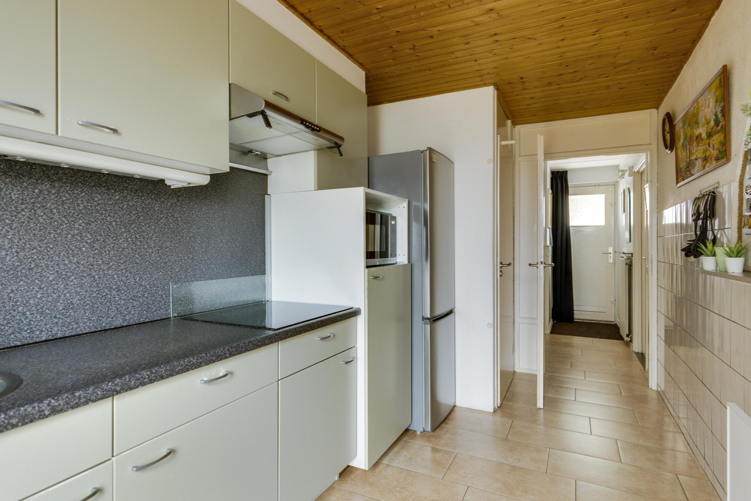 De keuken aan de rechter achterzijde van de woning is in een rechte opstelling en is voorzien van een donker kunststof werkblad, spoelbak, inductiekookplaat (2020), afzuigkap en lichte onder- en bovenkastjes. Onder de trap bevindt zich een praktische voorraadkast. De oorspronkelijke keuken lag aan de voorzijde, dus verplaatsen behoort tot de mogelijkheden.