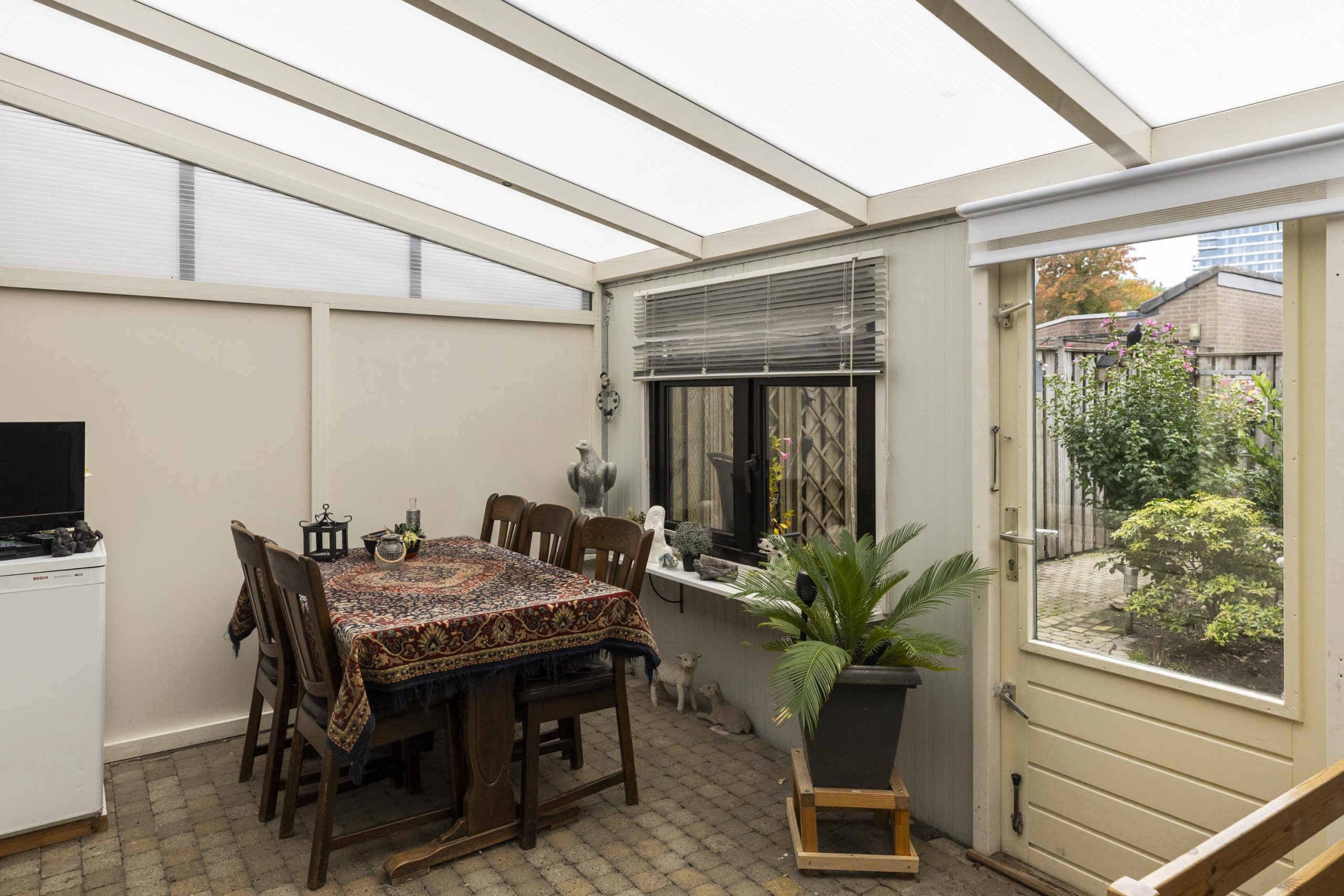Aan de achterzijde bevindt zich de aangebouwde serre/tuinkamer met inbouwspots, openslaande deuren met rolluiken en een buitendeur naar de tuin, een heerlijke plek om het hele jaar door van het buitengevoel te genieten.